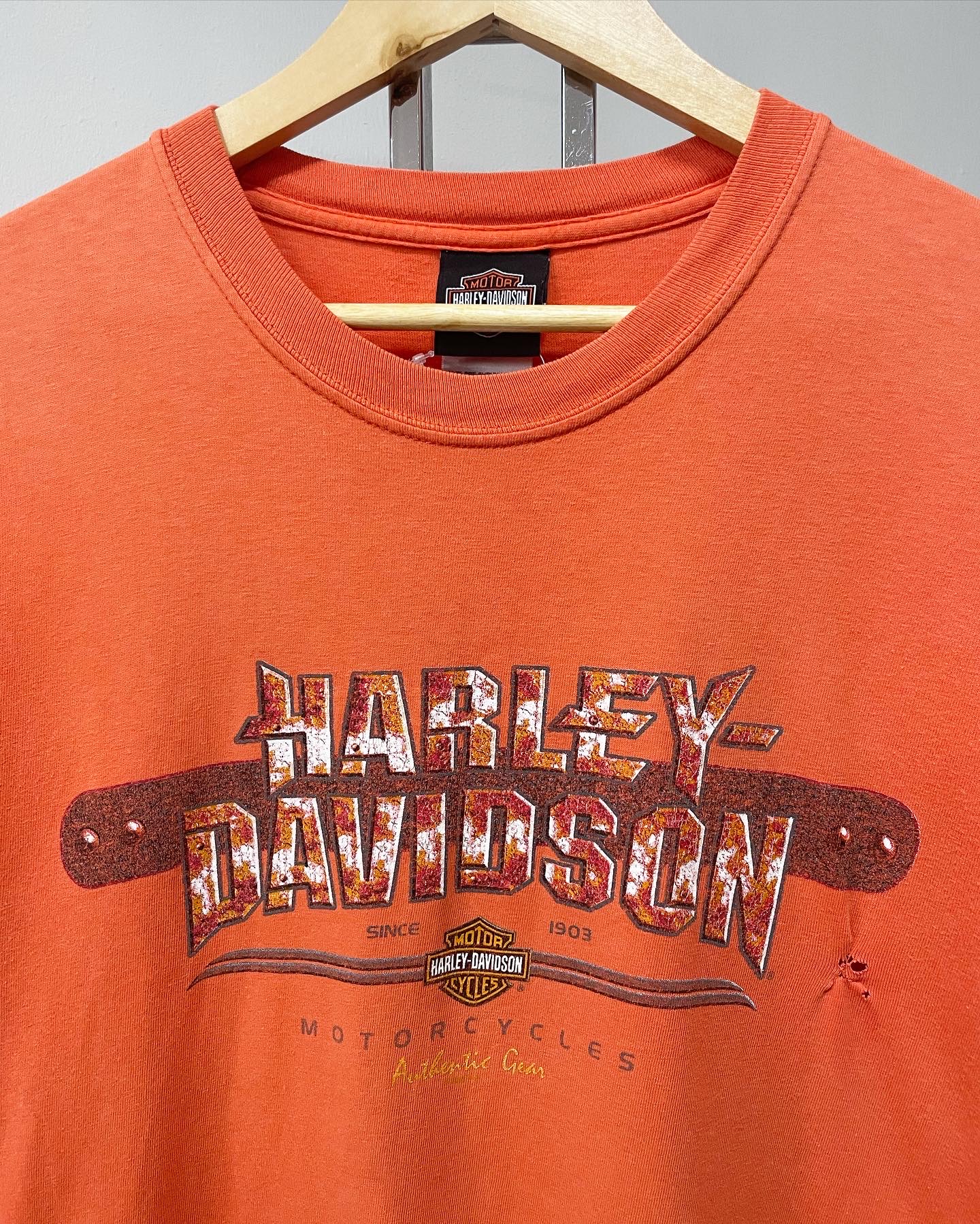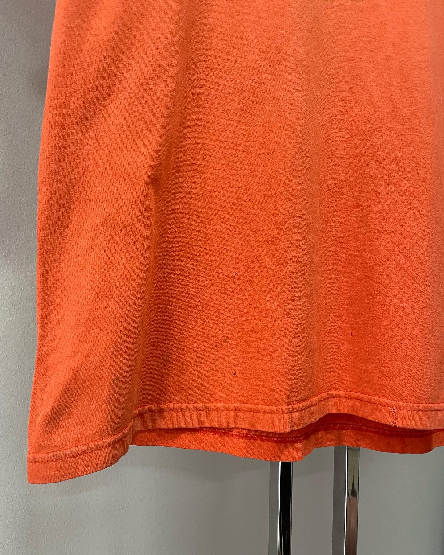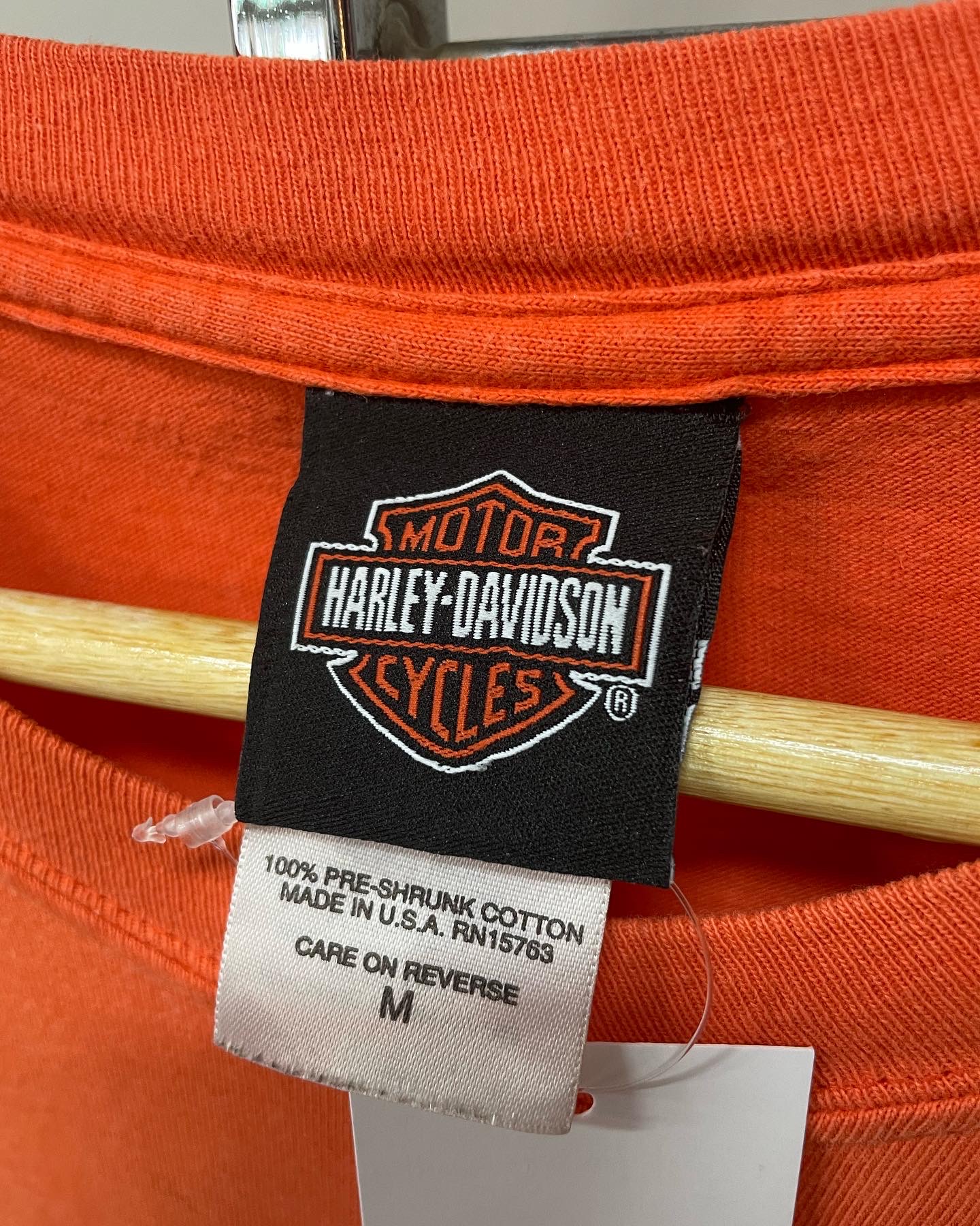 할리데이비슨 오리지날 made in USA 생산 빈티지 티셔츠입니다. 멋스러운 오렌지 컬러와 프린팅이 매력적이며 앞면 핀홀 데미지 존재 하며 빈티지한 느낌으로 착용하기 좋겠습니다. 실측 95-100 정도 되는 사이즈감입니다.