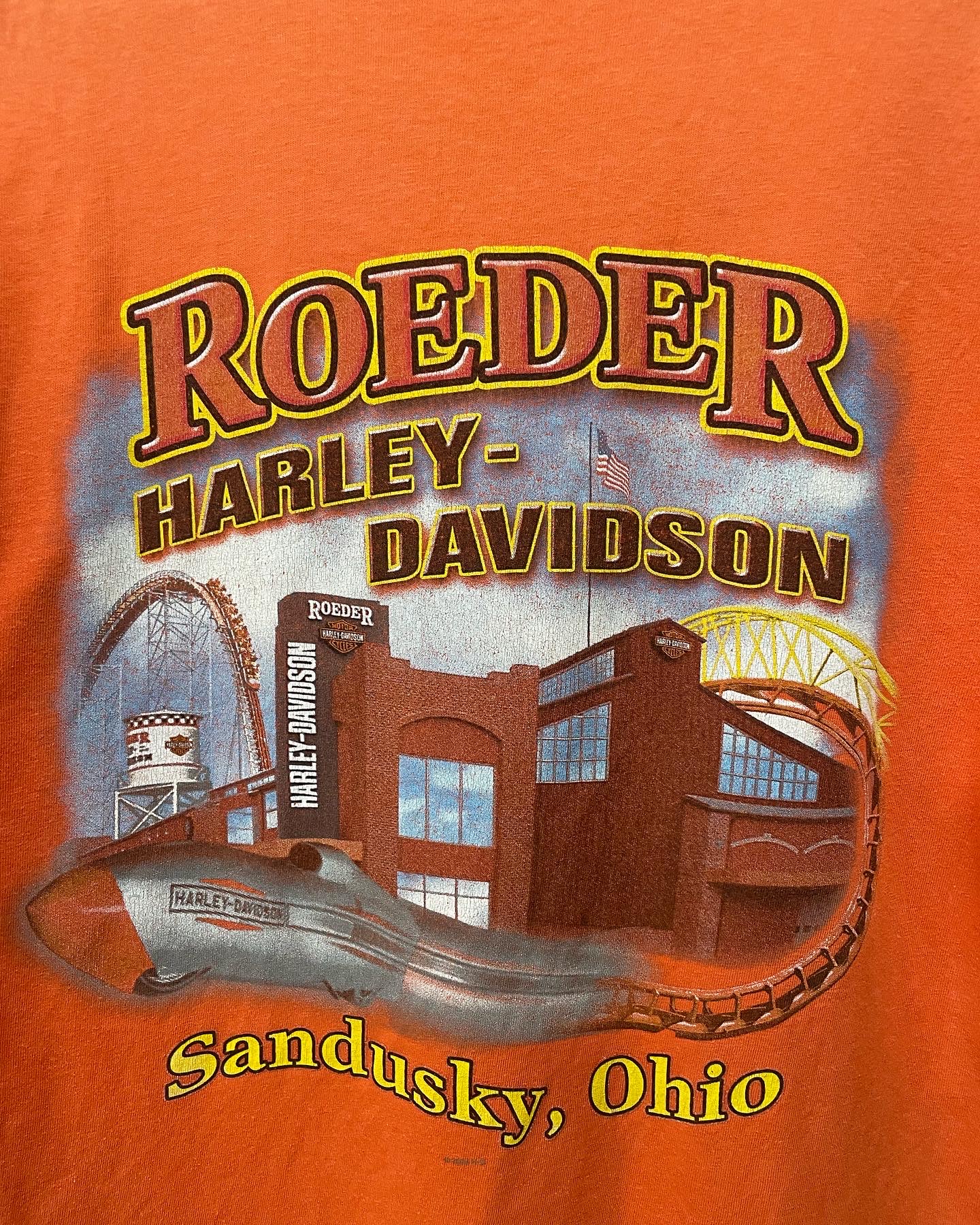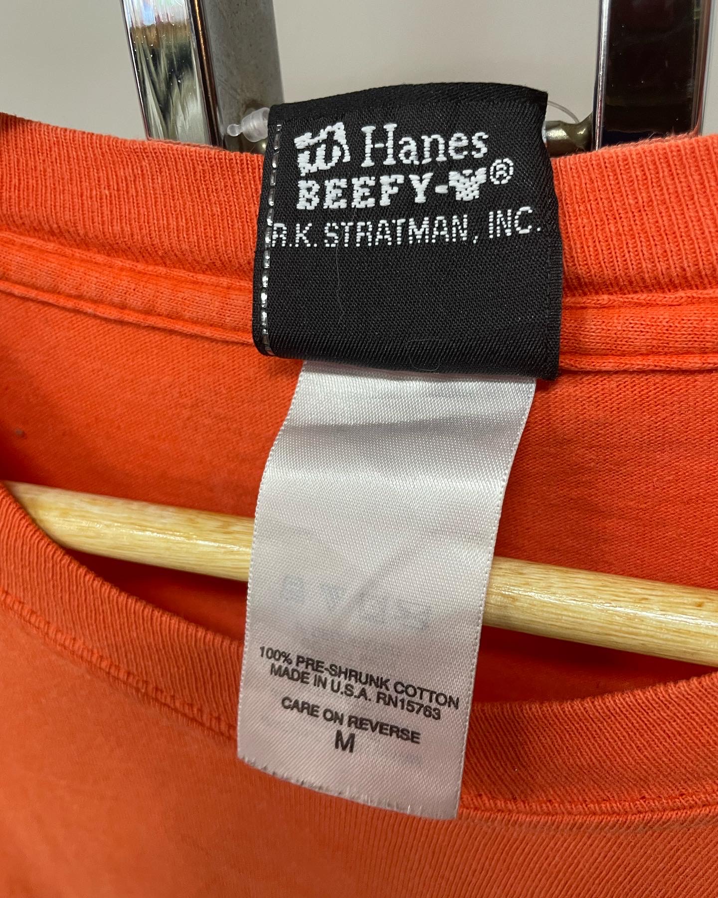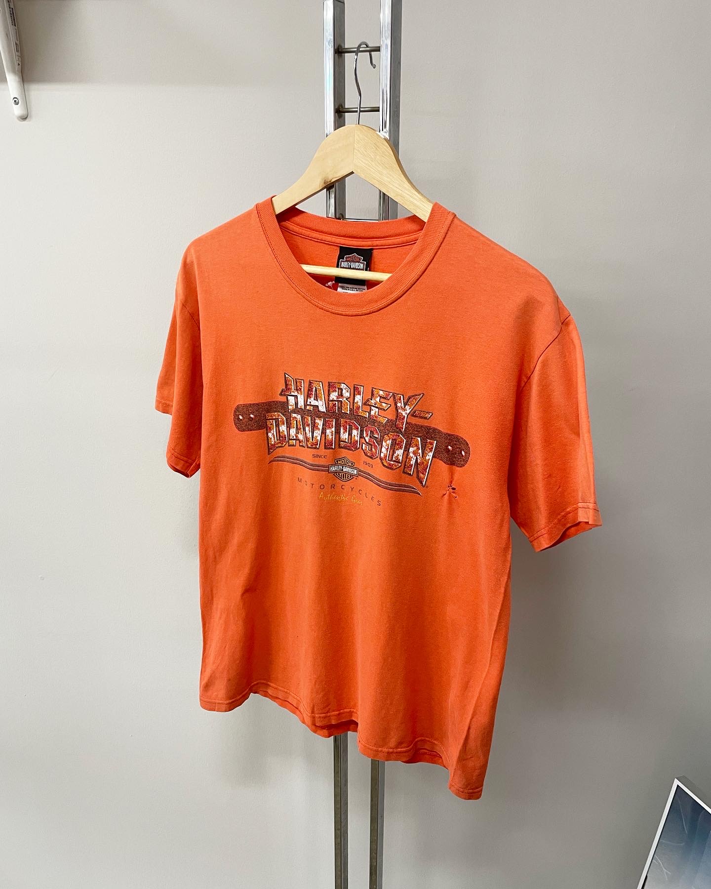 할리데이비슨 오리지날 made in USA 생산 빈티지 티셔츠입니다. 멋스러운 오렌지 컬러와 프린팅이 매력적이며 앞면 핀홀 데미지 존재 하며 빈티지한 느낌으로 착용하기 좋겠습니다. 실측 95-100 정도 되는 사이즈감입니다.
