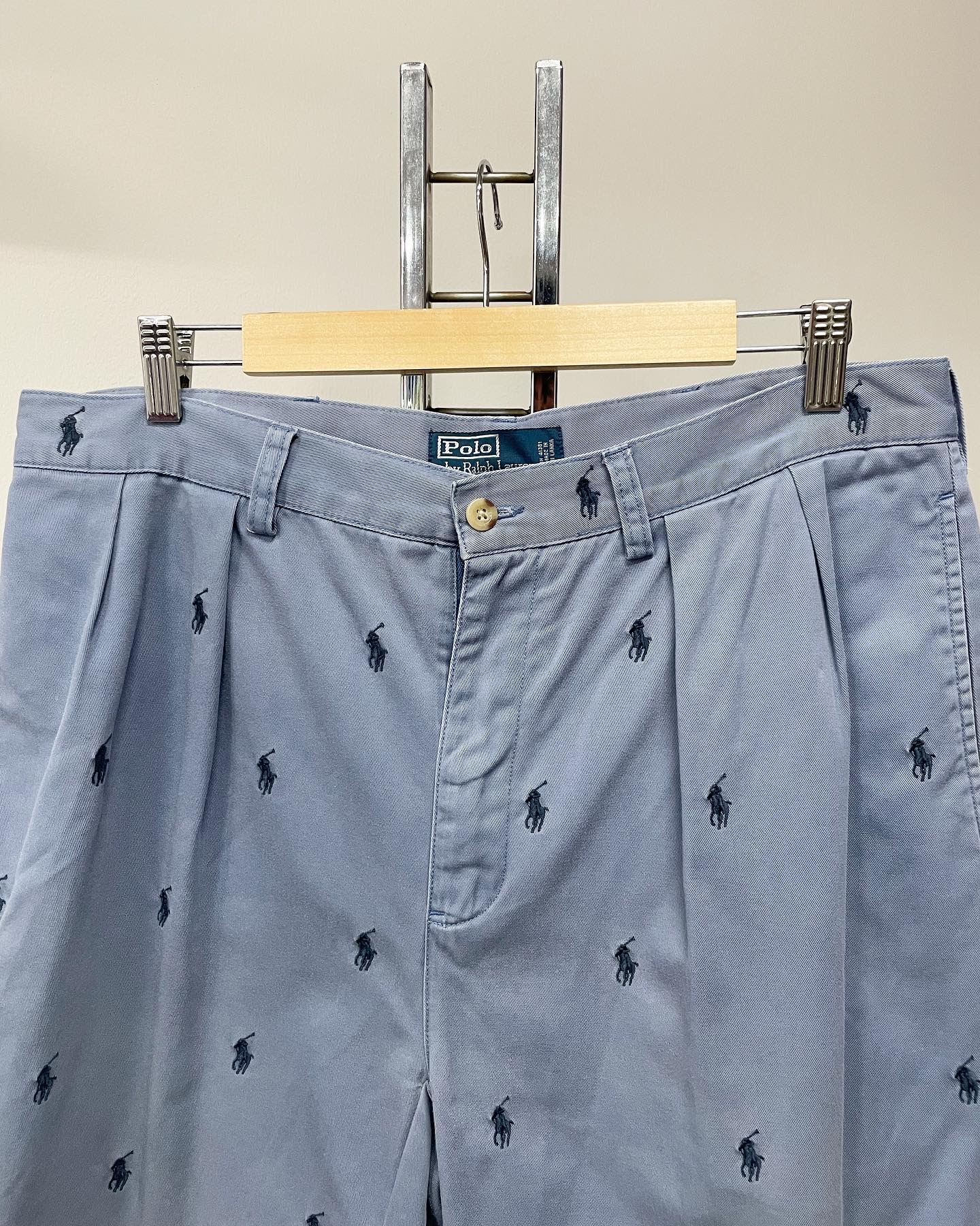 90년대 폴로랄프로렌 타일러 쇼츠 반바지입니다. 빈티지란 블루 컬러와 멀티 포니가 매우 매력적이며 투플리츠 디테일이 들어가 여유로운 실루엣이 인상적인 제품입니다. 사용감 외 하자 및 데미지 없는 컨디션이며 실측 34 정도 되는 사이즈감입니다.