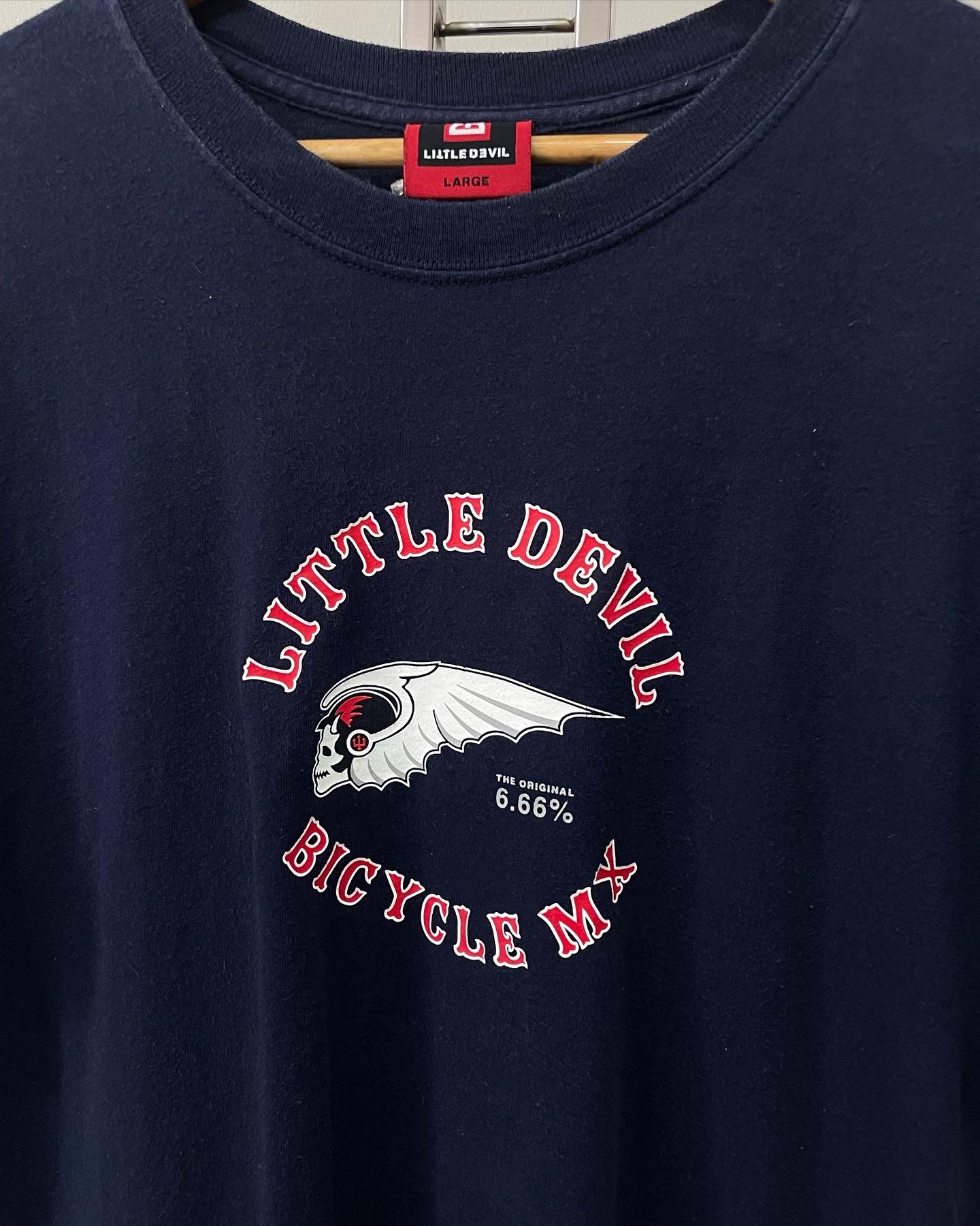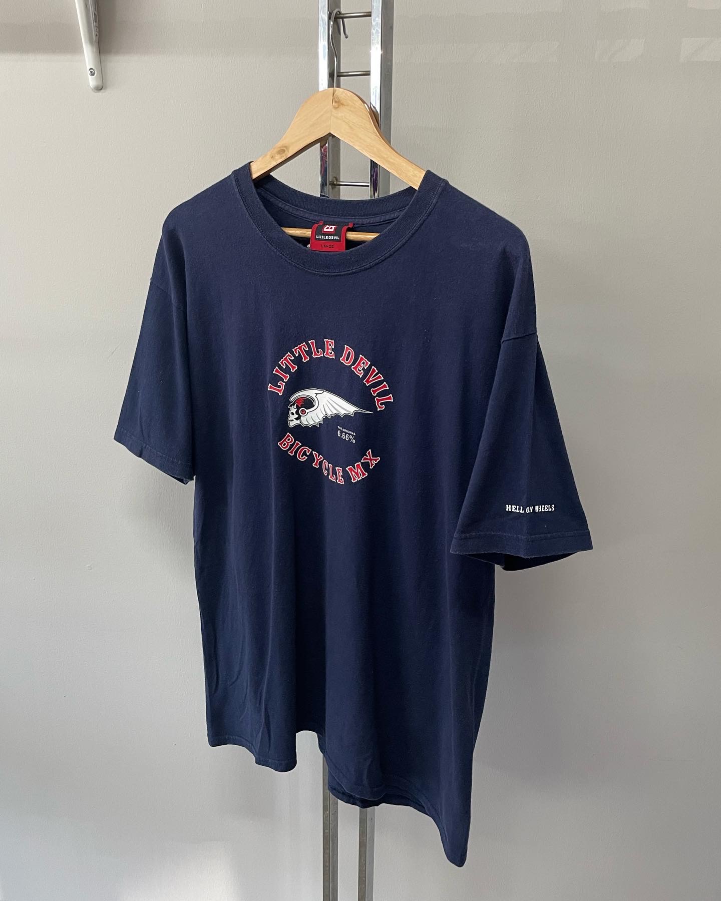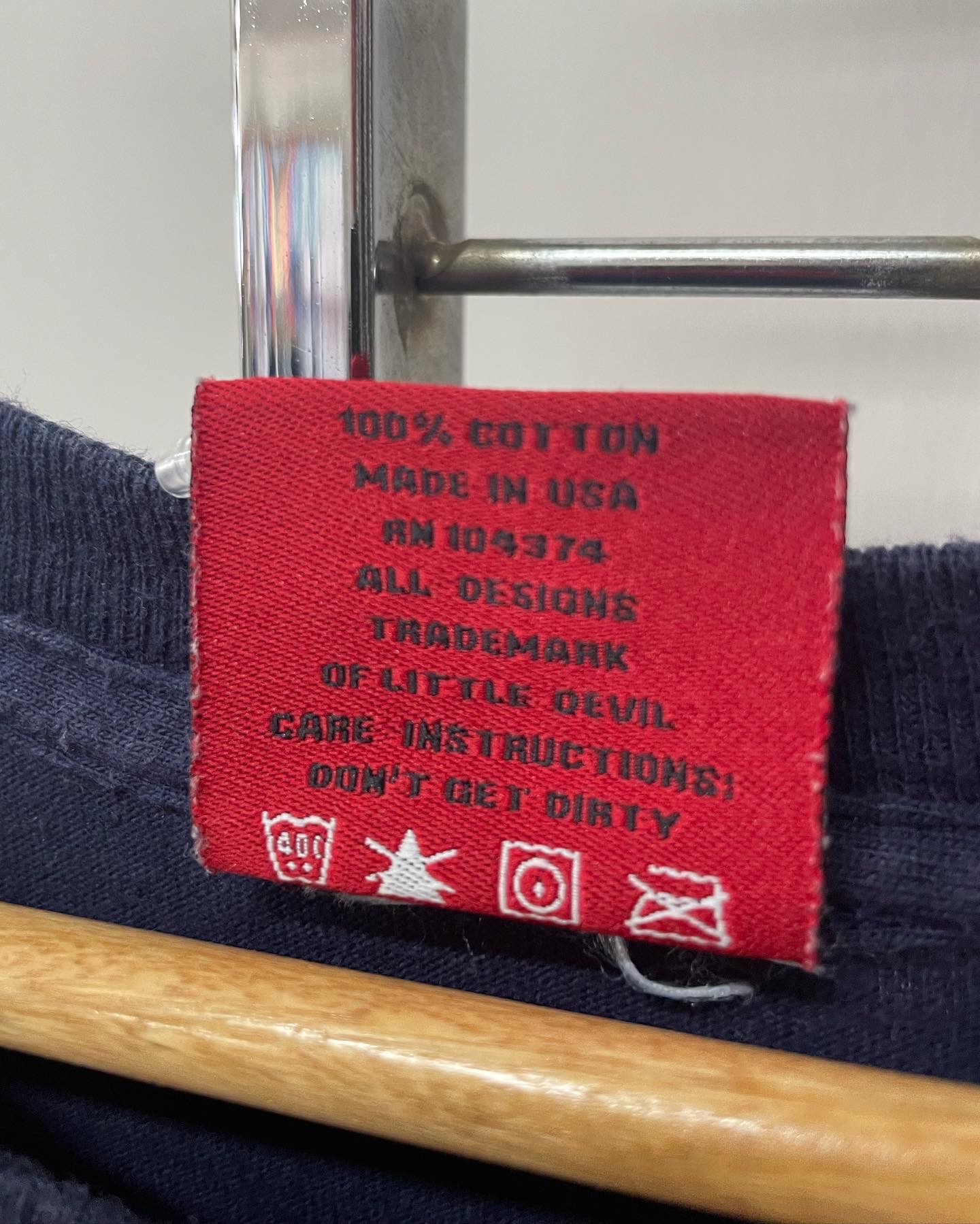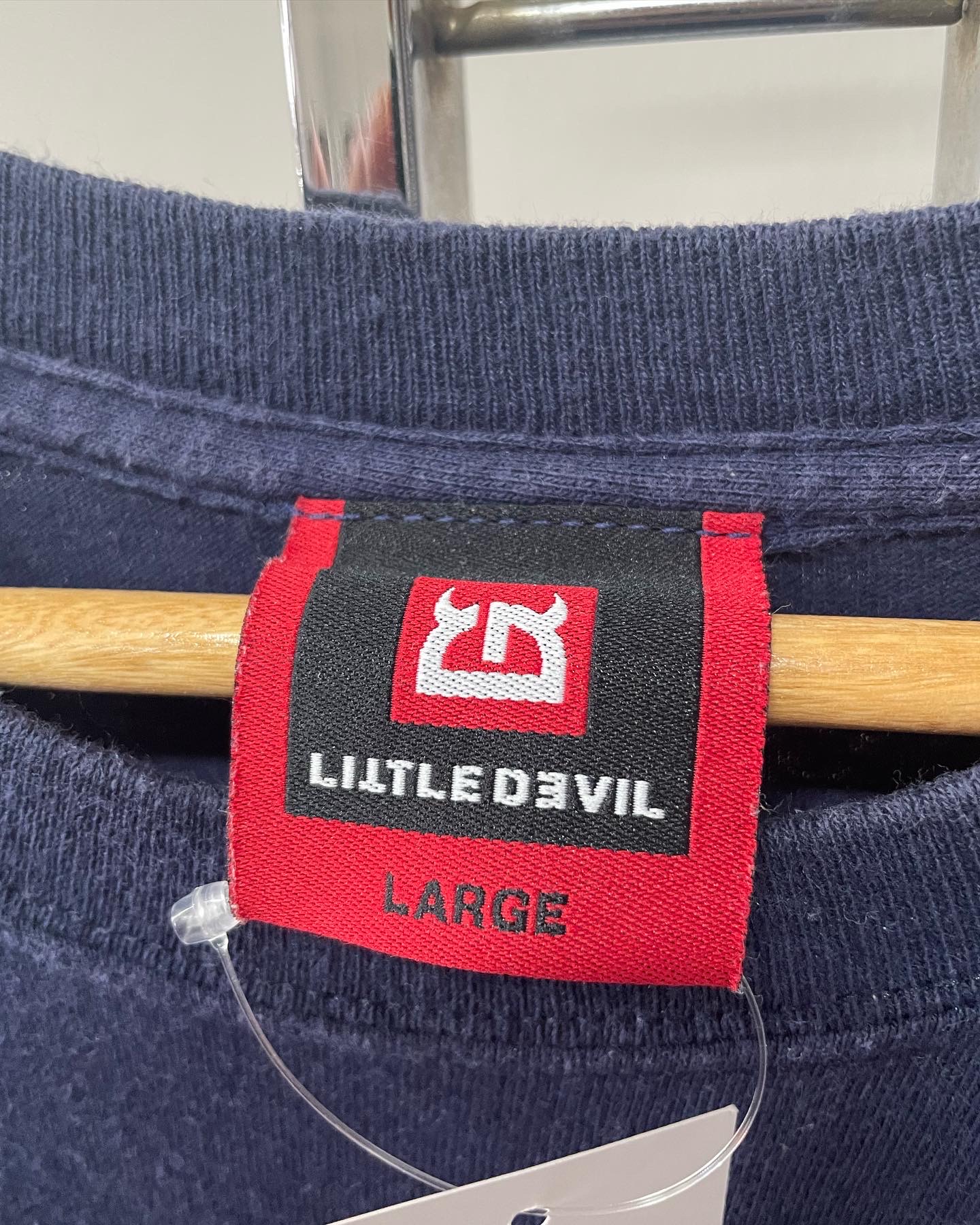 90년대 미국 모터사이클 브랜드 리틀데빌의 빈티지 티셔츠입니다. 미국 생산 제품으로 네이비 컬러와 심볼 프린팅이 매우 매력적이며 하자 및 데미지 없는 양호한 컨디션입니다. 실측 105 정도 되는 사이즈감입니다.