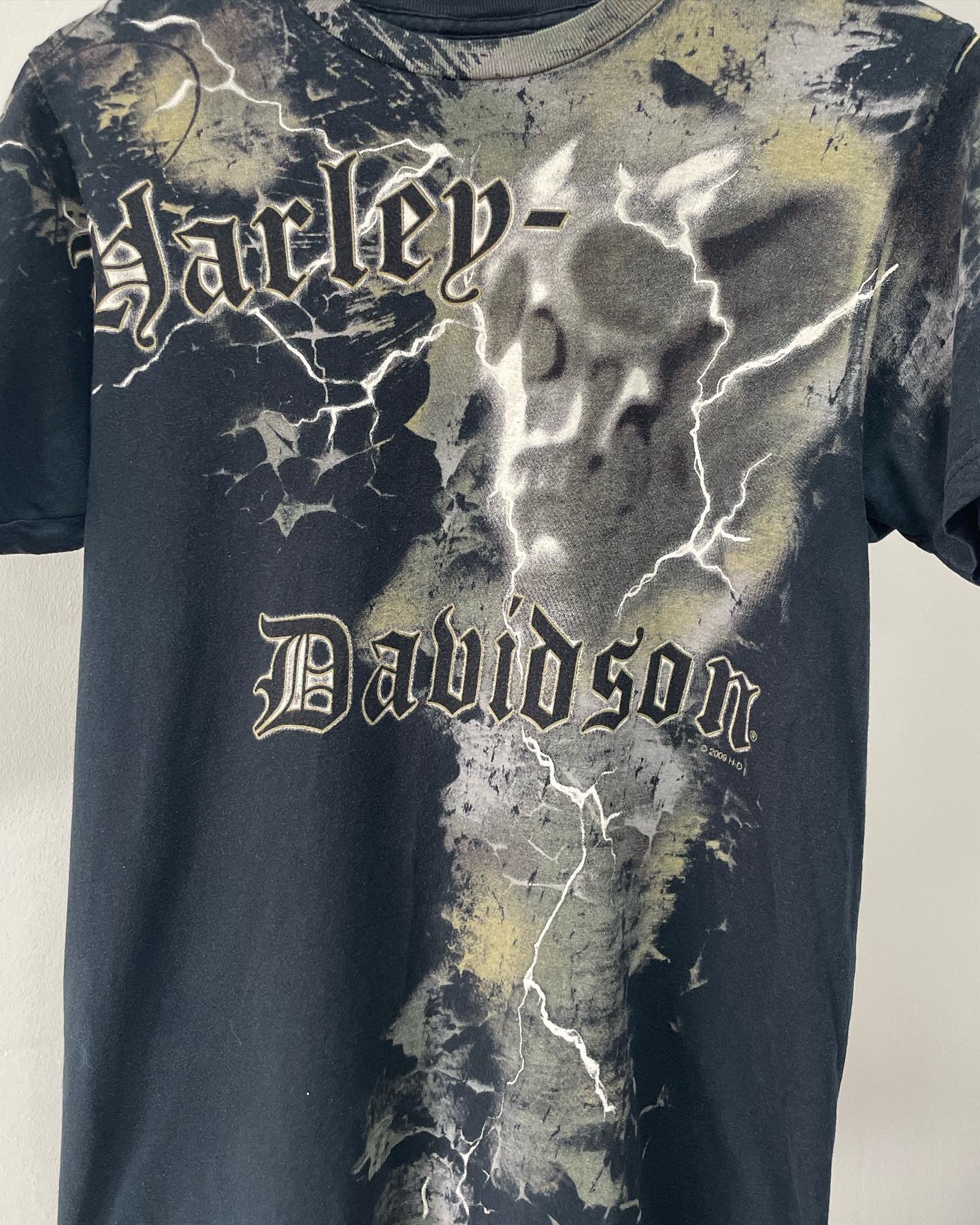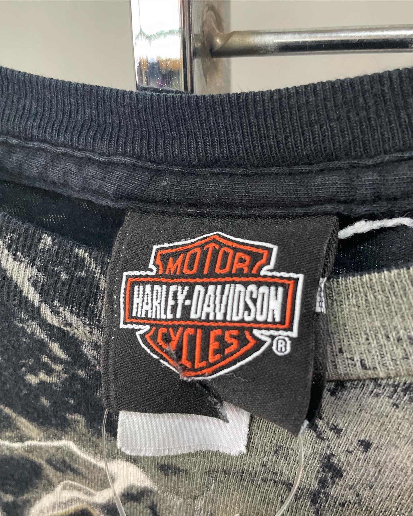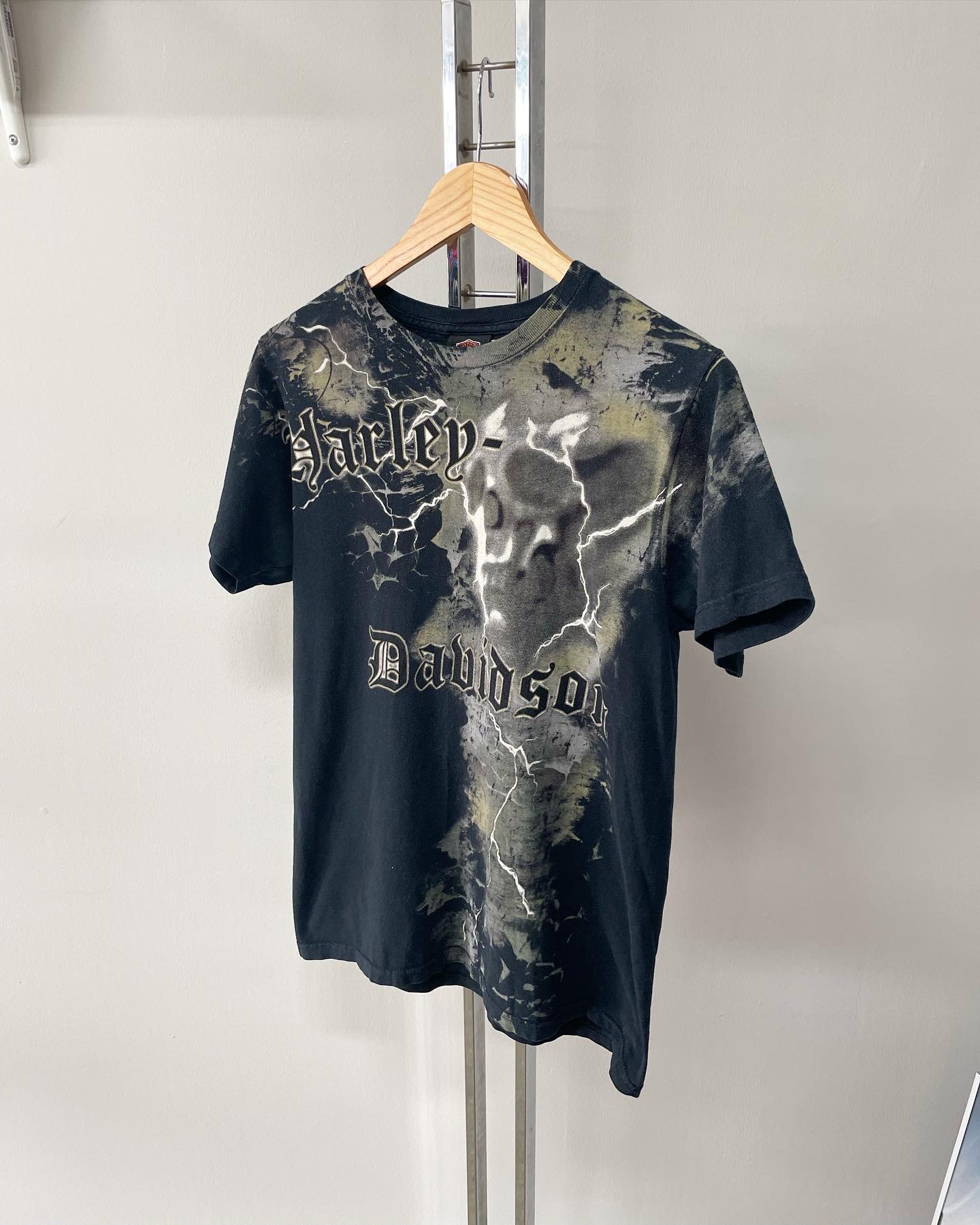 할리 데이비슨 오리지날 빈티지 티셔츠입니다. 멋스러운 라이트닝 스컬 프림팅이 매우 매력적이며 하자 및 데미지 없는 양호한 컨디션입니다. 실측 90-95 정도 되는 사이즈감입니다.