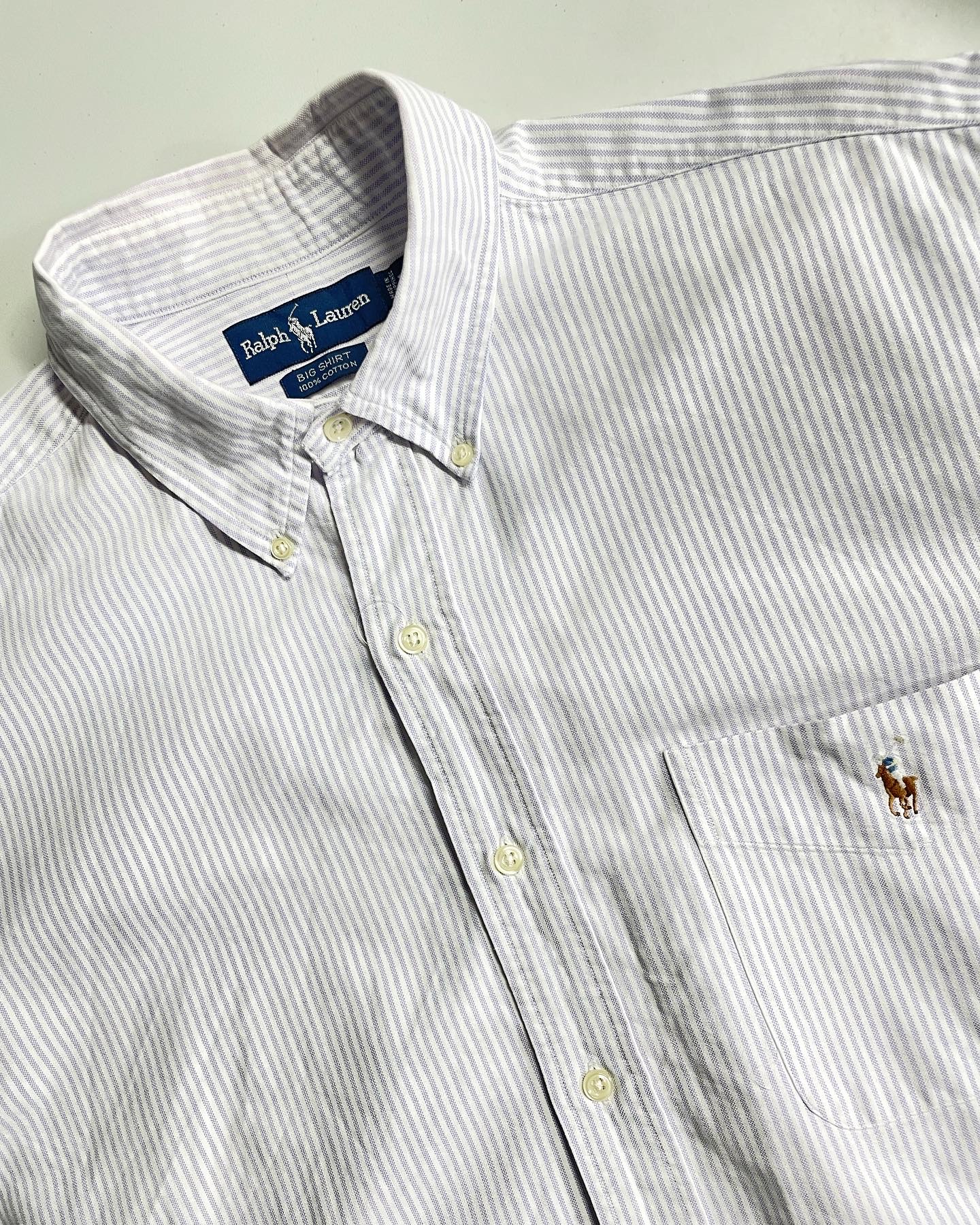 90년대 초반에 나온 폴로 랄프로렌 빅셔츠입니다.초기 특징으로, 폴로의 상징인 포니가 로고 우측에 들어간 점이 가장 큰 특징이며 오버핏한 실루엣으로 캐주얼하게 입기 좋을만한 셔츠입니다. 다른 개체들보다 현저히 적은 개체 수로서 희소성 있는 개체입니다. 하자 및 데미지 없는 준수한 컨디션이며 표기사이즈 L, 실측 105-110 정도 되는 사이즈감입니다.