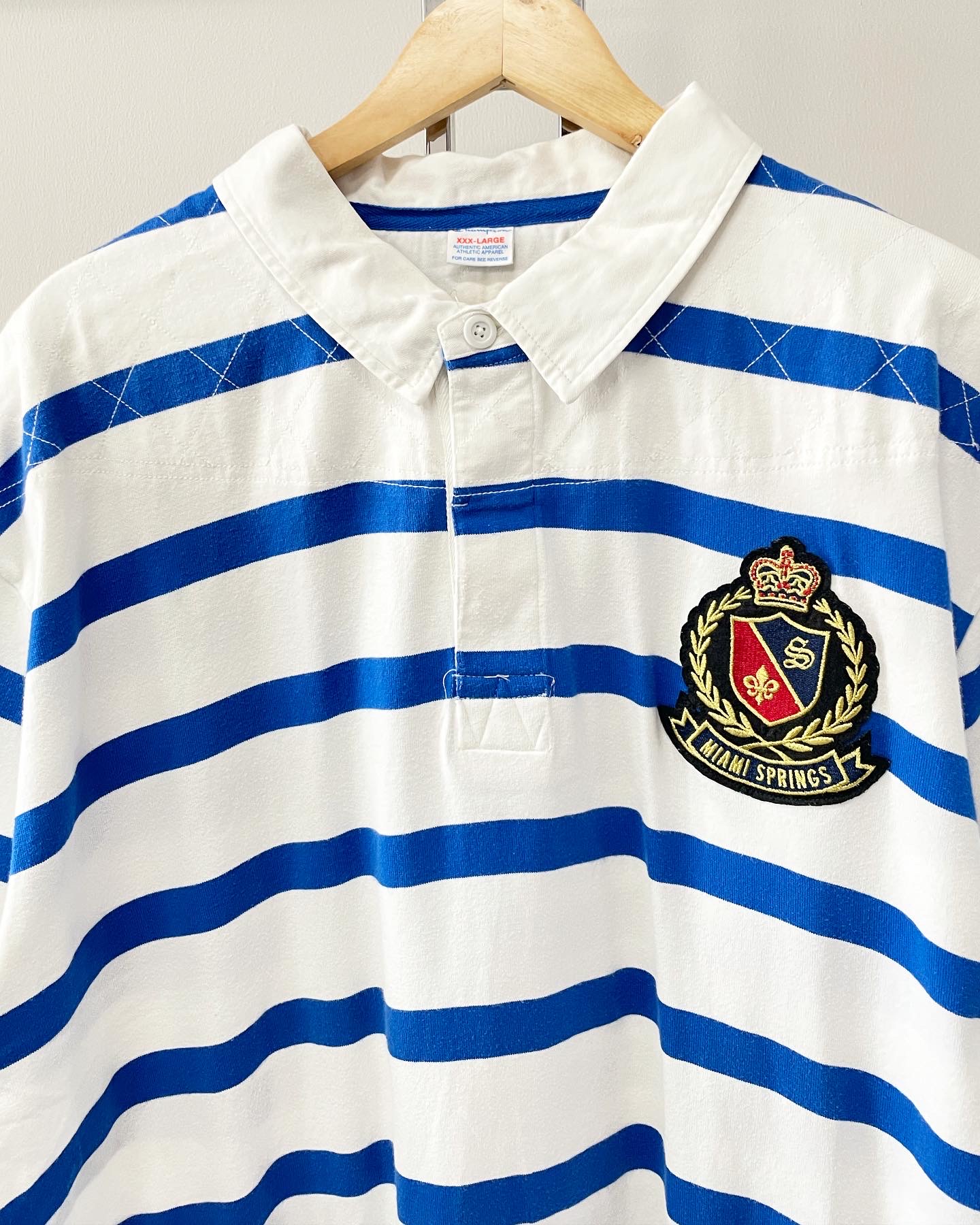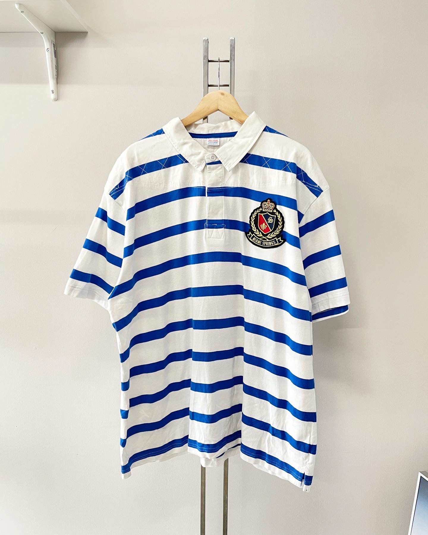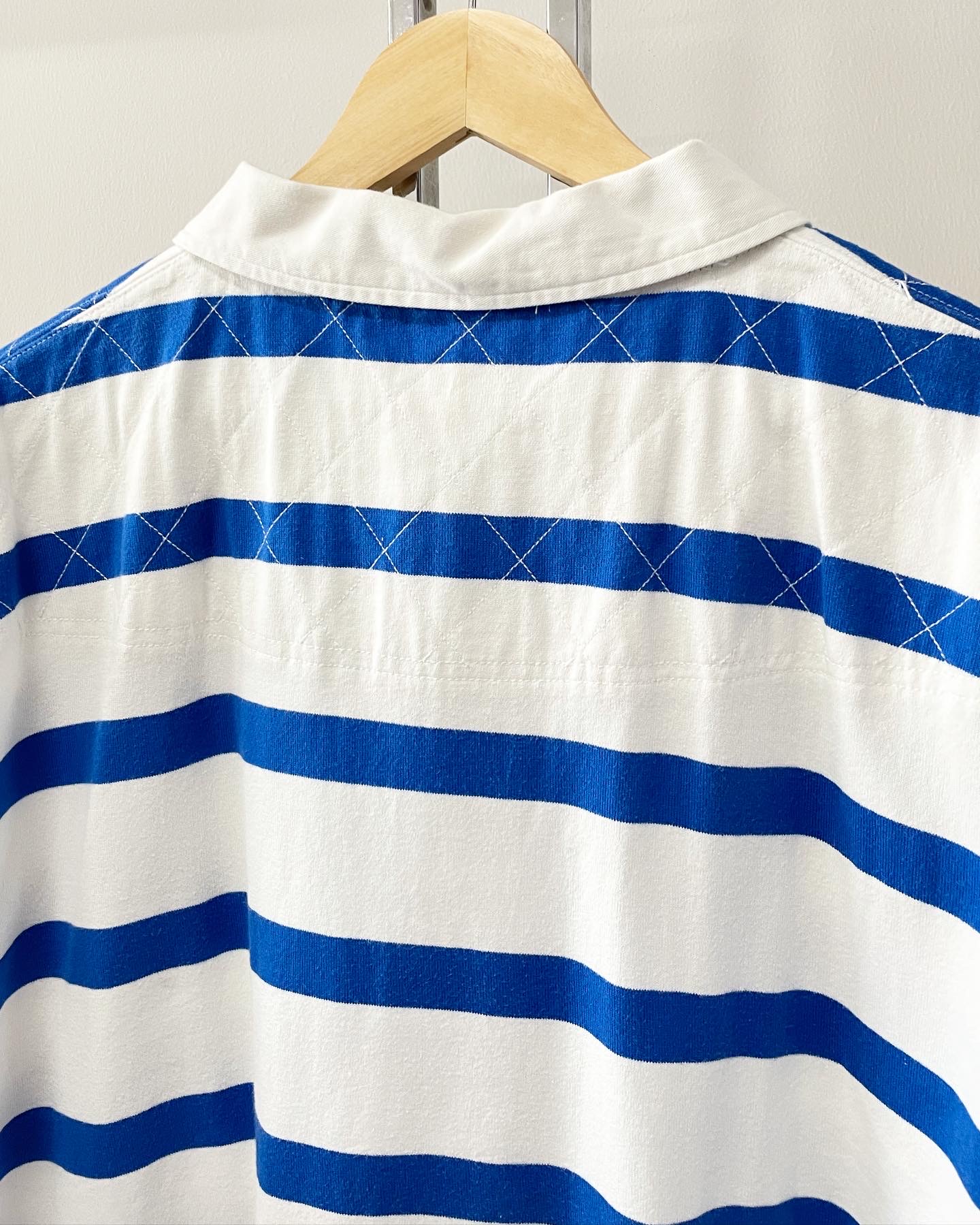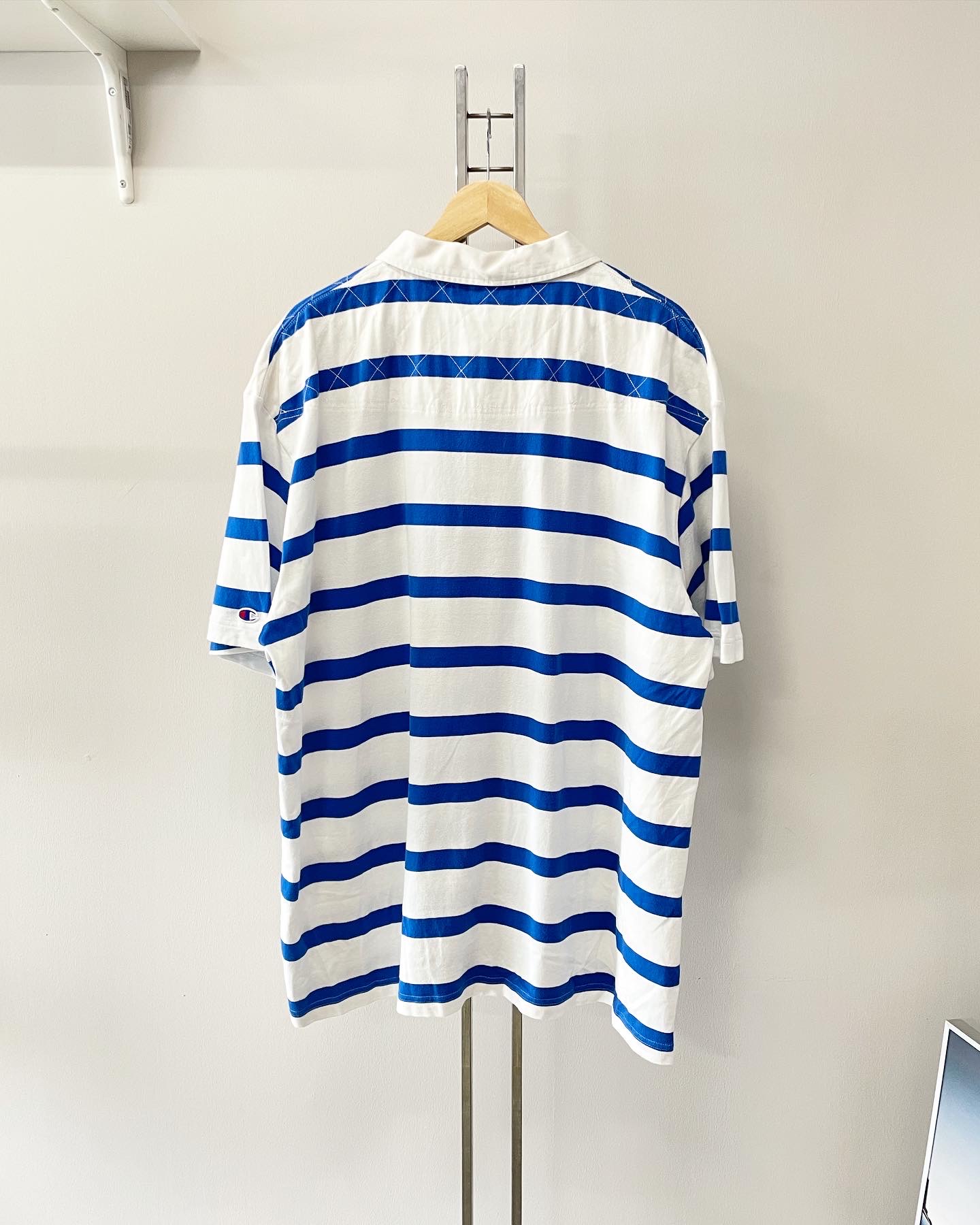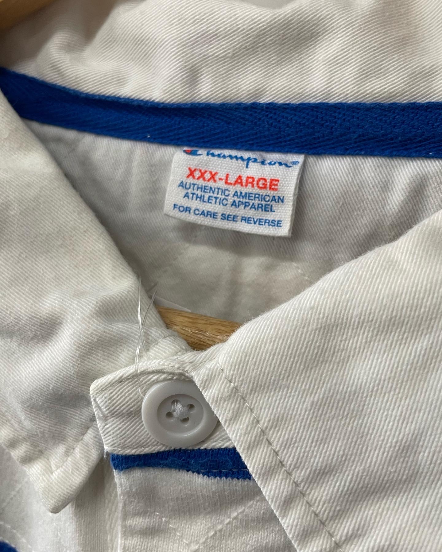 챔피온 단가라 럭비티 제품입니다. 화이트&블루 컬러웨이에 가슴에 자수패치가 매력적이며, 여유로운 오버핏 실루엣으로 낭낭한 핏감도 인상적입니다. 하자 및 데미지 없는 양호한 컨디션이며 실측 105-110 정도 되는 사이즈감입니다.