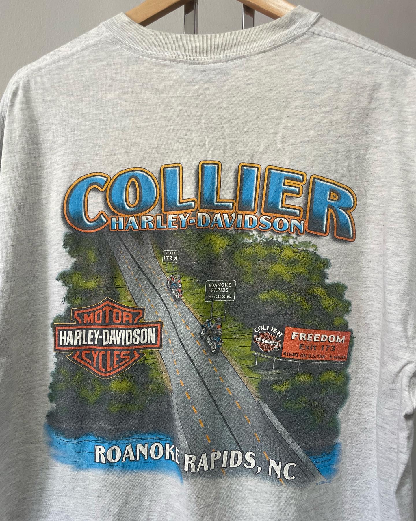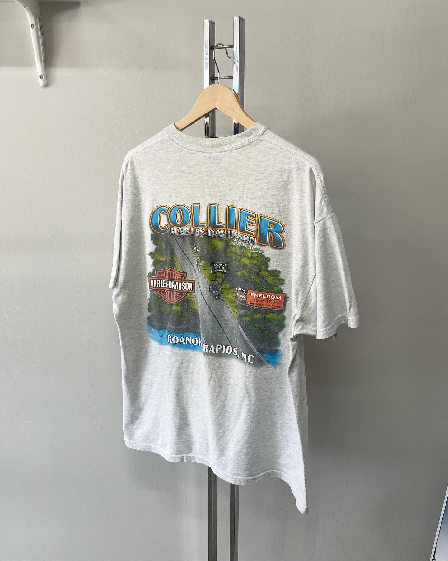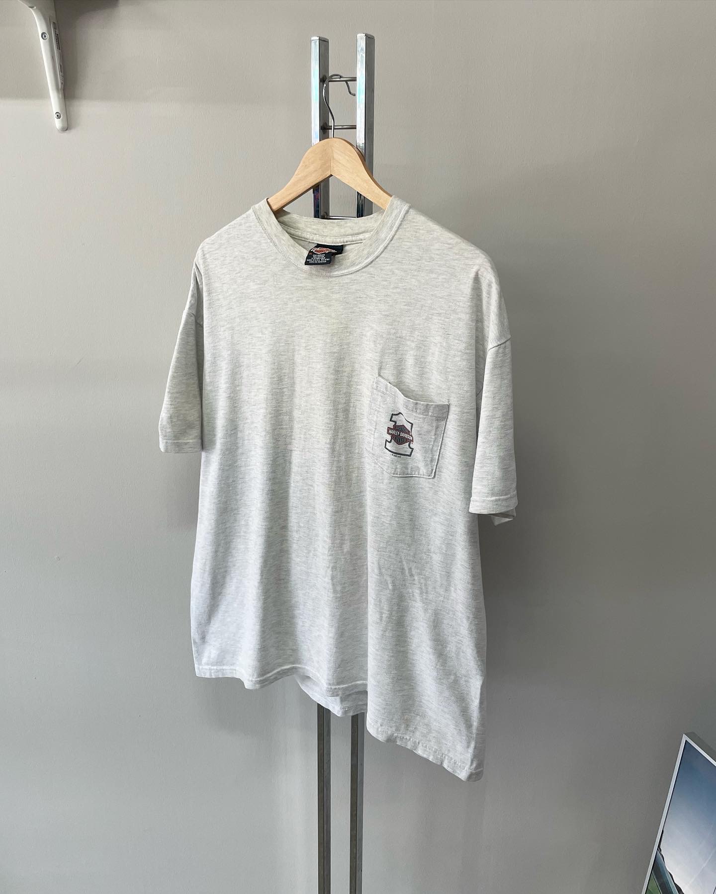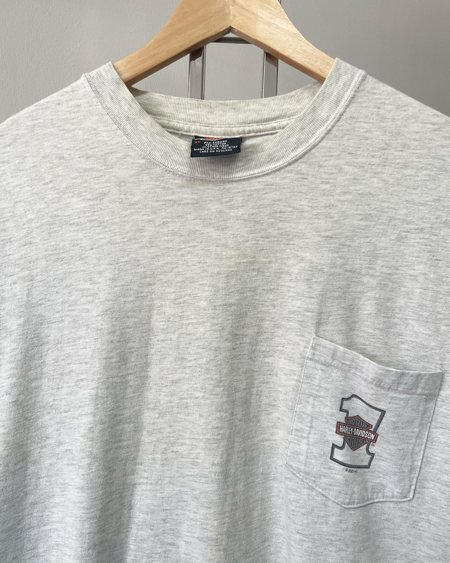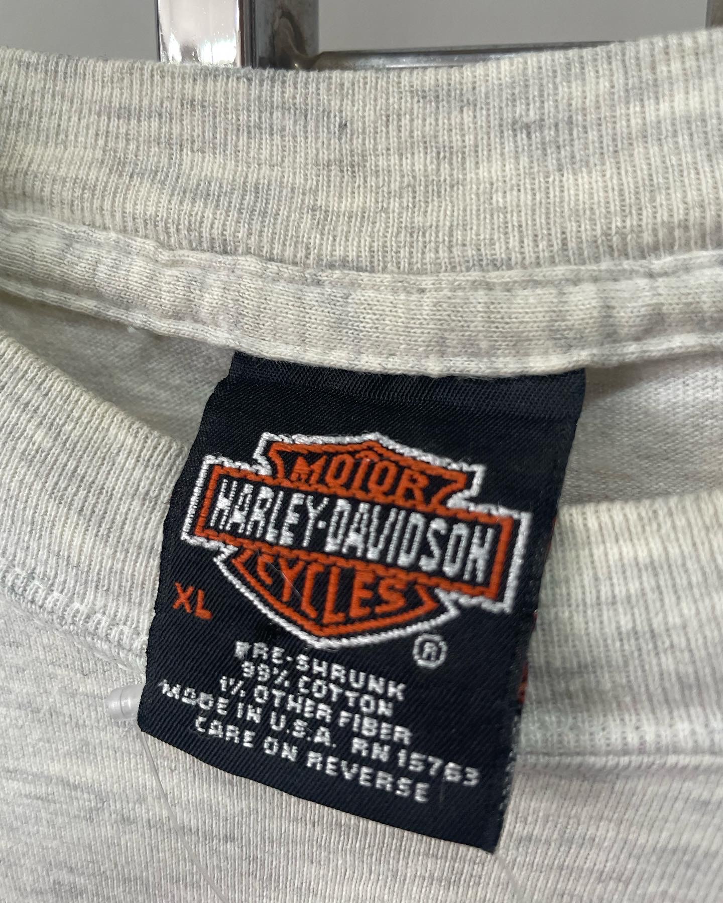 USA 생산 오리지날 할리데이비슨 빈티지 티셔츠입니다. 멜란지 그레이 컬러와 프린팅이 매력적인 제품이며, 옅은 오염 존재 외 하자 없는 컨디션입니다. 실측 105 정도 되는 사이즈감입니다.