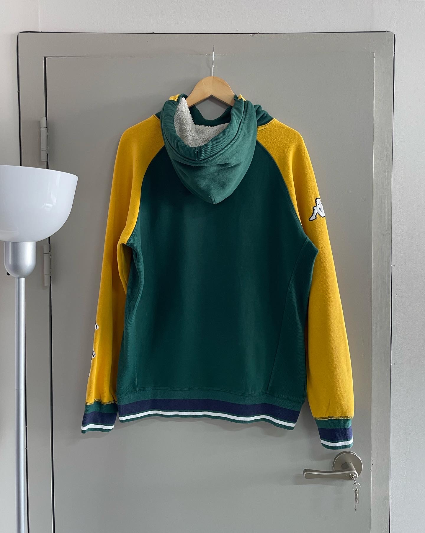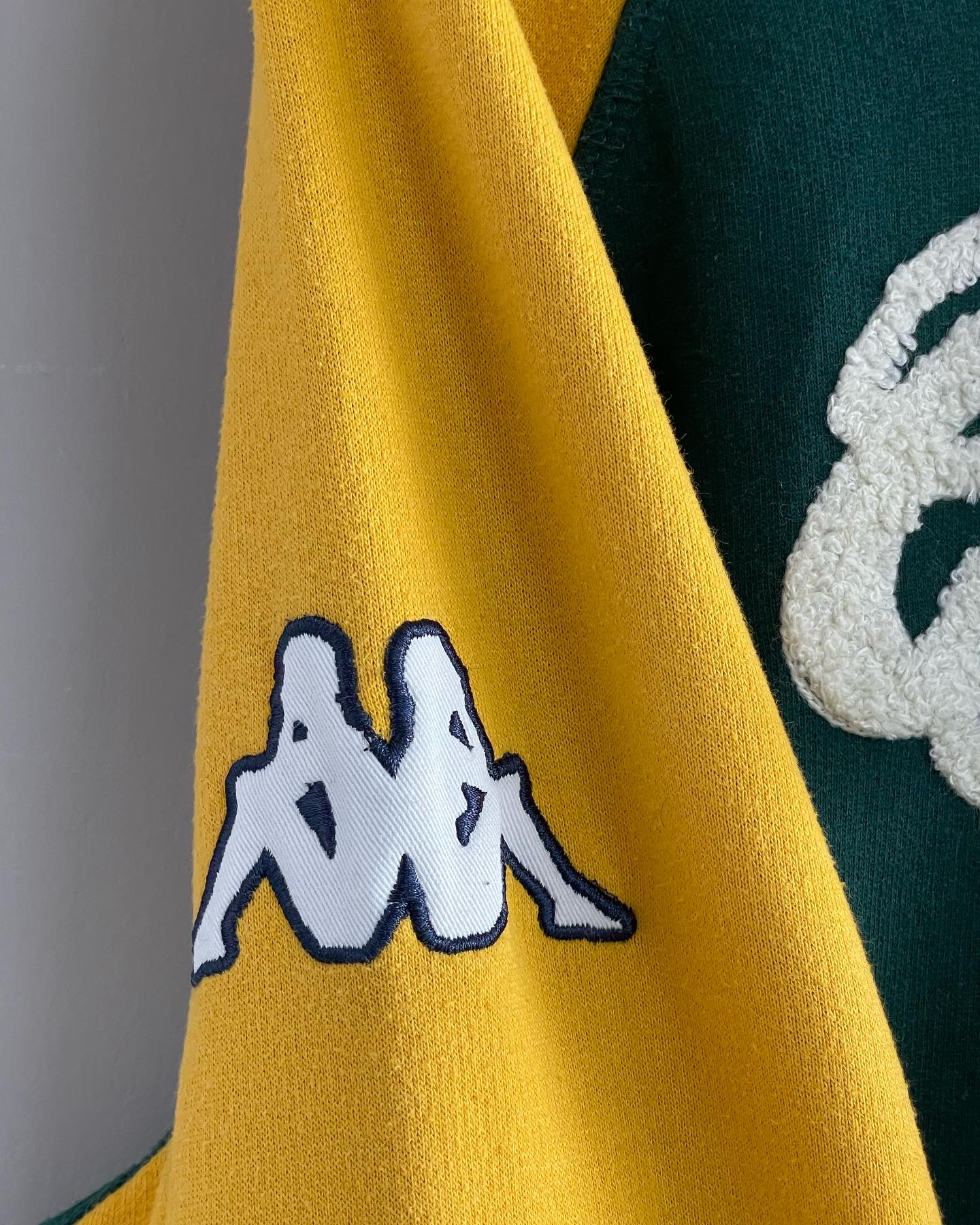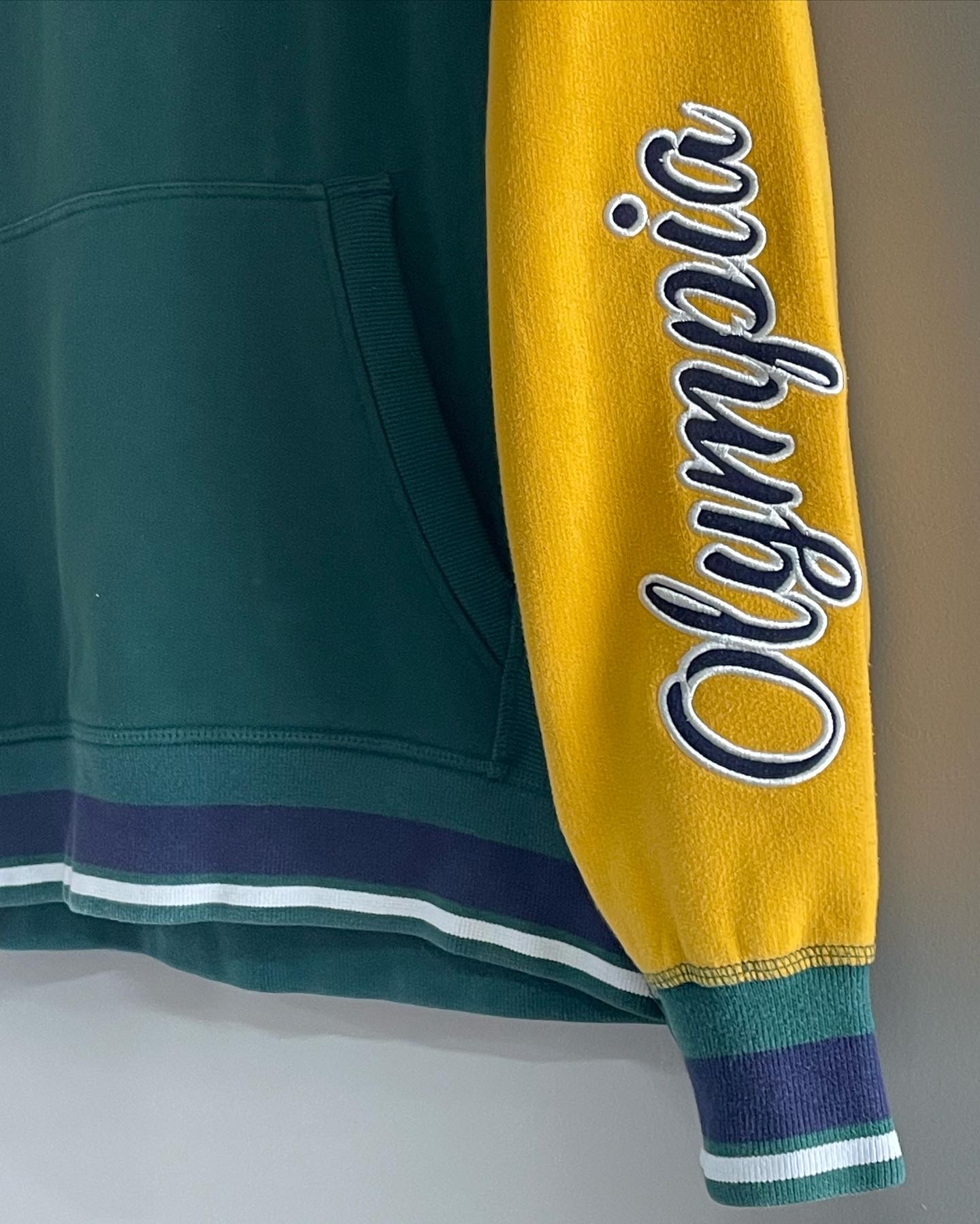 90년대 생산 카파 이태리에 있는 기념적인 스키장인 코르티나 올림피아 빈티지 후드티입니다. 멋스러운 그린&옐로우 컬러웨이와 양털 자수처리가 매력적이며, 스키는 동계 스포츠이기 때문에 보온성 디테일을 고려해 후드부분에만 양털기모로 들어가 보온성도 뛰어나며, 몸에는 약한 일반기모가 들어가 있습니다. 하자 및 데미지 없는 양호한 컨디션이며, 실측 105 정도 되는 사이즈감입니다.