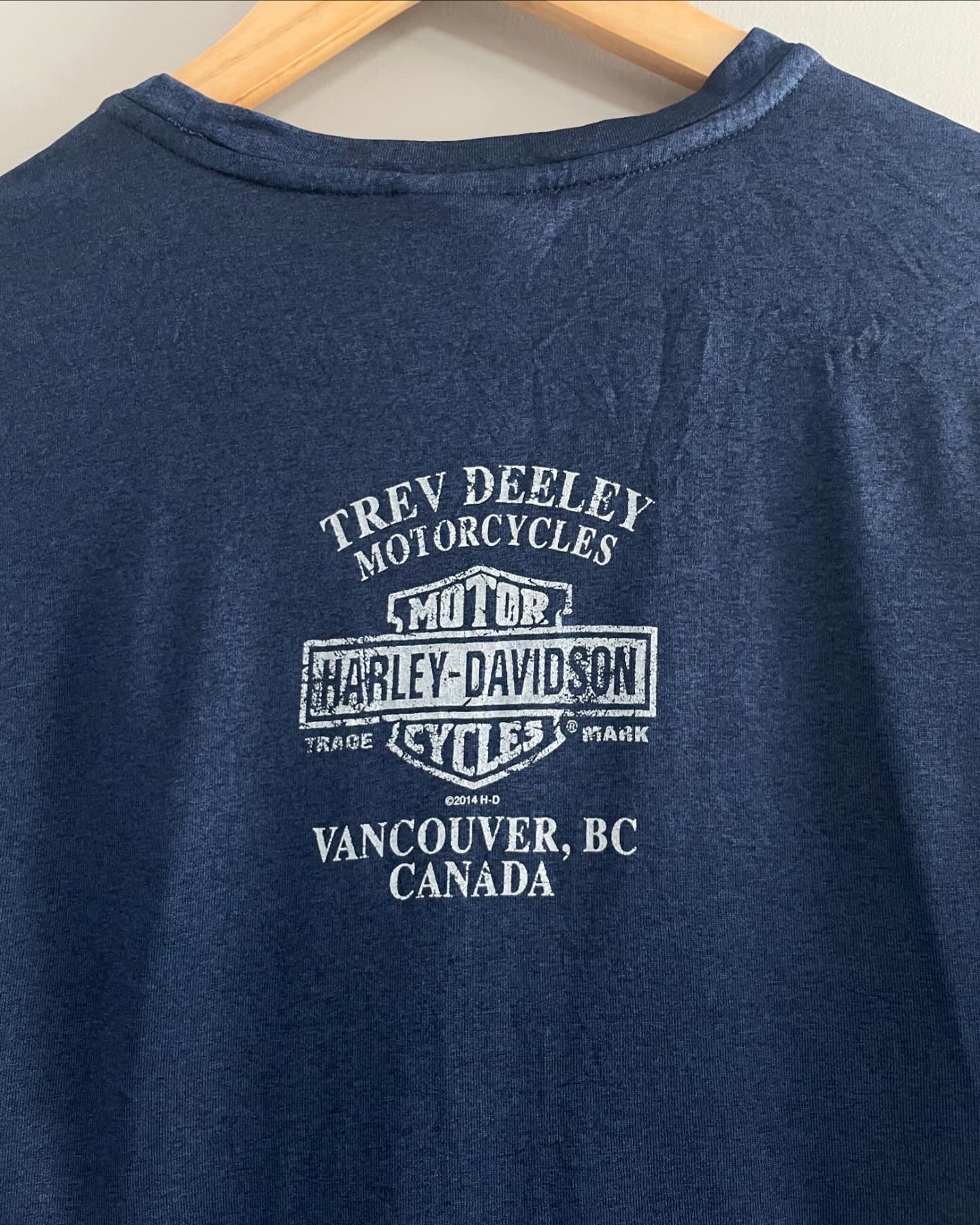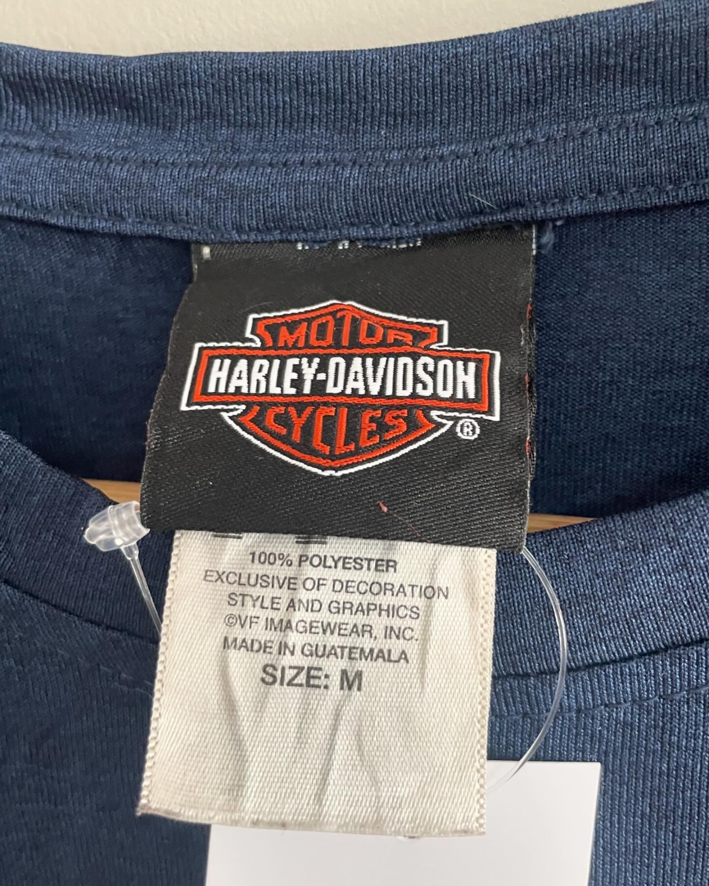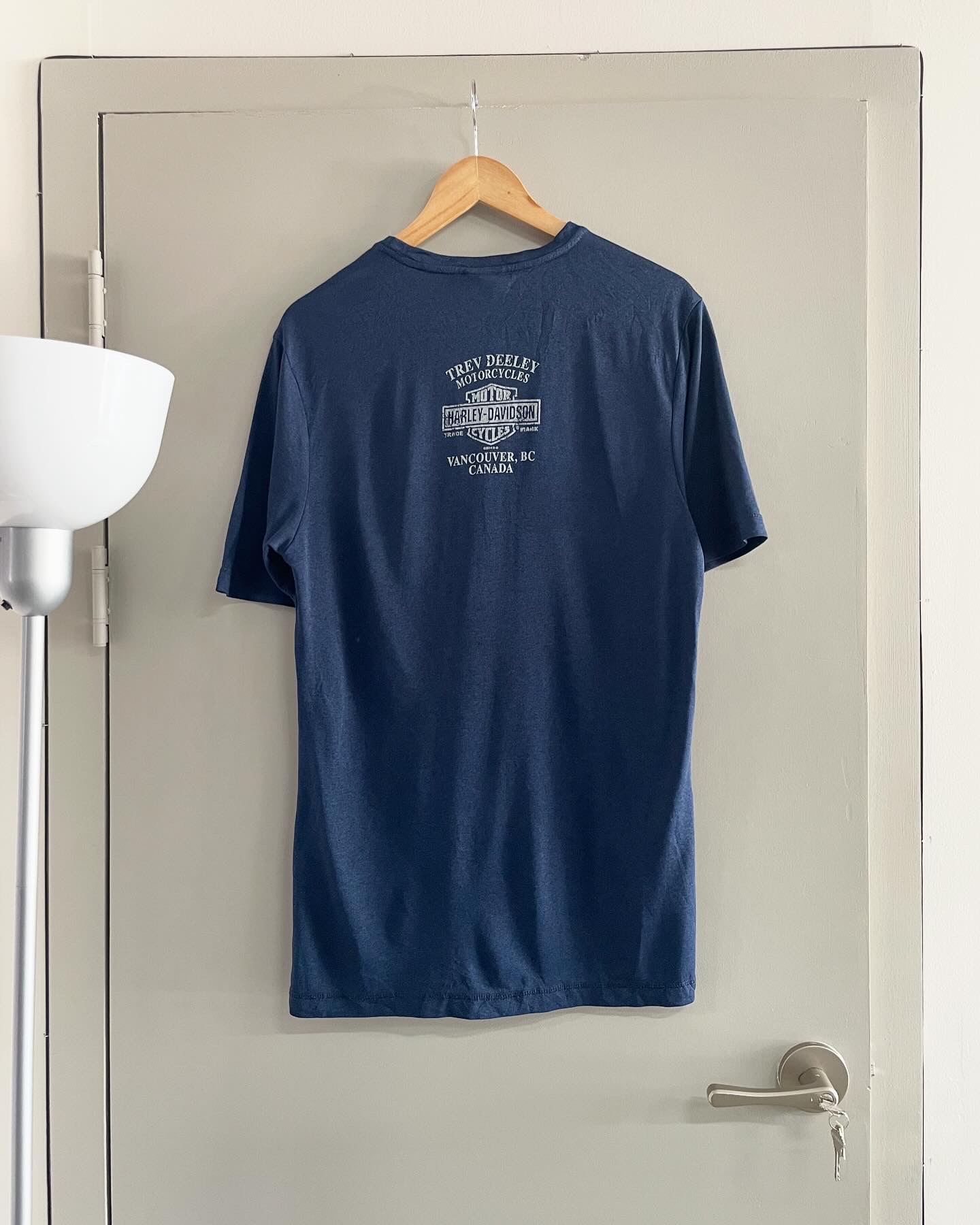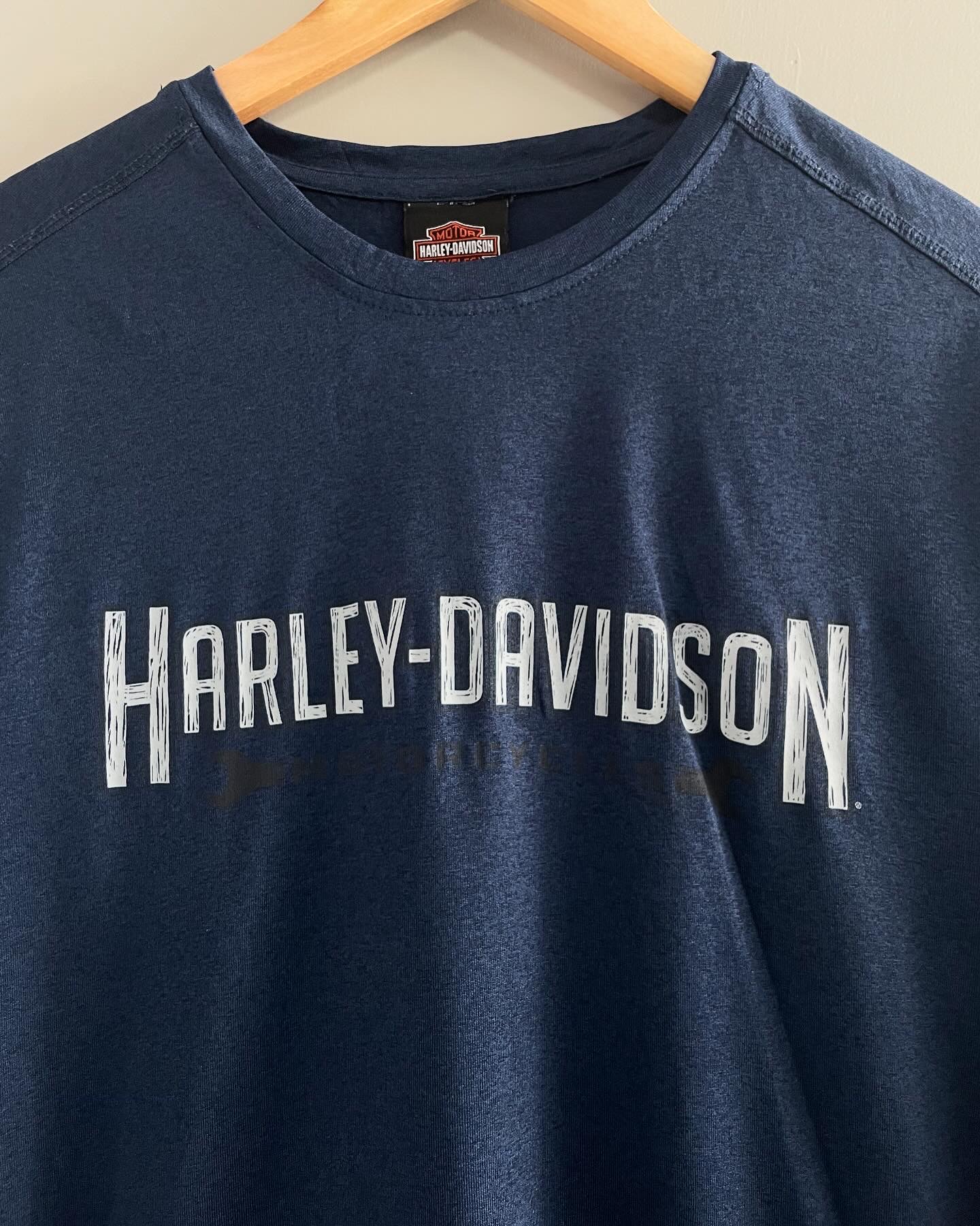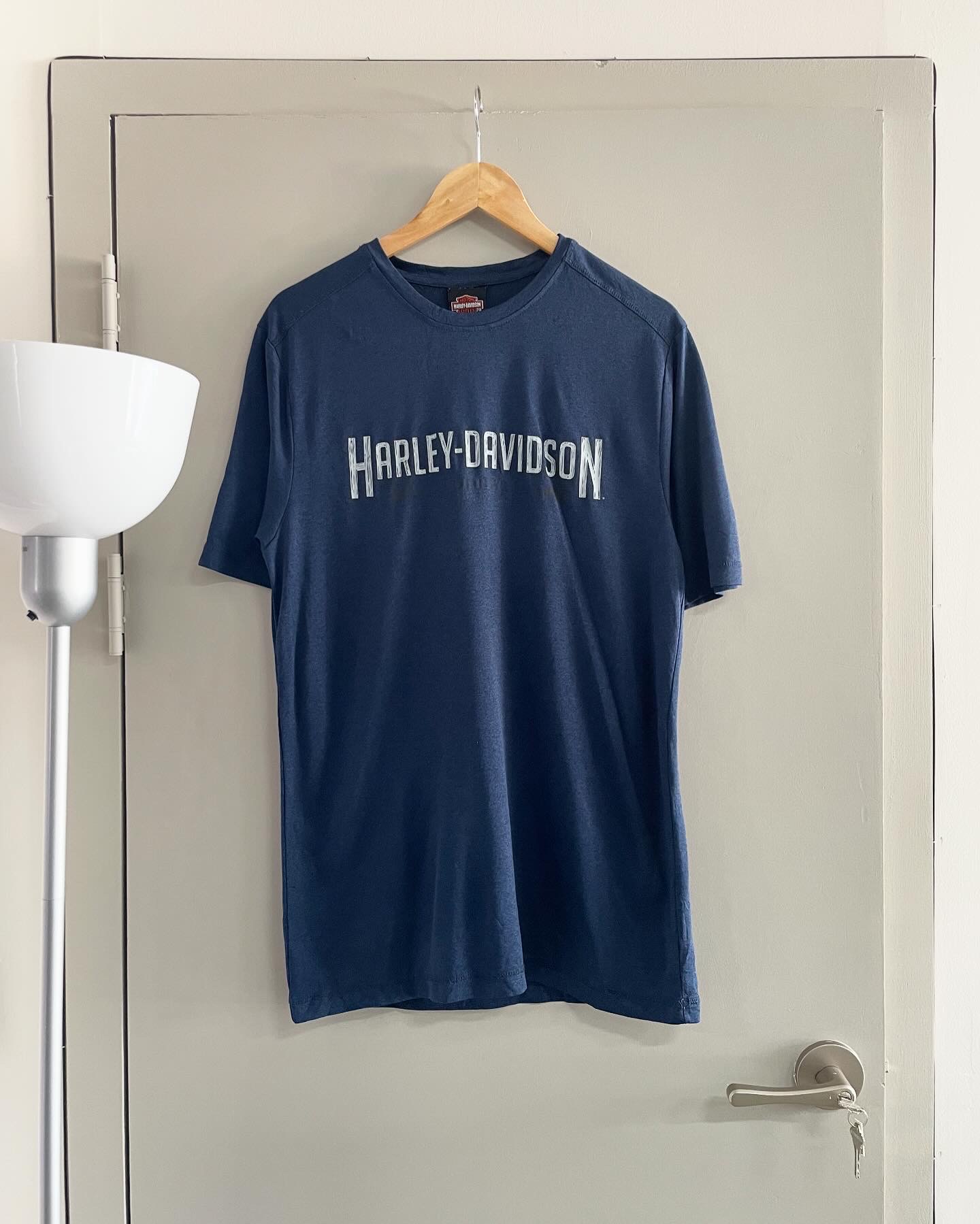 할리데이비슨 오리지날 티셔츠입니다. 네이비블루 컬러감과과 폴리 원단으로 제작되어 가볍고 시원한 느낌이 매력적이며,큰 하자 없는 양호한 컨디션입니다. 실측 95-100 되는 사이즈감입니다.