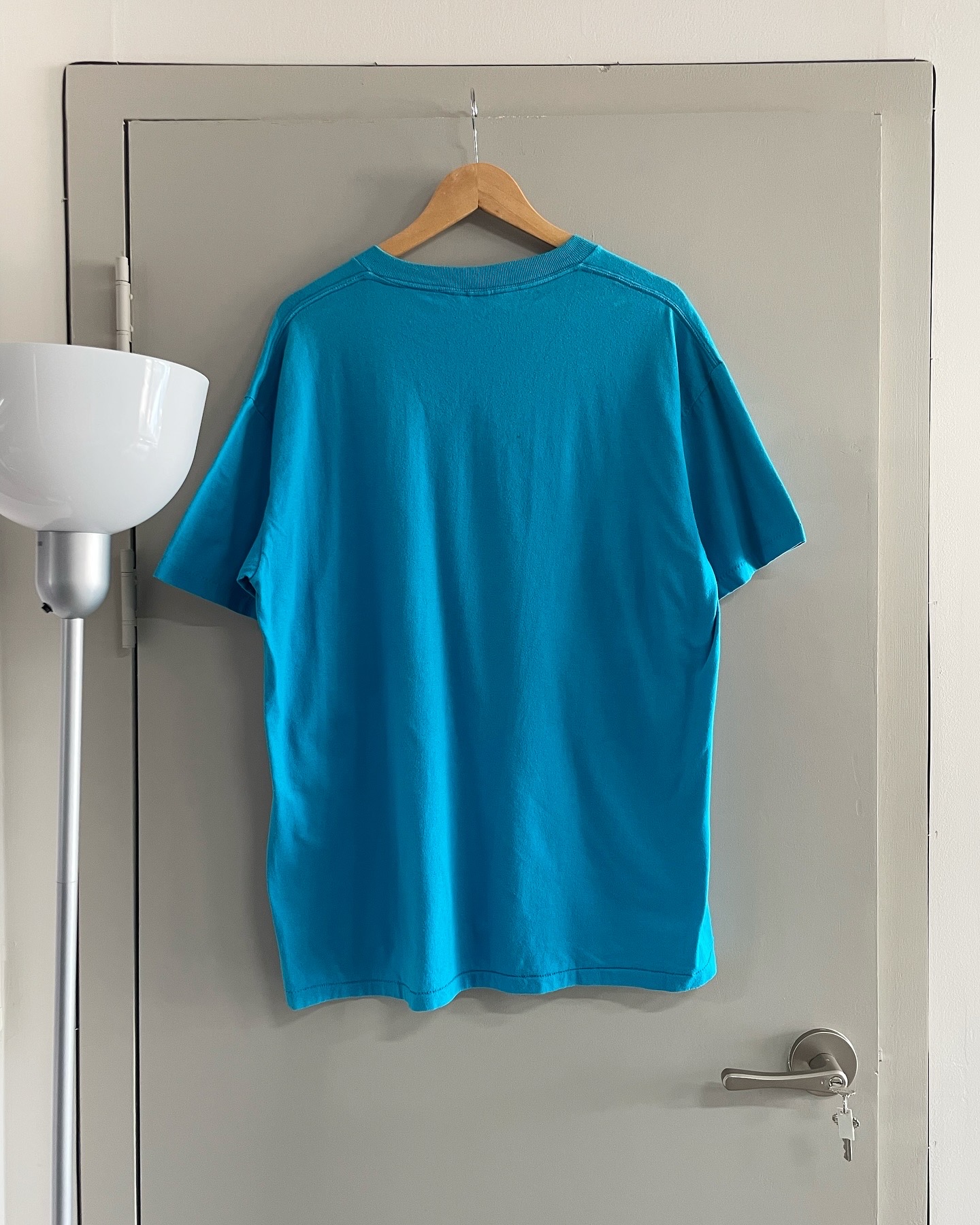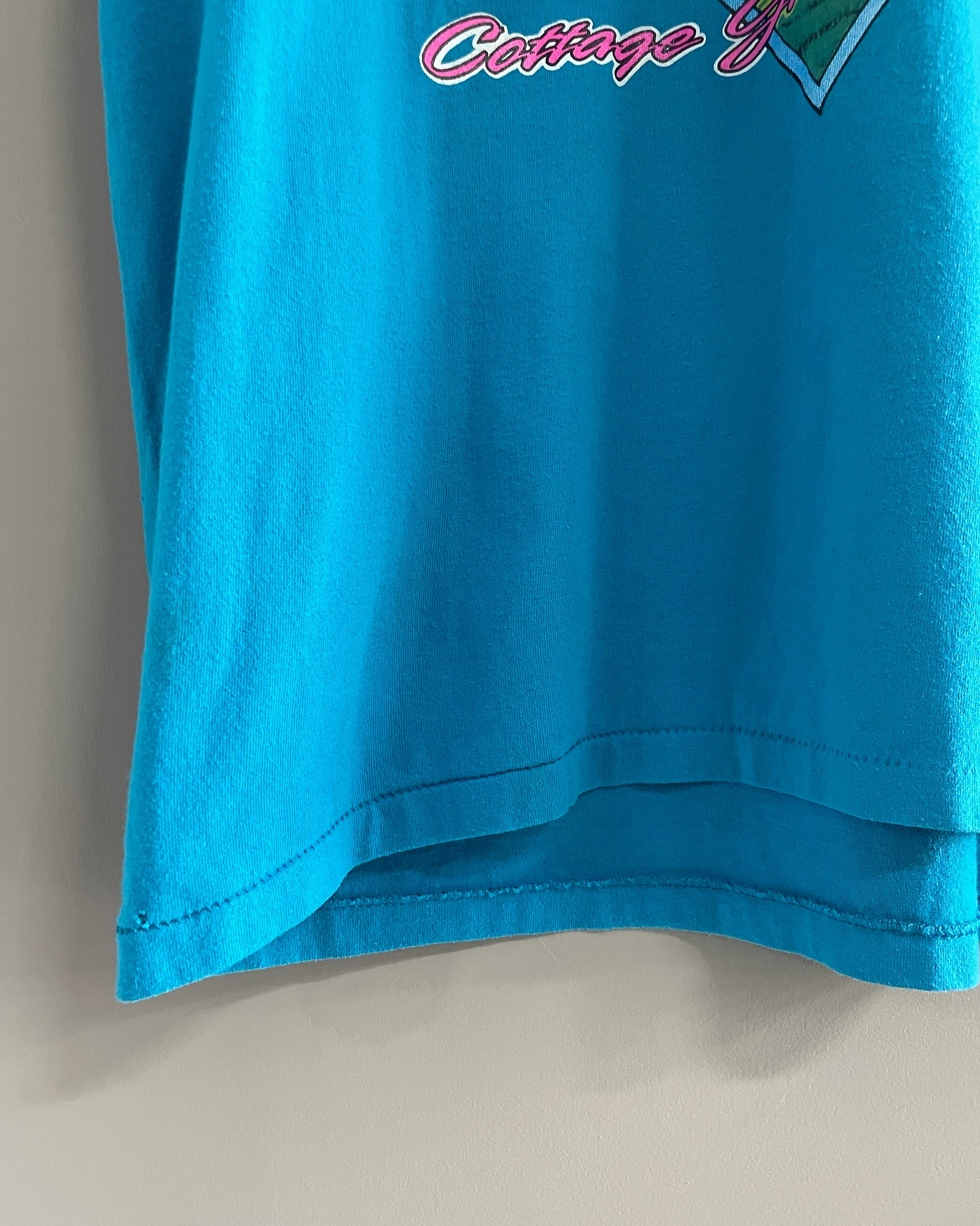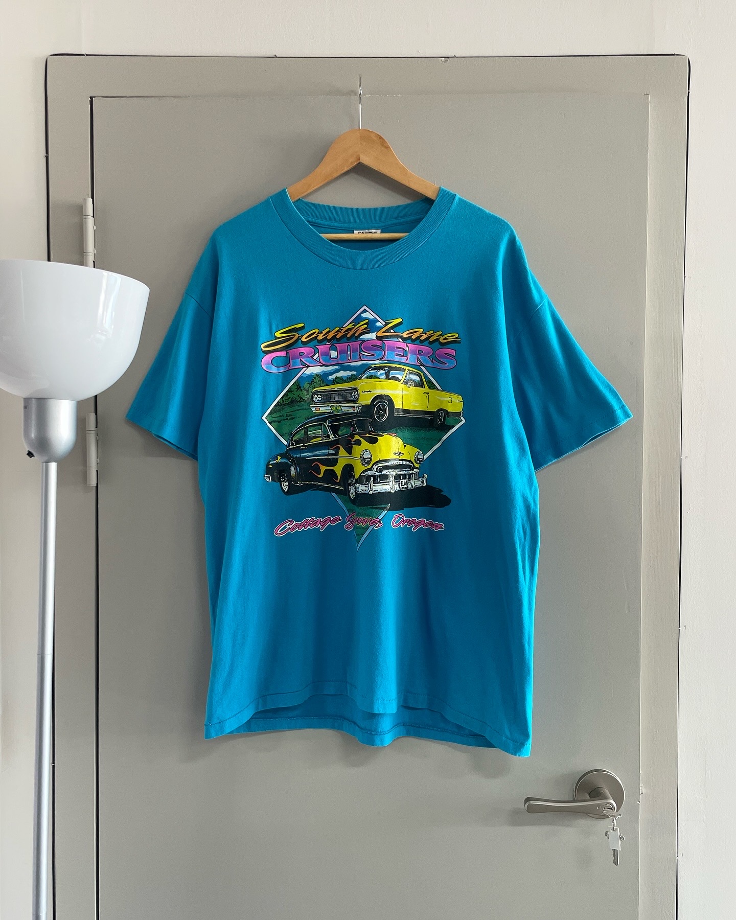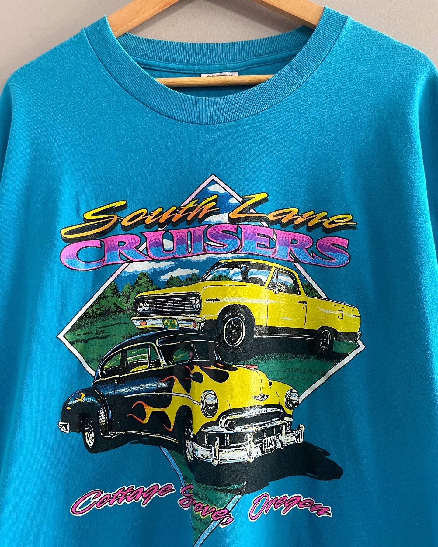 90년대 생산된 made in USA Oneita 사의 싱글스티치 올드카 티셔츠입니다. 시원한 블루 컬러와 빈티지한 올드카니 나염이 아주 매력적인 제품이며 밑단 작은 핀홀과 등판 잘안보이는 오염 존재하며 실측 105-108 정도 되는 사이즈감입니다.