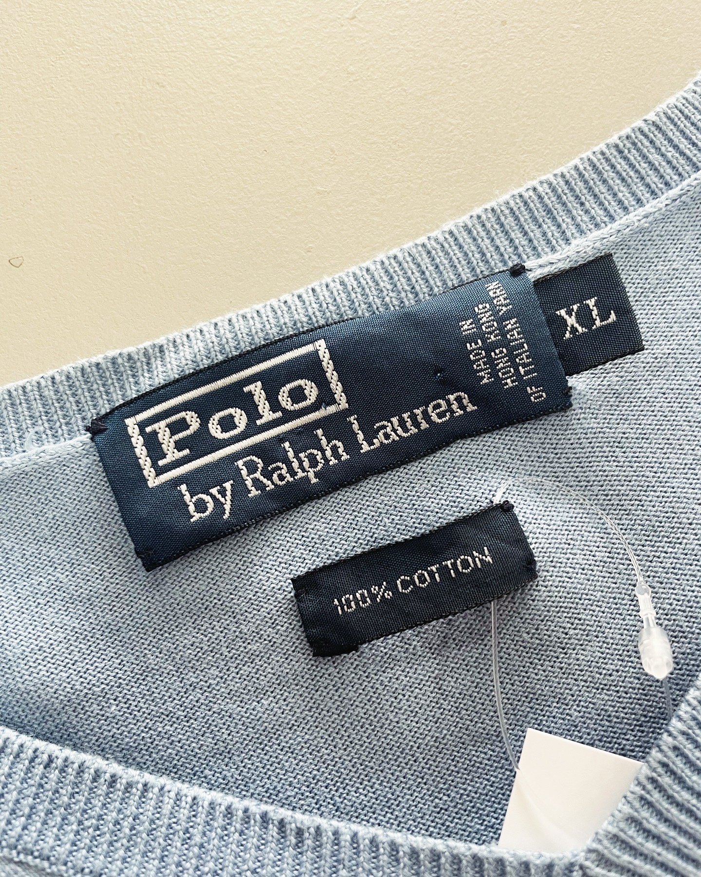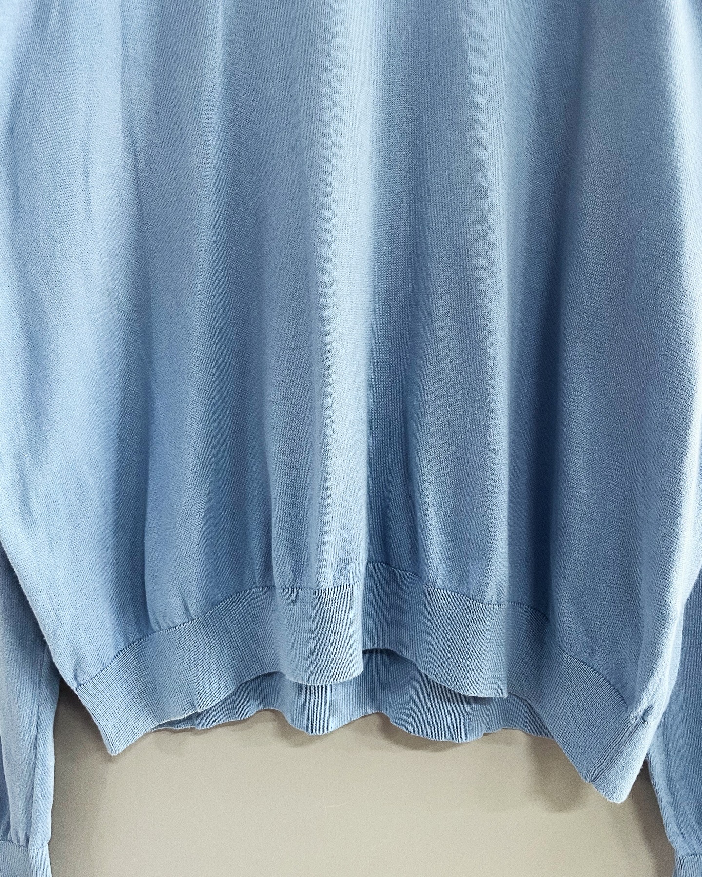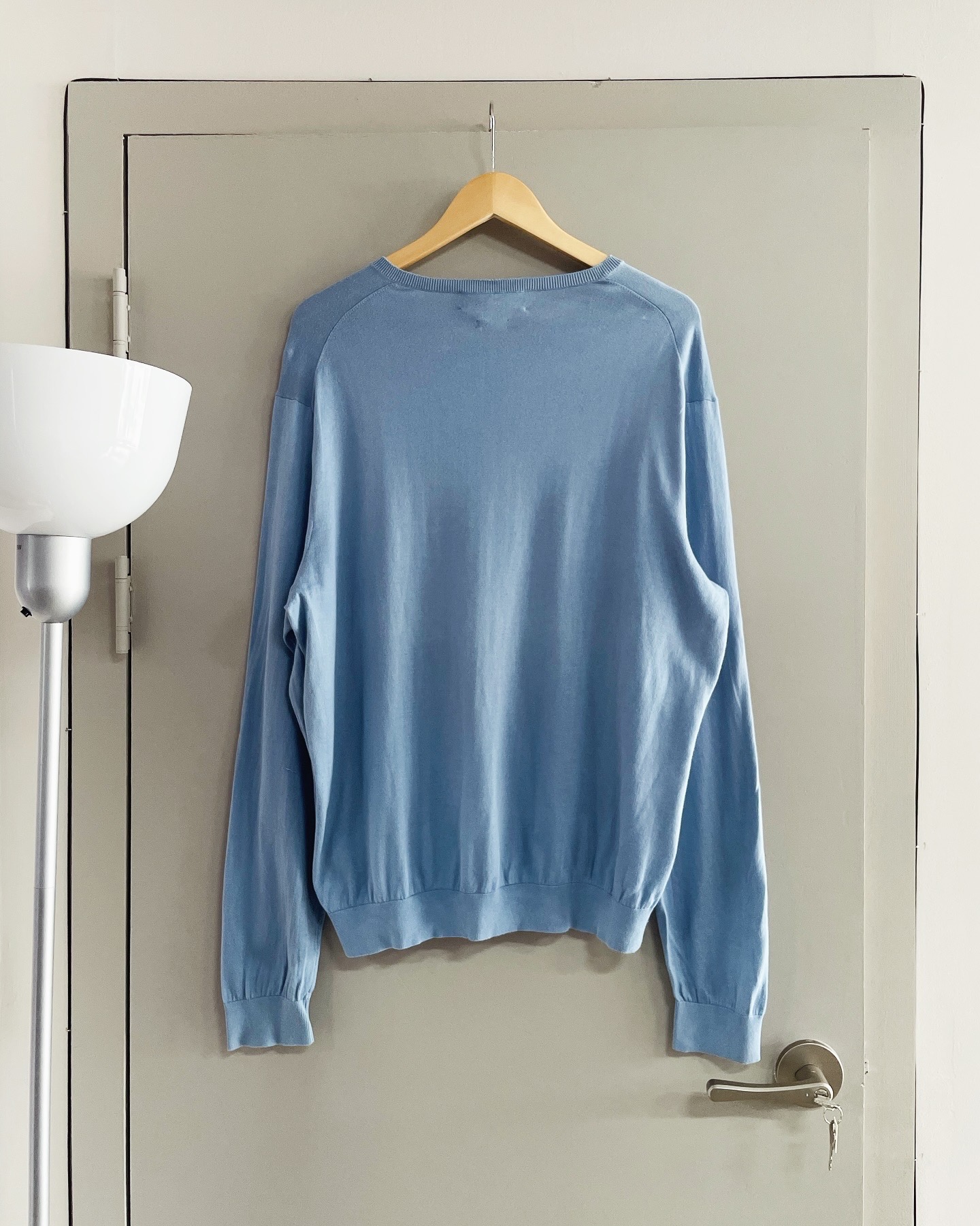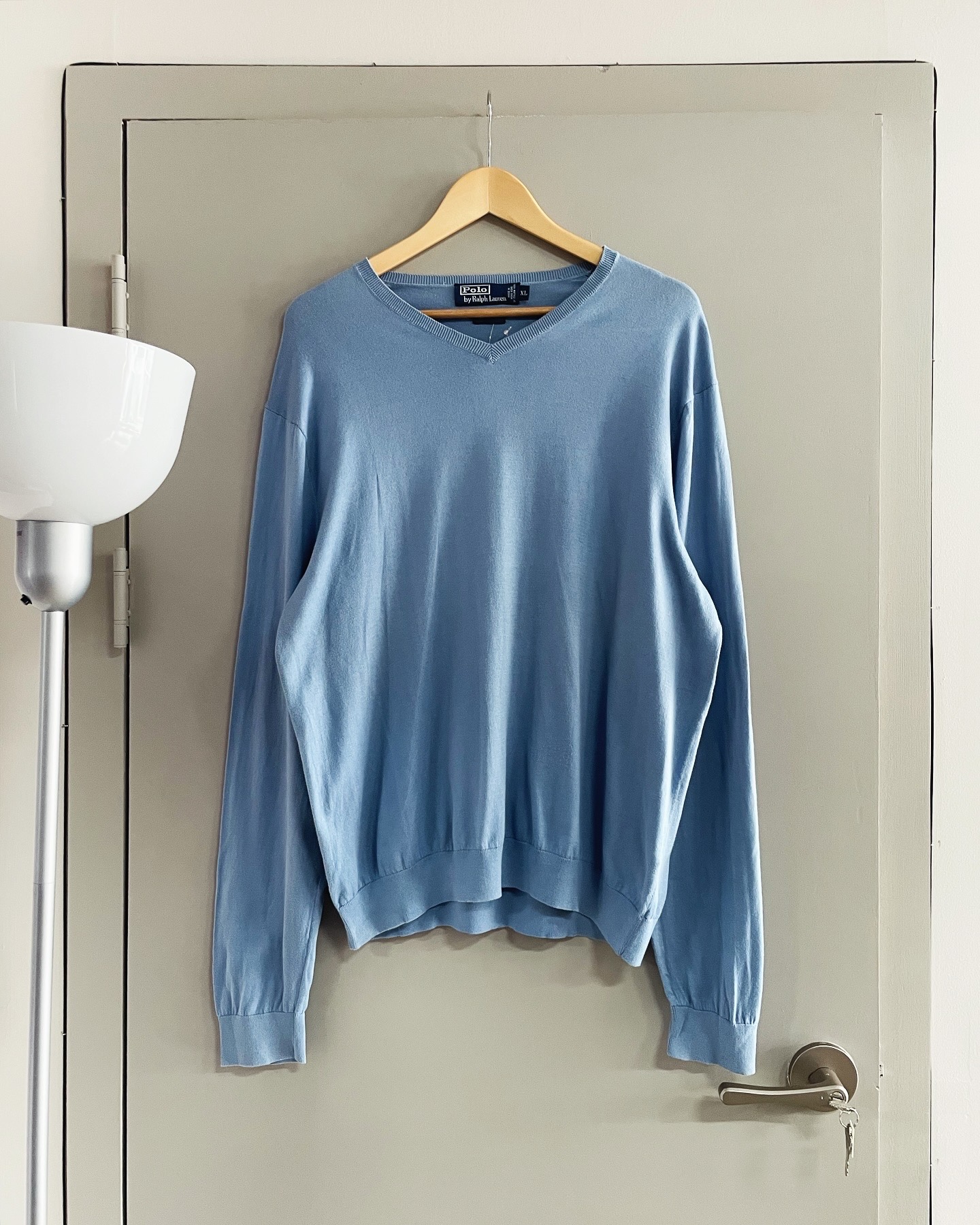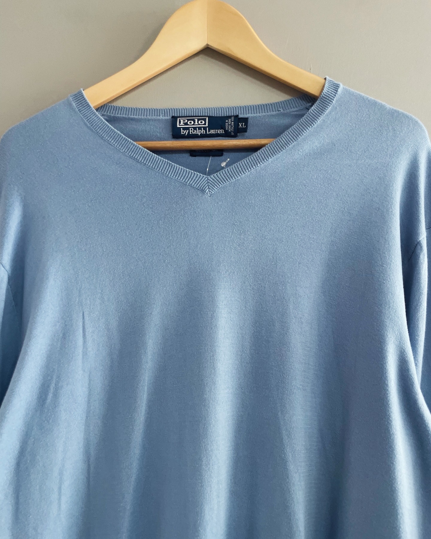 폴로 랄프로렌 코튼 브이넥 스웨터입니다. 베이직하게 입기 좋을만한 스카이 컬러로, 하자 및 데미지 없는 컨디션입니다. 실측 105 정도 되는 사이즈감입니다.