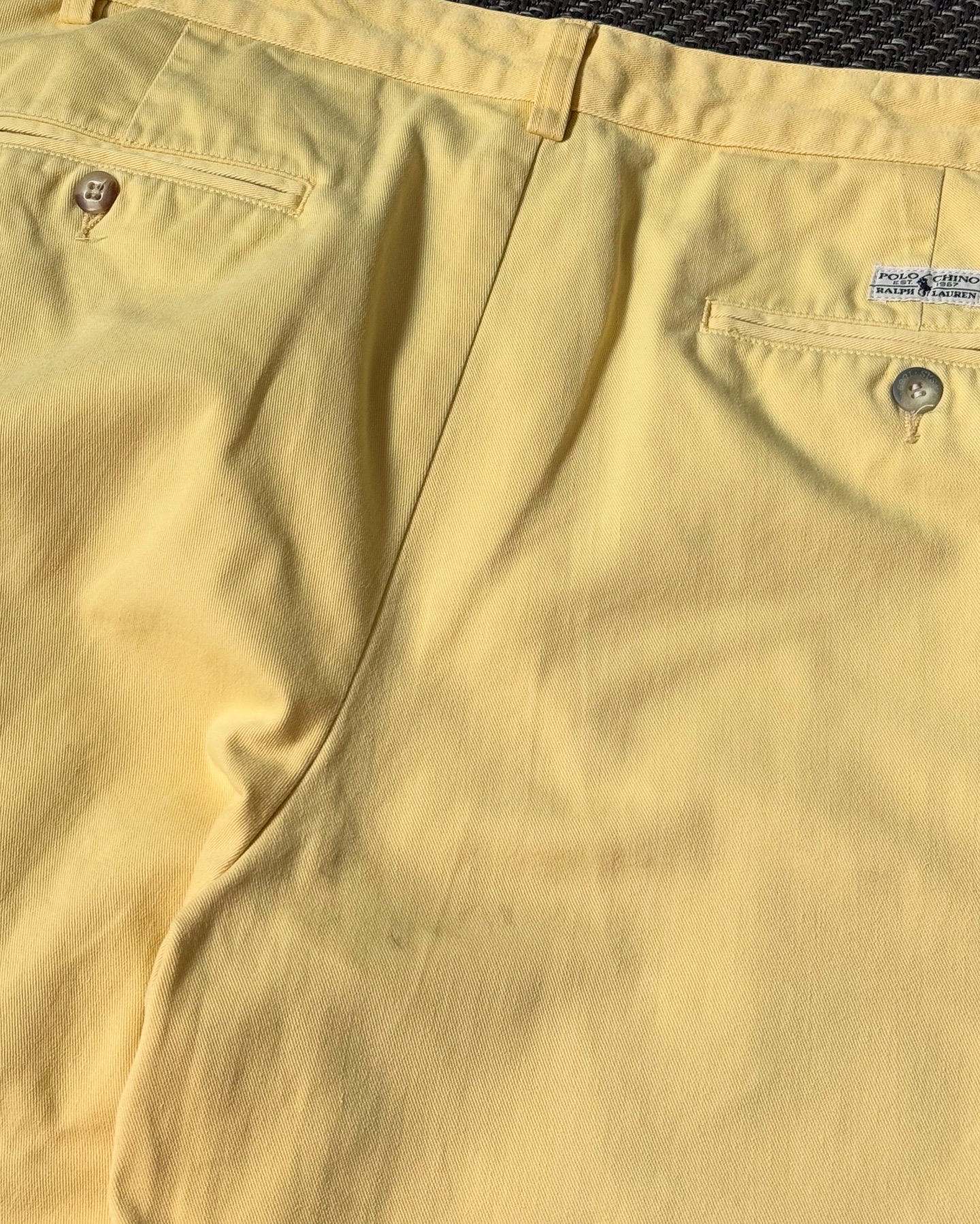 90년대 폴로 랄프로렌 ‘Andrew’ 치노팬츠입니다. 쉽게 보기힘든 옐로우 컬러웨이와 투플리츠 디테일의 여유로운 실루엣이 매력적인 제품입니다. 뒷면 힙부분 미세한 오염 외 하자 없는 양호한 컨디션이며, 실측 32 정도 되는 사이즈감입니다.