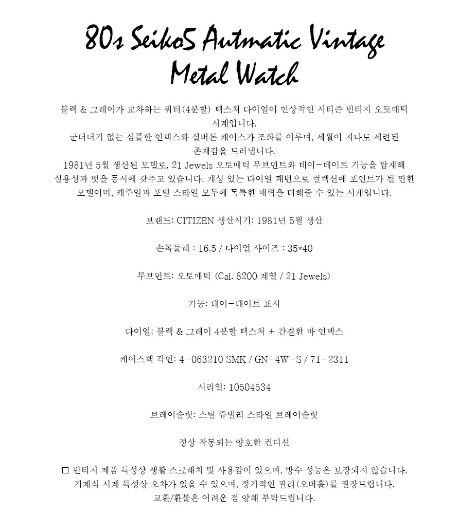 - 가급적이면 꼼꼼히 검수해서 설명 드리고 있지만 빈티지 제품 특성 상 저희가 발견하지 못한 오염이나 하자가 있을 수 있으니 상태에 민감하신 분들은 신중한 구매 부탁 드립니다.