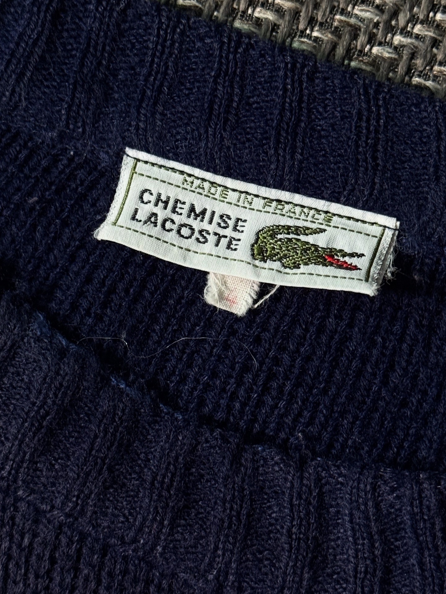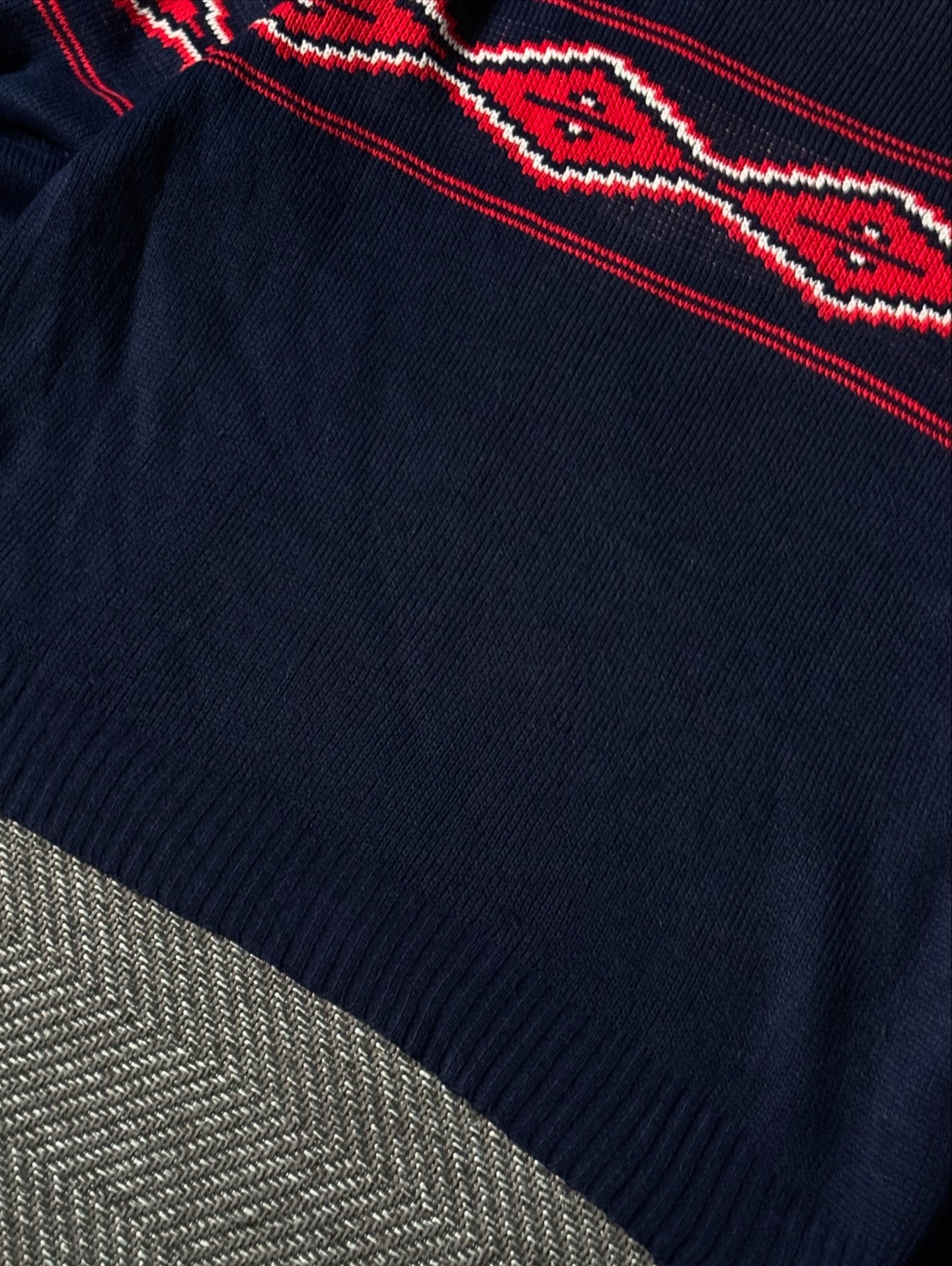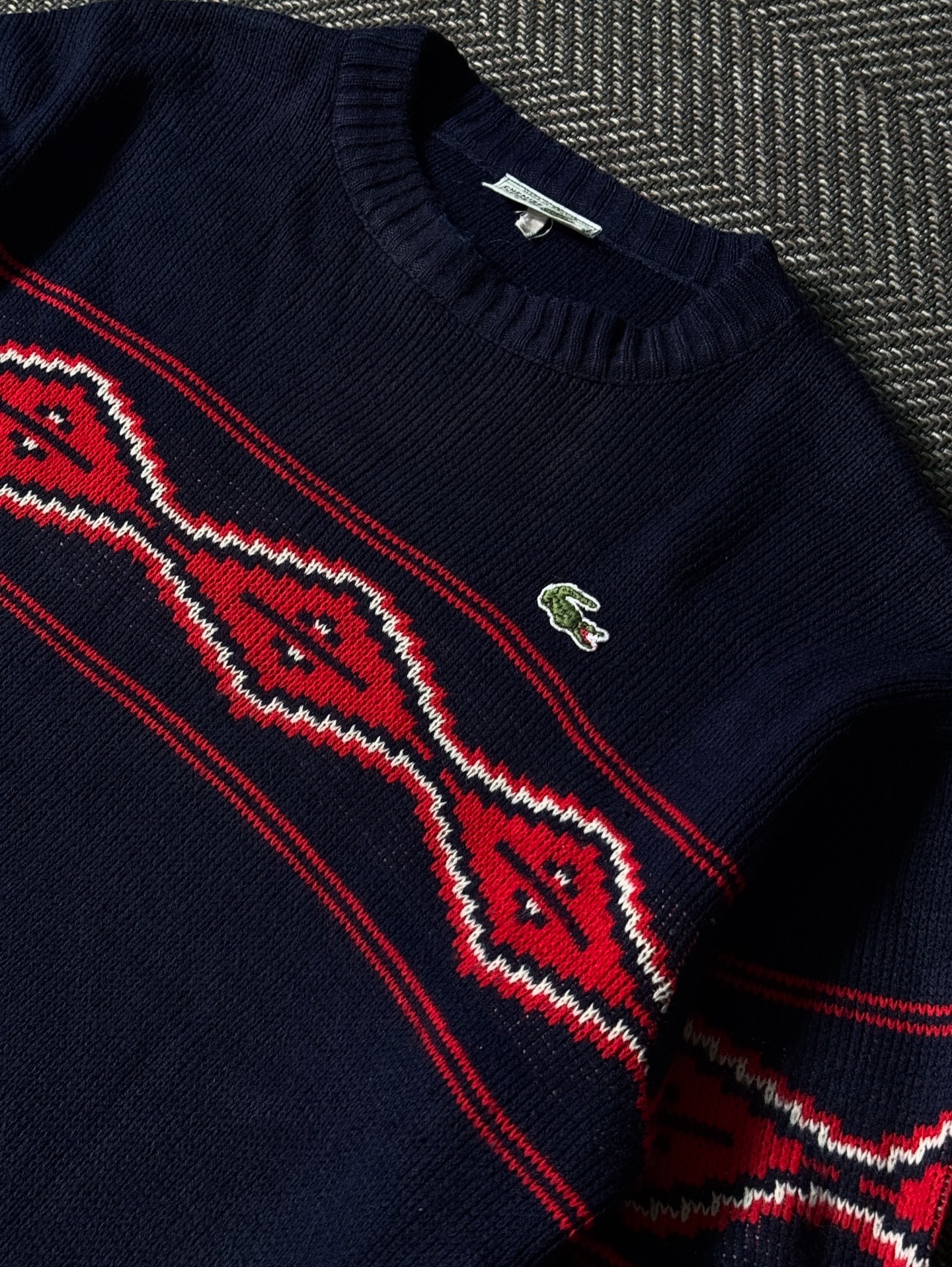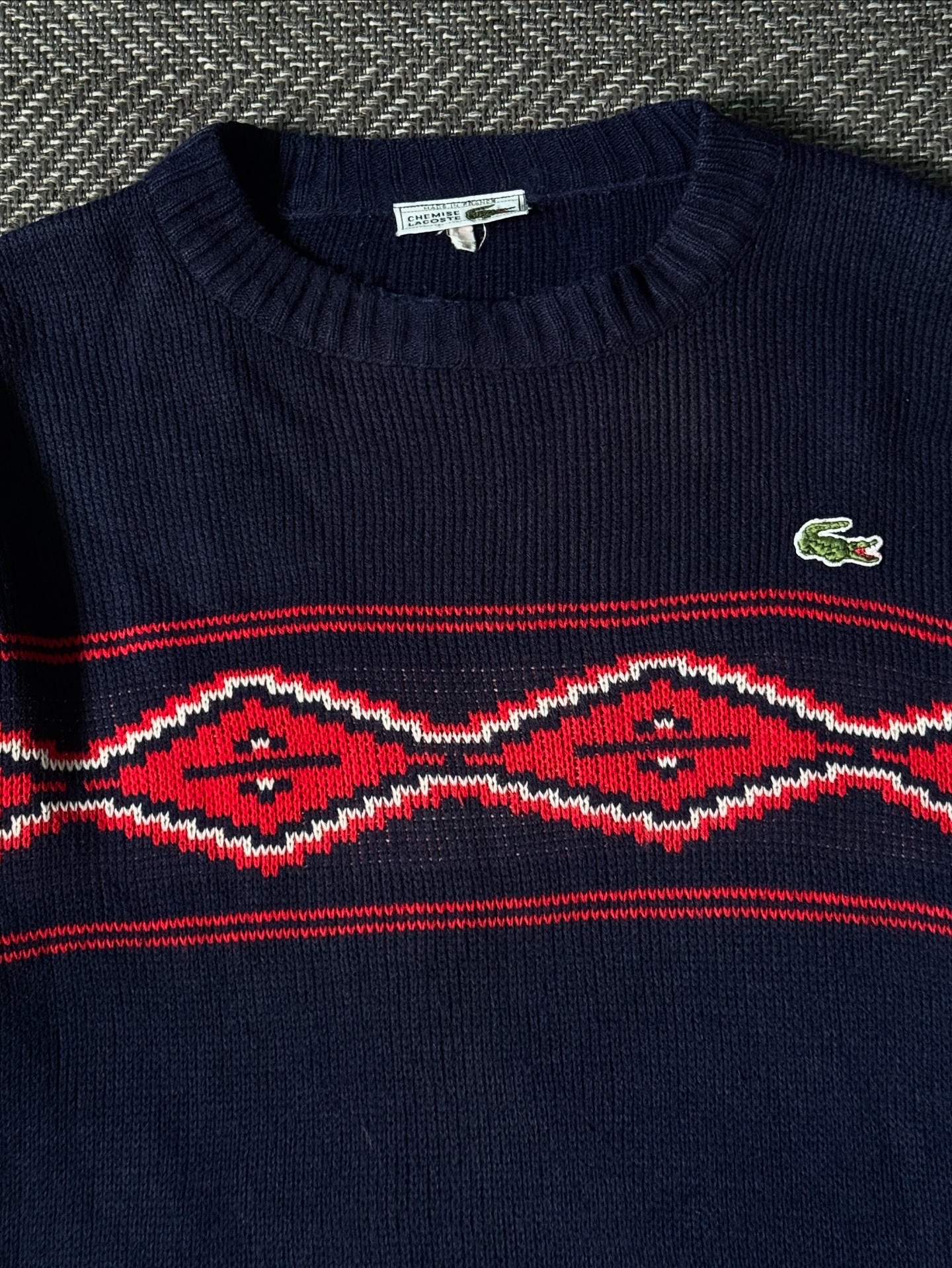 프랑스 생산의 정통 CHEMISE LACOSTE 빈티지 니트 스웨터입니다. 네이비 컬러 바탕에 레드 & 화이트 기하학 패턴이 포인트로 들어가 있어 클래식하면서도 세련된 무드를 줍니다. 빈티지 라코스테 특유의 감성과 Made in France 퀄리티를 느껴보실 수 있습니다. 하자 없는 양호한 컨디션이며, 실측 105 정도 되는 사이즈입니다.