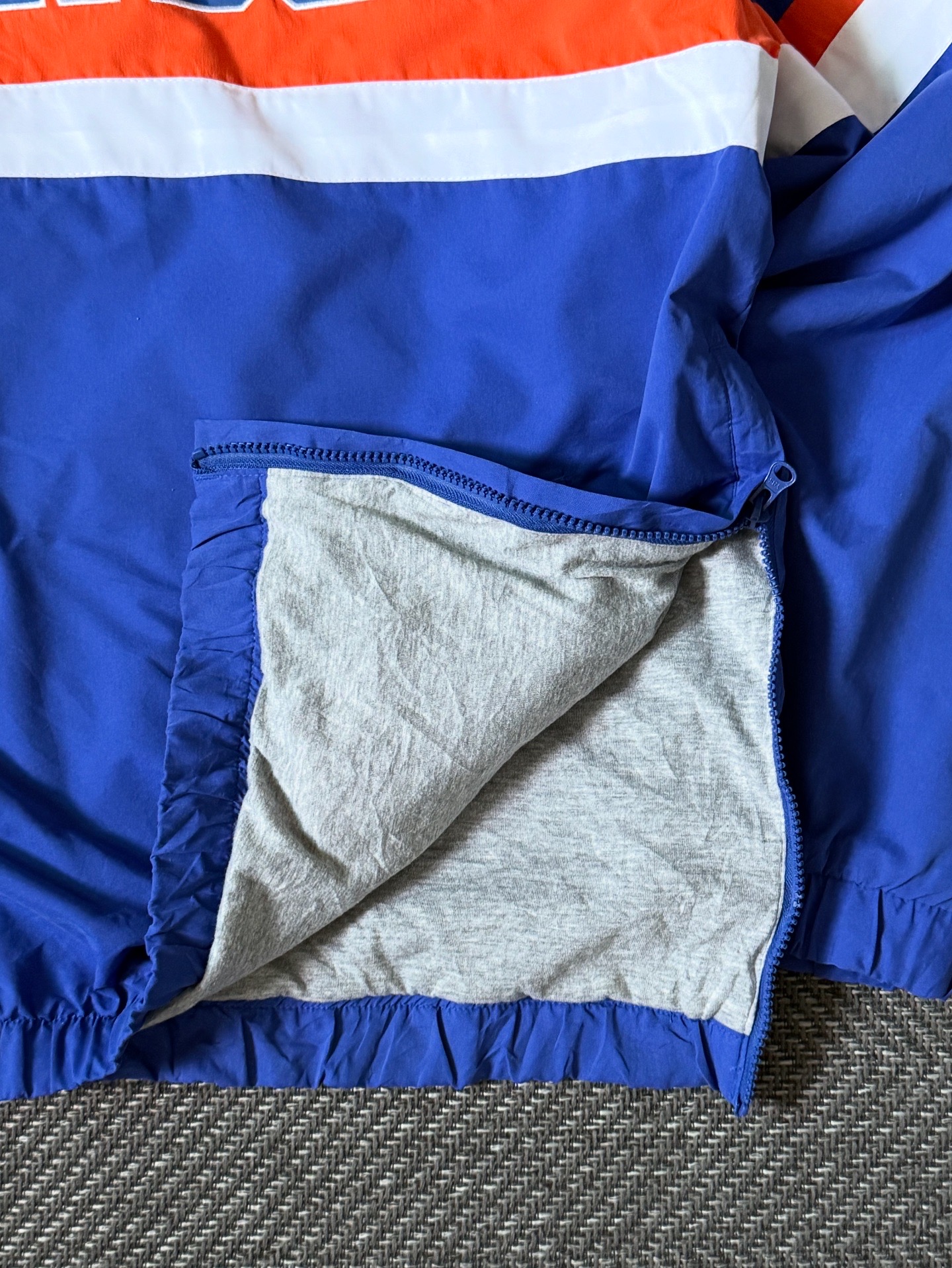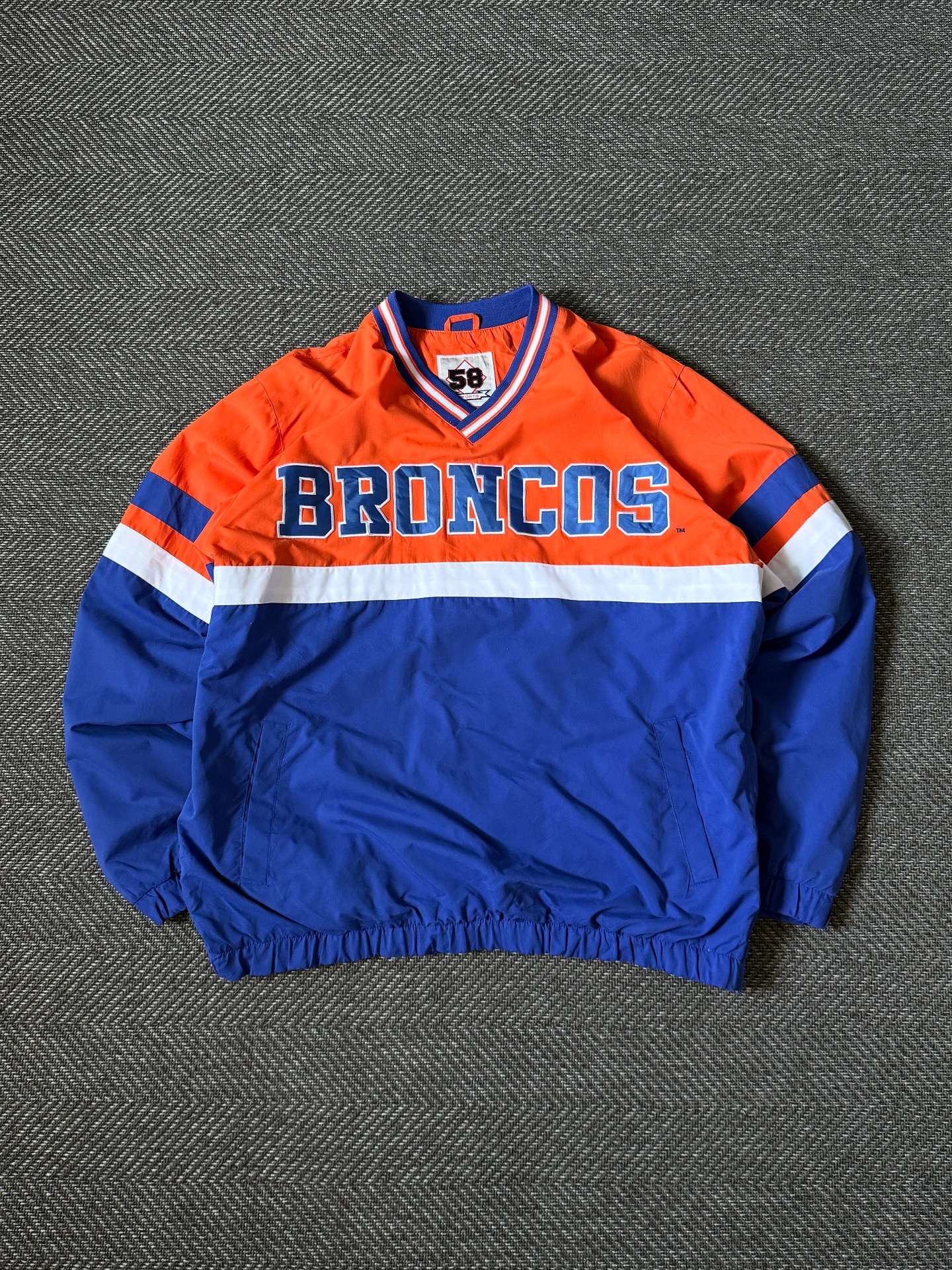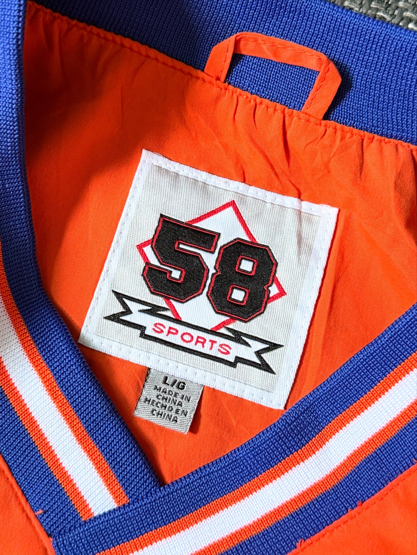 90~00년대 감성을 담은 58 SPORTS 제작 빈티지 바람막이 자켓입니다. 강렬한 오렌지 & 블루 배색이 특징이며, 전면에는 큼직한 BRONCOS 레터링 자수, 후면에는 팀 아이덴티티를 상징하는 Boise State 말 로고 프린트가 자리해 레트로 무드를 확실히 살려줍니다.