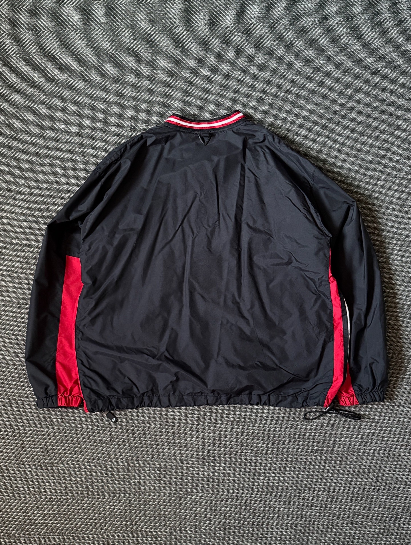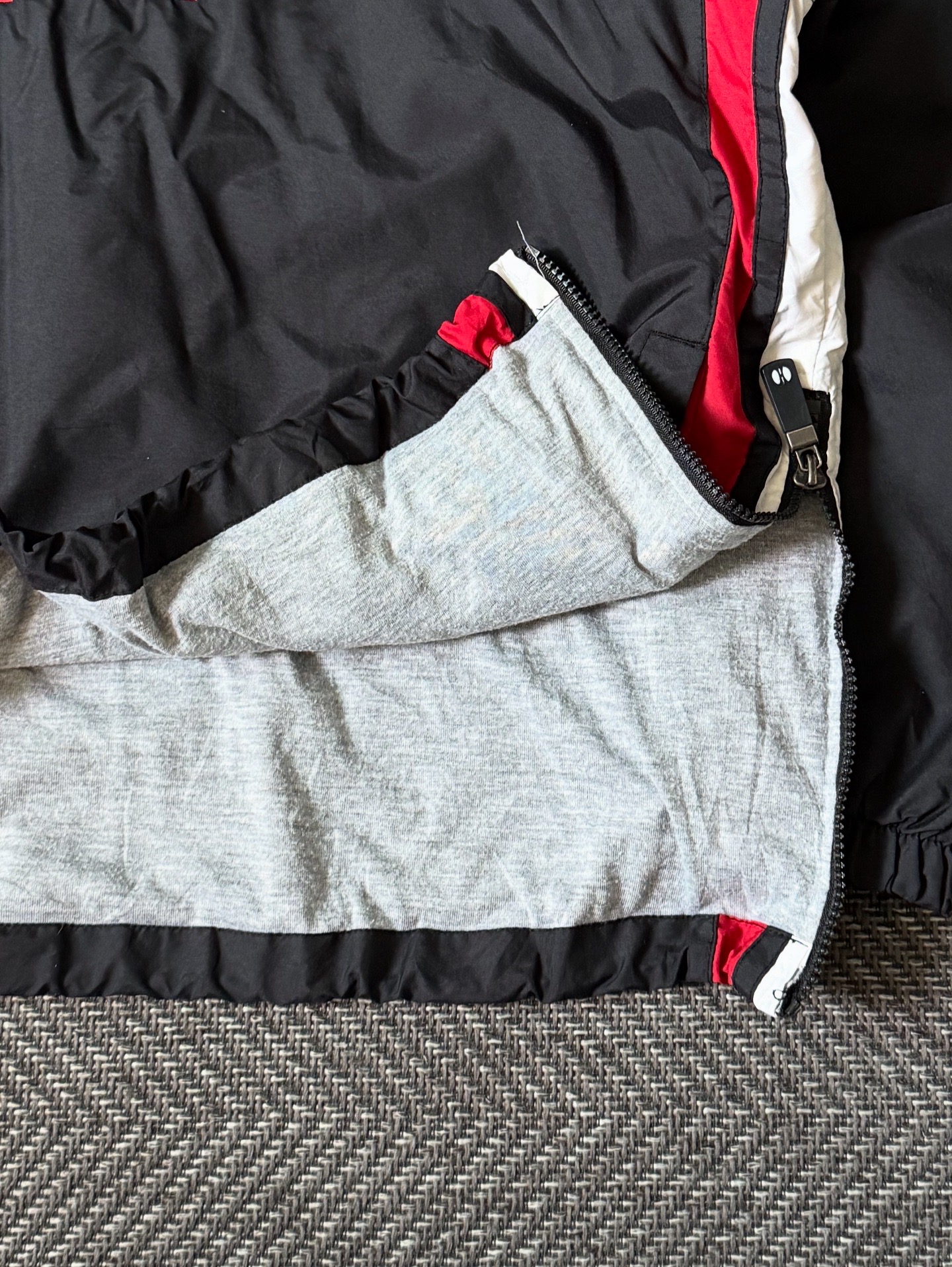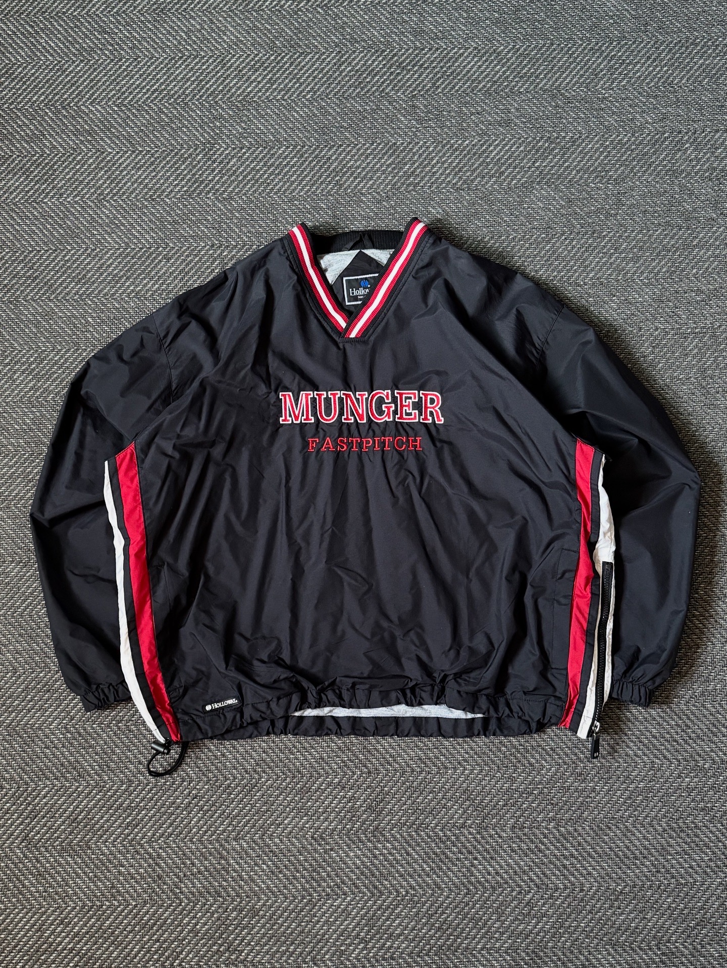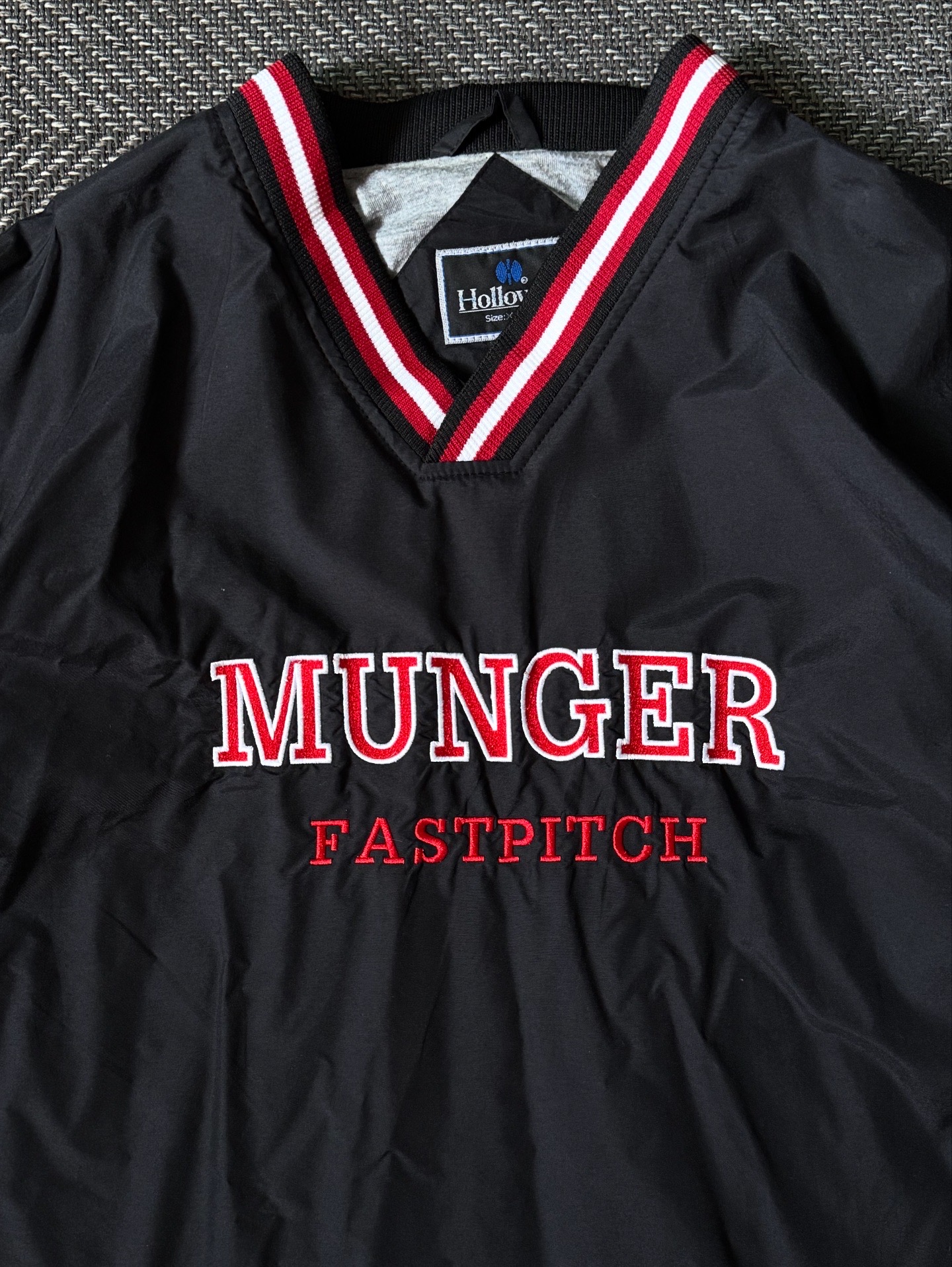 스포츠 팀웨어 전문 브랜드 Holloway에서 제작된 빈티지 바람막이 자켓입니다. 블랙을 베이스로 레드 & 화이트 배색 라인이 들어가 스포티한 감성을 살렸으며, 전면에는 Munger Fastpitch 자수가 큼직하게 새겨져 팀 아이덴티티를 강조합니다. 내피는 그레이 톤의 코튼 혼방으로 처리되어 착용감이 부드럽고, 측면 지퍼 디테일과 밑단 스트링으로 활동성과 핏 조절이 가능합니다.