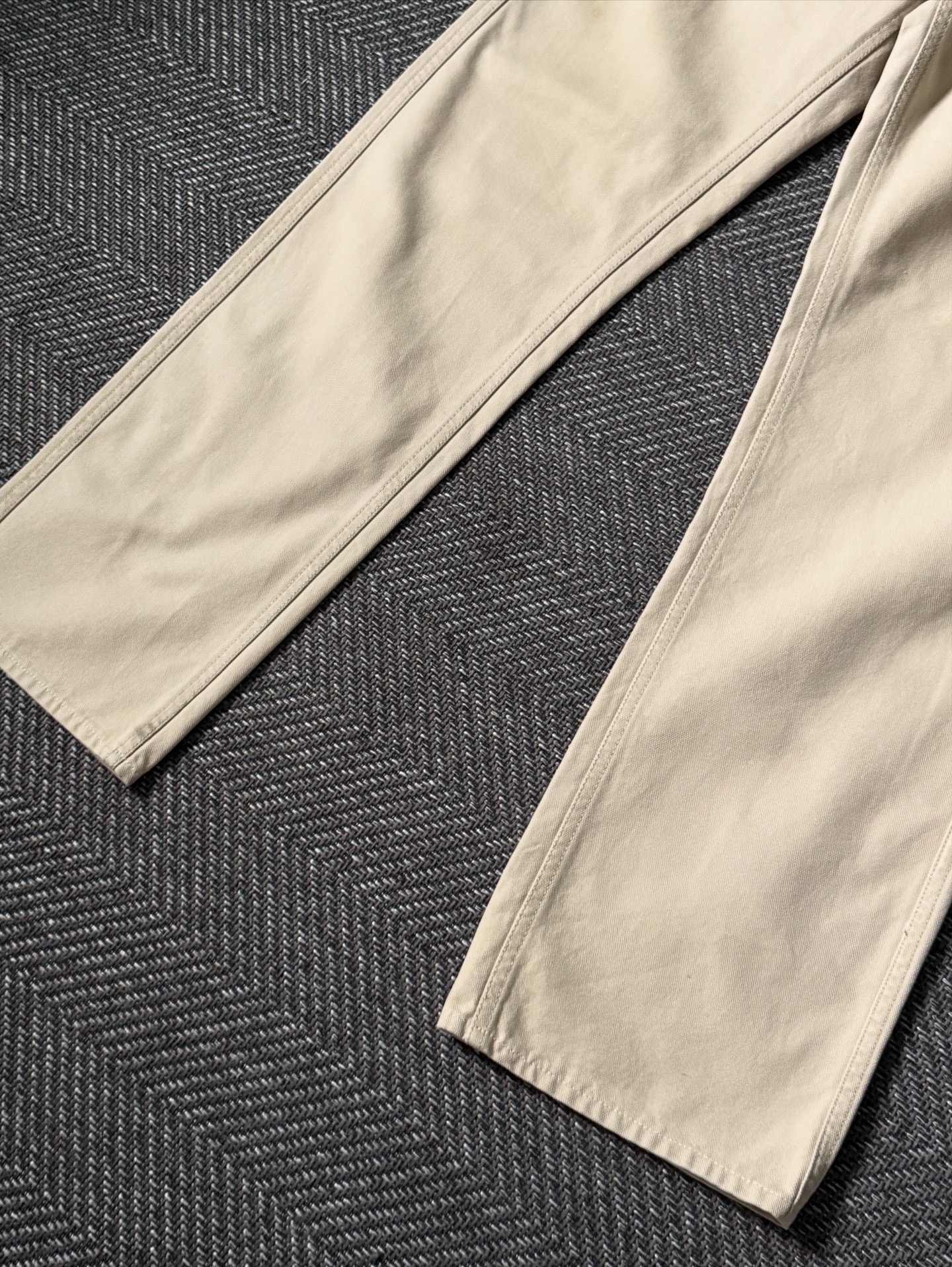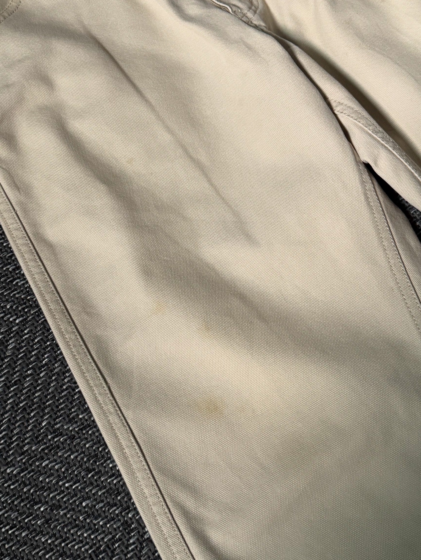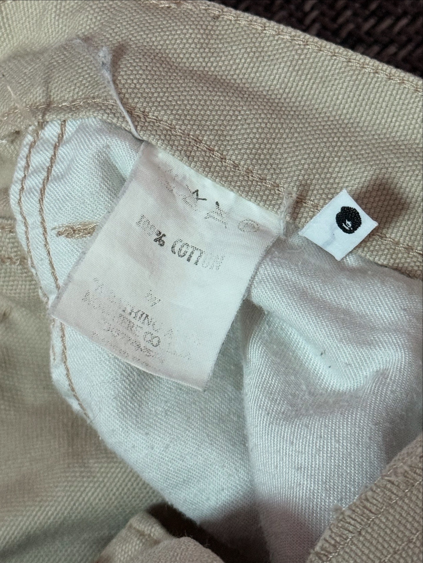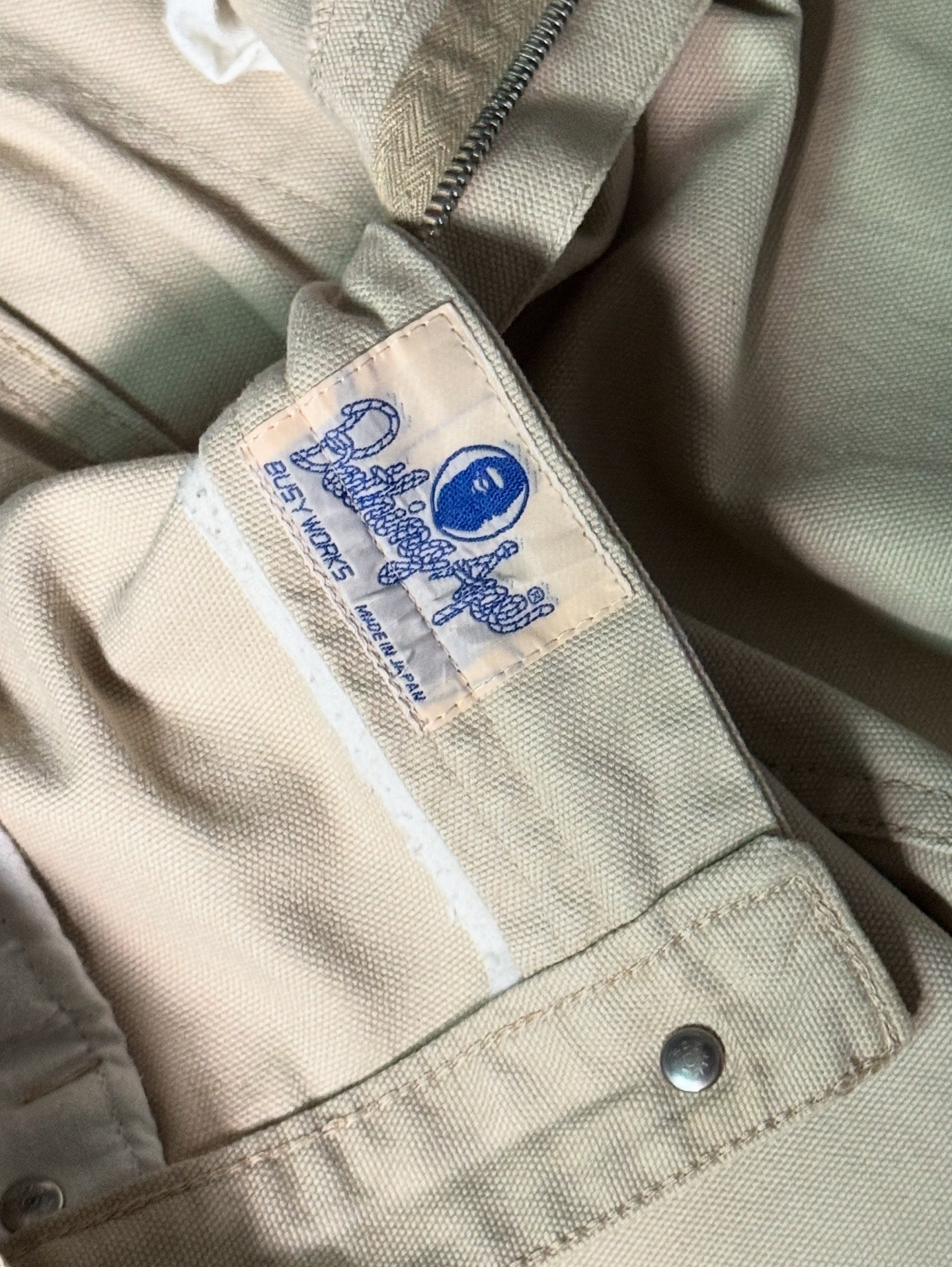 특히, 이 제품은 Wrangler(랭글러) 블루벨 라인을 오마주한 디자인 요소가 돋보입니다. 블루벨 택(Blue Bell Tag)과 후면 포켓 디테일, 리벳 구조 등에서 랭글러의 워크웨어 DNA를 차용하면서도, BAPE 특유의 그래픽 아이덴티티를 결합해 독창적인 매력을 완성했습니다. 100% 코튼 원단으로 제작되어 내구성이 뛰어나고, 베이지 컬러의 탄탄한 워크웨어 감성이 특징입니다. 사진에서 확인되듯이 부분적으로 미세한 오염이 존재하니 구매 시 참고 부탁드립니다.