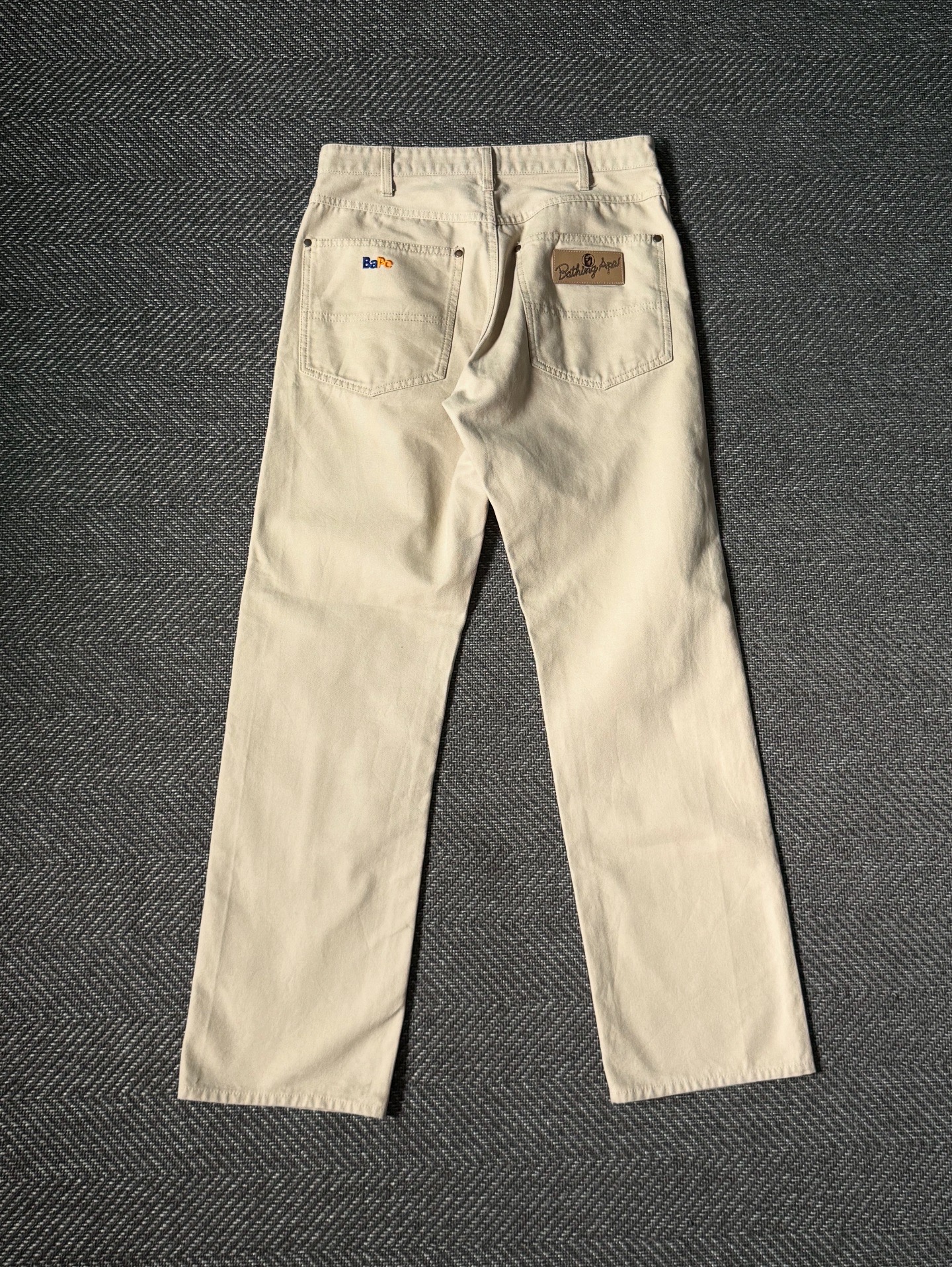 1990년대 후반에서 2000년대 초반에 제작된 것으로 추정되는 BAPE의 아이코닉한 빈티지 팬츠입니다. 후면 포켓에는 “BaPe” 자수와 A Bathing Ape 가죽 패치가 자리해 있으며, 당시 브랜드의 정체성을 잘 보여주는 디테일이 담겨 있습니다.