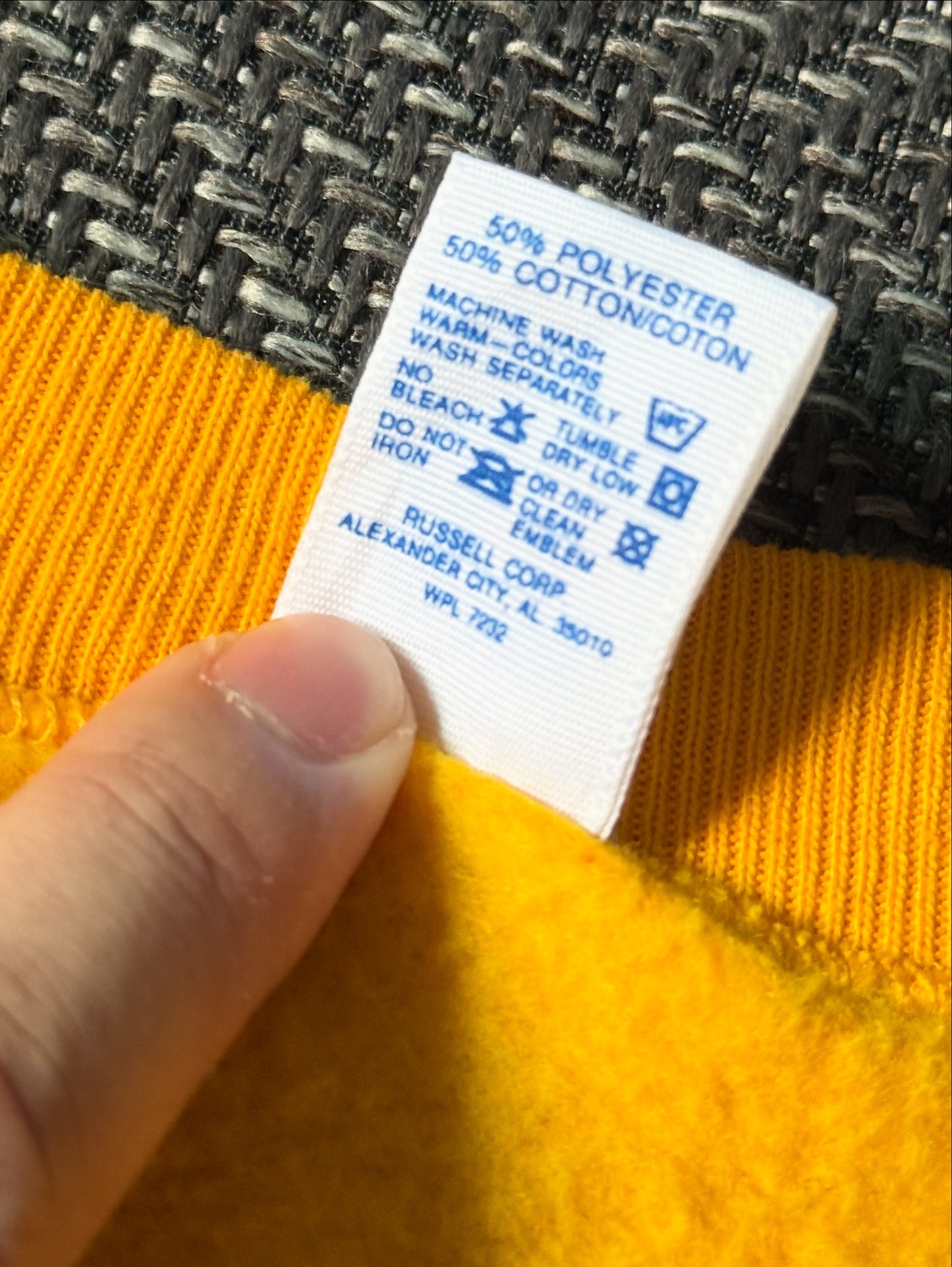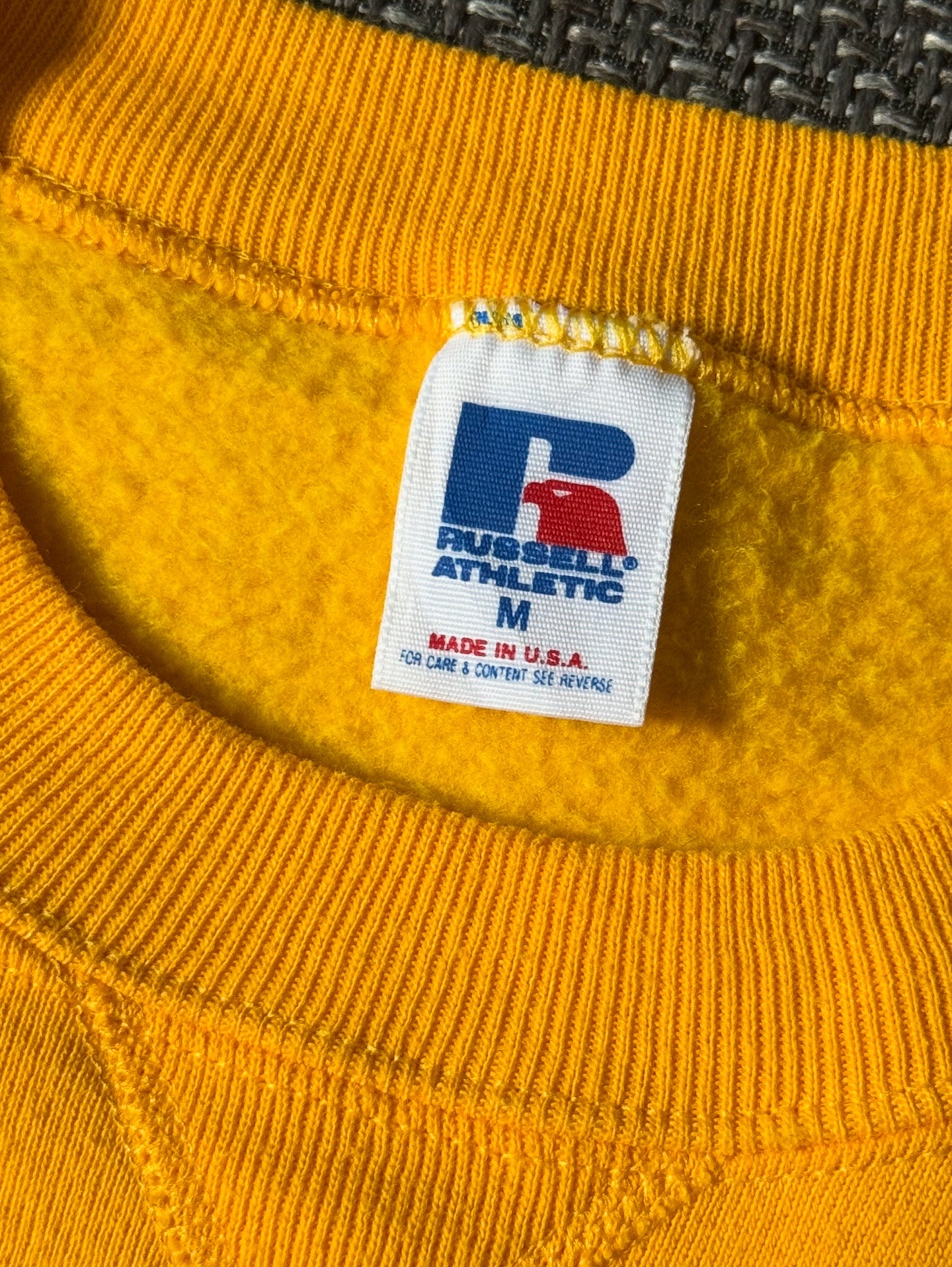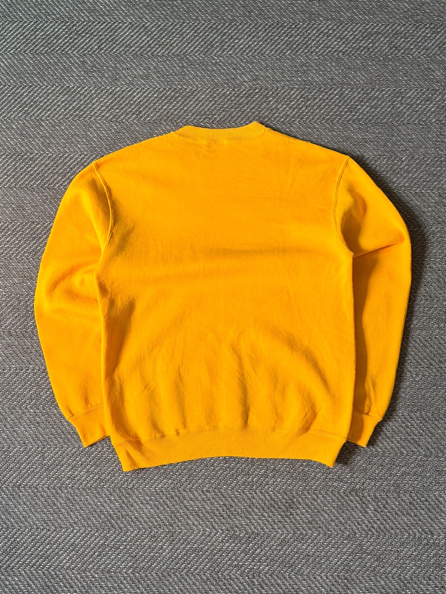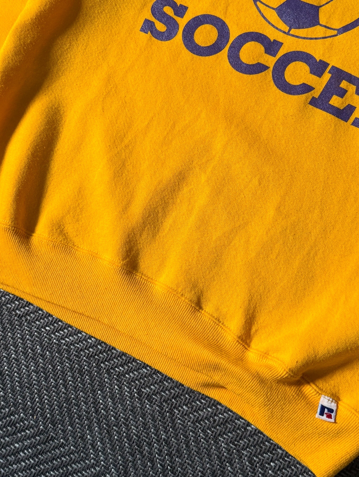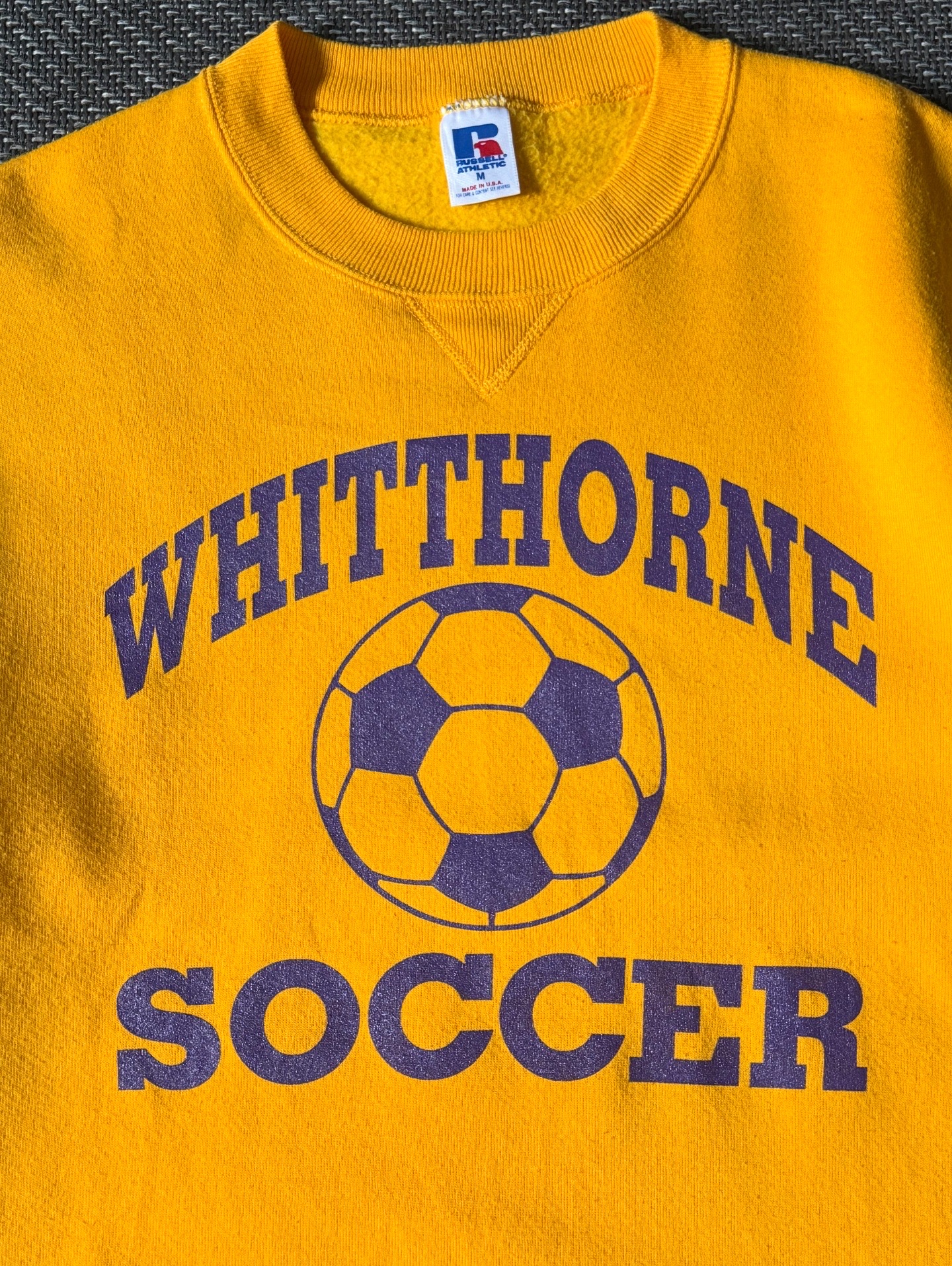 1990년대 제작된 Russell Athletic 빈티지 맨투맨입니다. 선명한 옐로우 바디에 퍼플 레터링과 축구공 그래픽이 조화를 이루는 WHITTHORNE SOCCER 프린팅이 특징입니다.