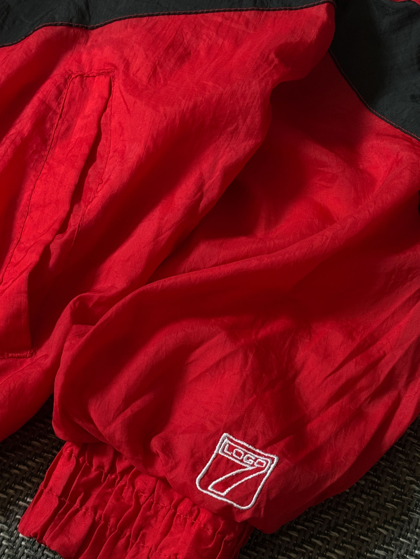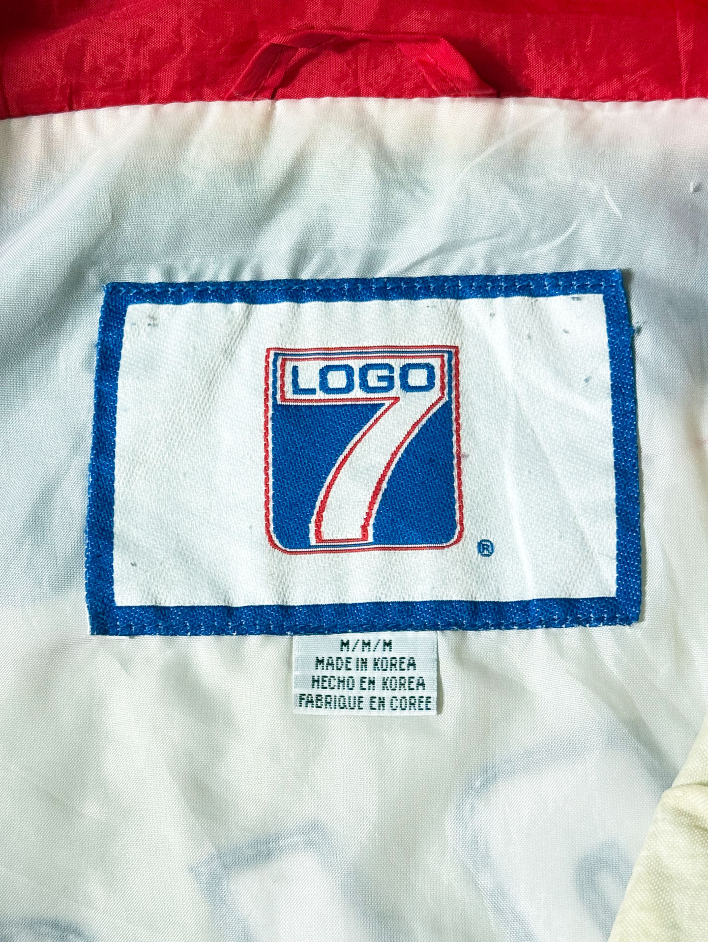 90년대 제작된 Nebraska Cornhuskers 컬리지 팀 빈티지 윈드브레이커 자켓입니다. 미국 스포츠팀 의류 전문 브랜드인 Logo 7에서 제작된 오리지널 제품으로, 당시 메이드 인 코리아(Made in Korea) 라벨이 달린 점이 특징적입니다.