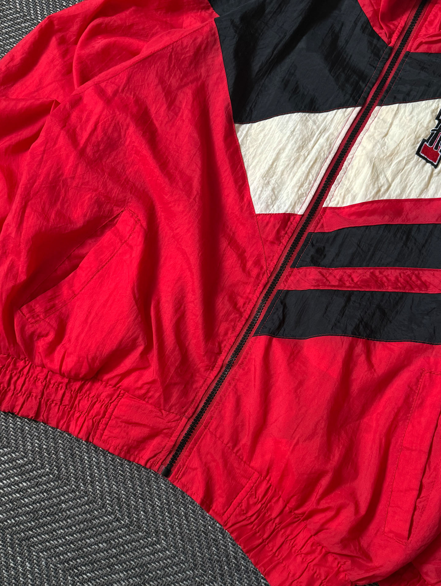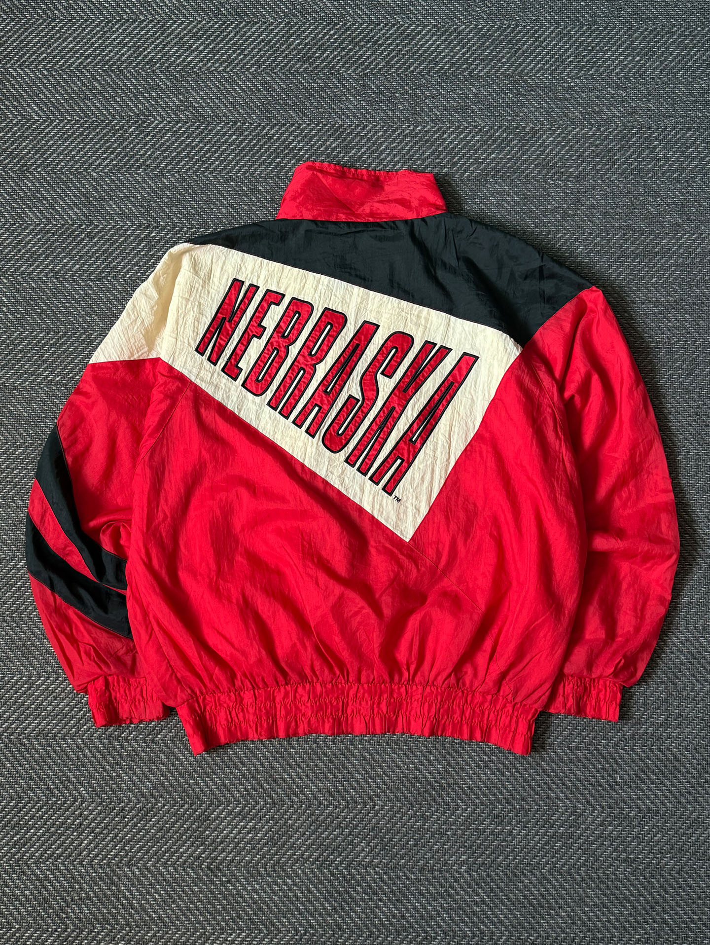 강렬한 레드, 블랙, 화이트의 컬러 블록 디자인과 전면에 자리 잡은 Nebraska "N" Huskers 로고 자수, 그리고 후면 전체를 가득 채운 NEBRASKA 빅 로고가 인상적입니다. 여유 있는 루즈핏 실루엣과 경량 나일론 원단으로, 90년대 특유의 스포티한 감성을 잘 보여줍니다.