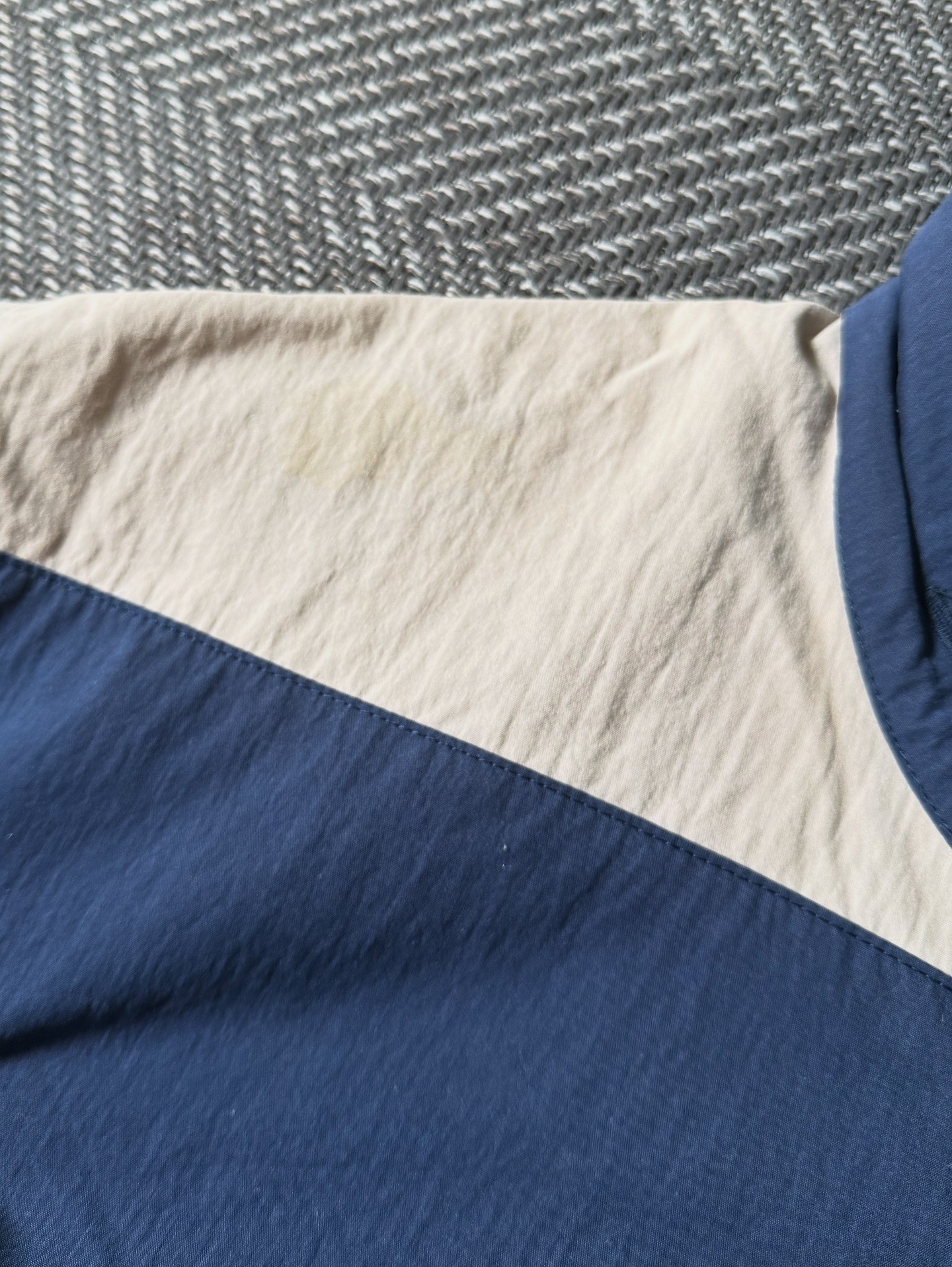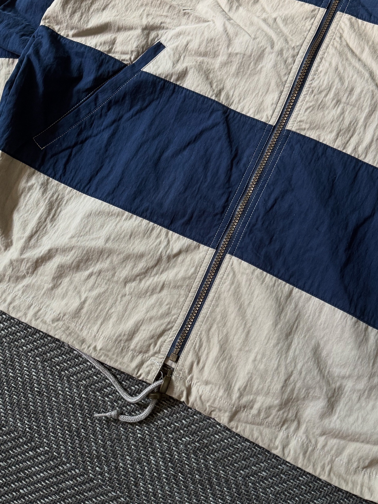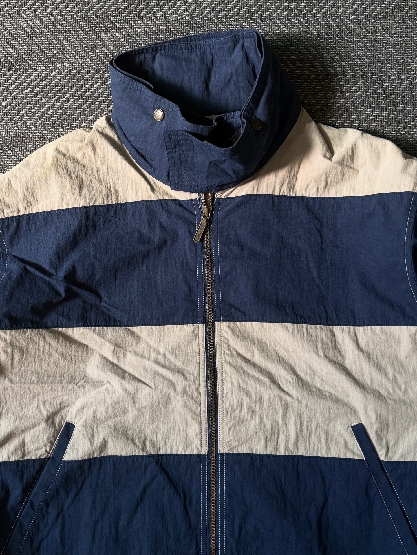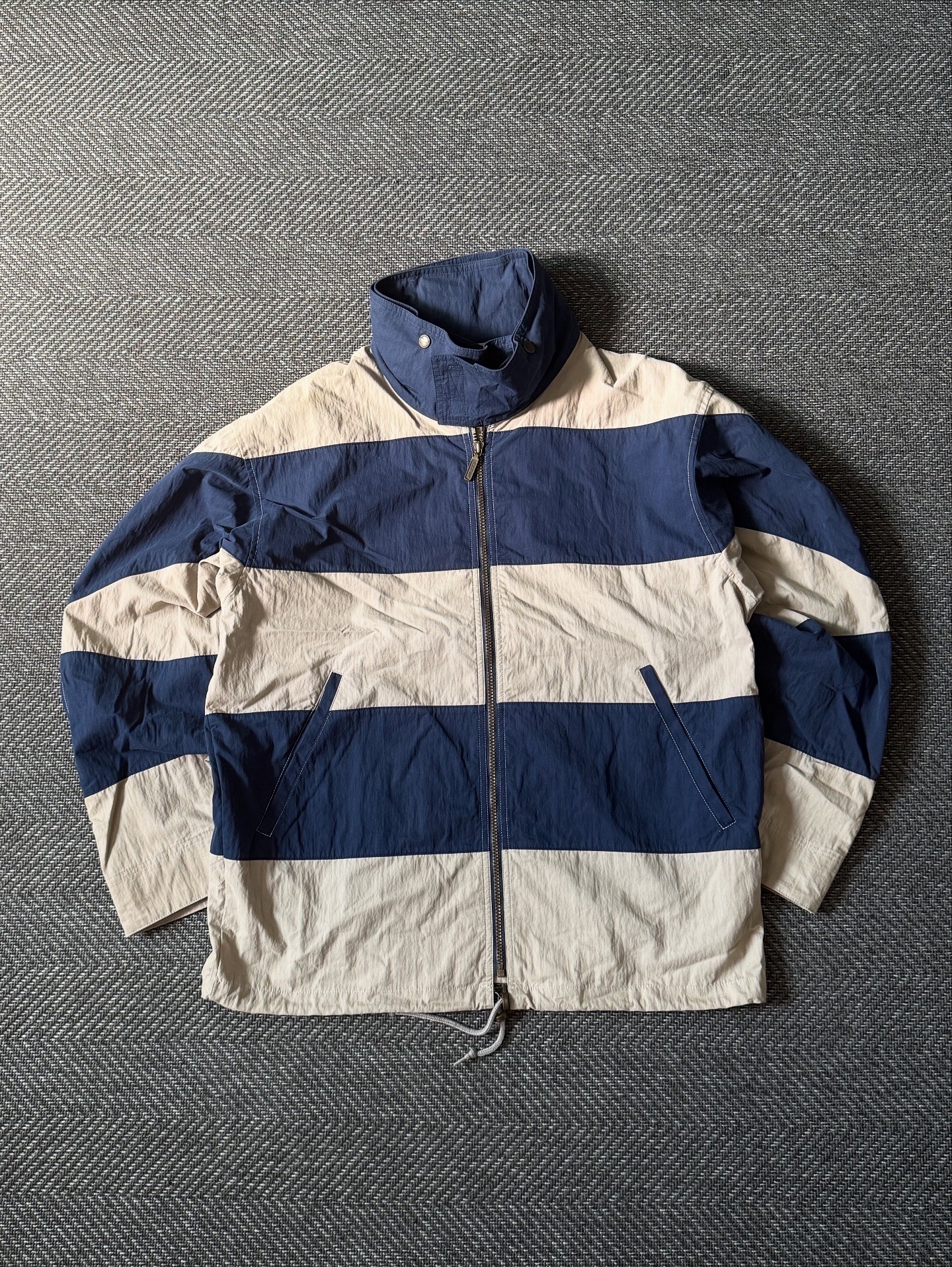 90년대 생산된 L.L.Bean 빈티지 윈드브레이커 자켓입니다. 네이비와 크림 컬러의 배색 스트라이프 디자인이 클래식하면서도 경쾌한 무드를 연출하며, 하이넥 스타일과 드로스트링 디테일로 실용성을 더했습니다. 빈티지 아이템답게 사진에서 보이듯 어깨 부분에 잘 눈에 띄지 않는 미세한 오염이 존재합니다. 전체적으로는 깔끔한 컨디션을 유지하고 있어 일상적인 캐주얼 착용에 멋스럽게 활용할 수 있는 제품입니다. 실측 105-108 정도 되는 사이즈감입니다.