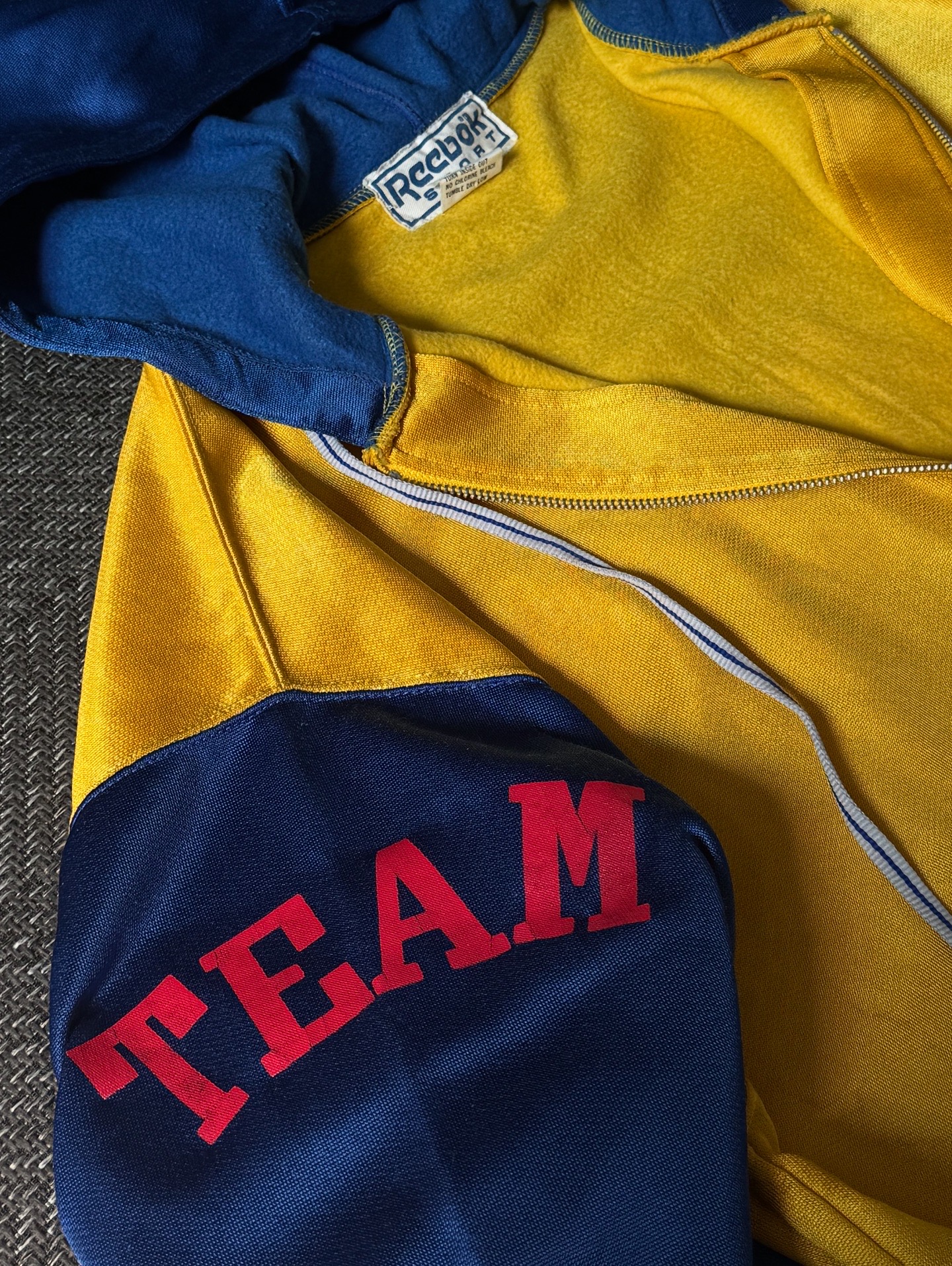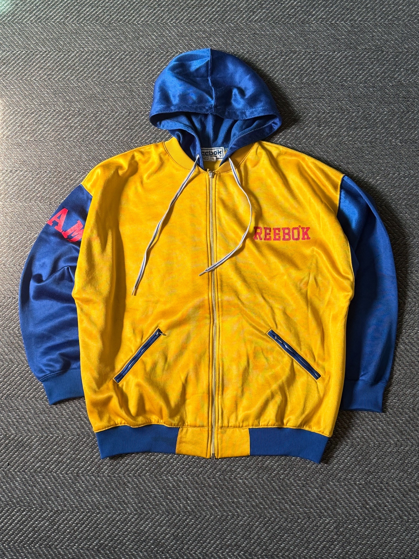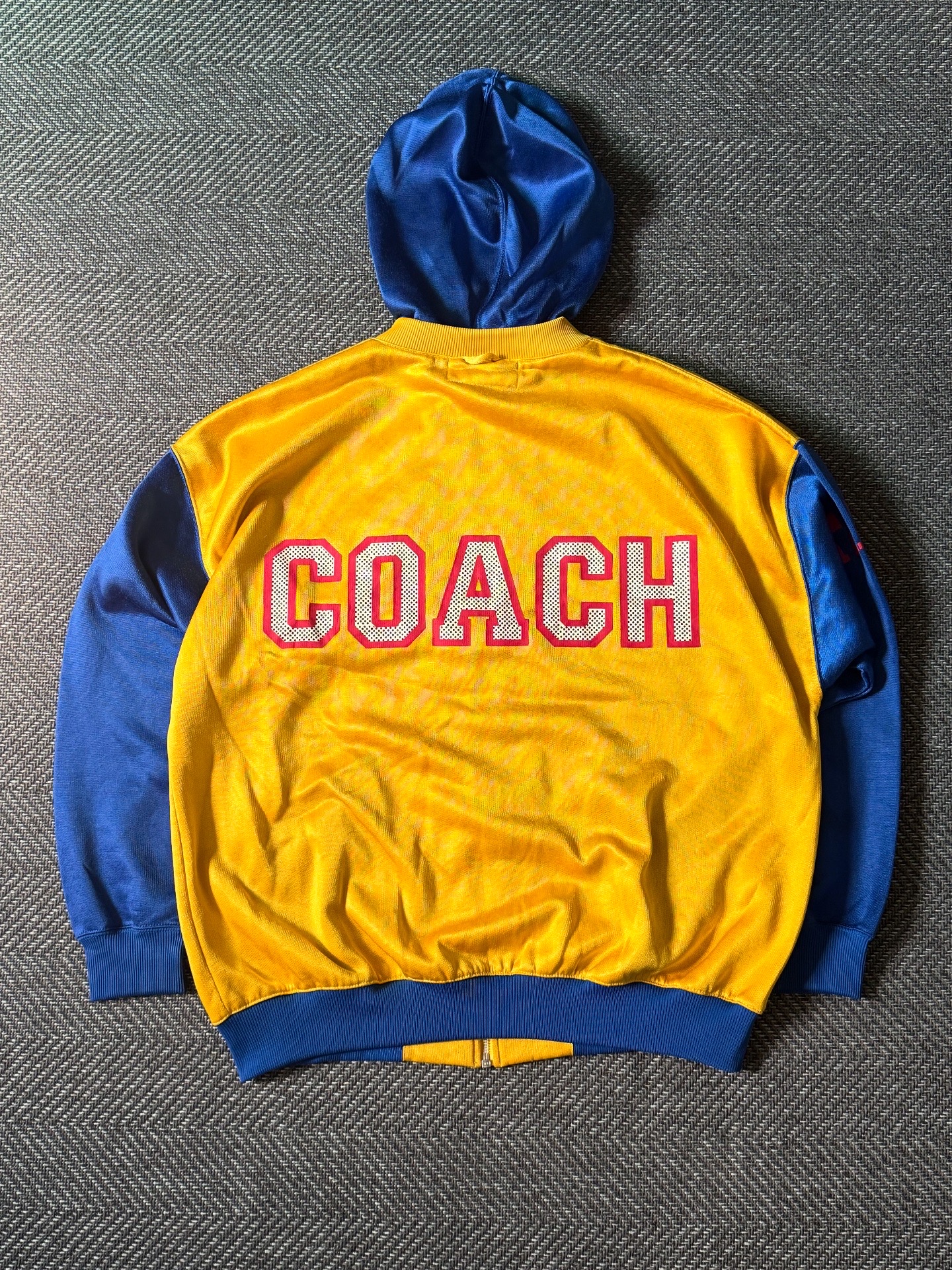 90년대 초반 대만에서 제작된 Reebok Sport 빈티지 후드 집업 자켓입니다. 옐로우와 블루의 강렬한 배색이 돋보이며, 전면에는 REEBOK 레터링, 후면에는 큼직한 COACH 프린팅, 소매에는 TEAM 레터링이 더해져 올드스쿨하면서도 스포티한 무드를 잘 담아낸 아이템입니다. 폴리에스터와 코튼 혼방 소재로 특유의 빈티지한 질감과 편안한 착용감을 느낄 수 있습니다. 사진상 보이는 미세한 오염은 존재하지만 전체적으로는 양호한 컨디션을 유지하고 있으며, 빈티지 특유의 멋스러움을 살려주는 매력적인 제품입니다. 실측 105-110 정도 되는 사이즈입니다.