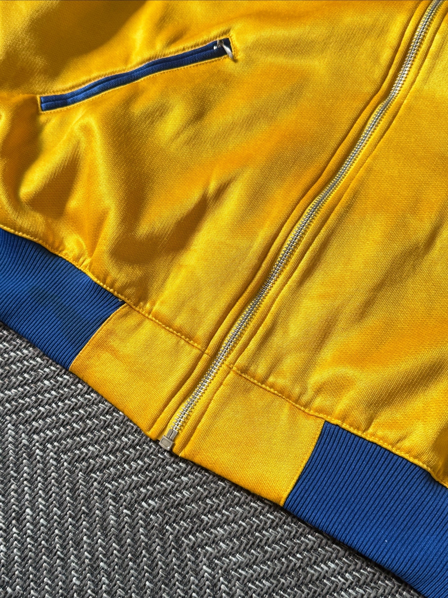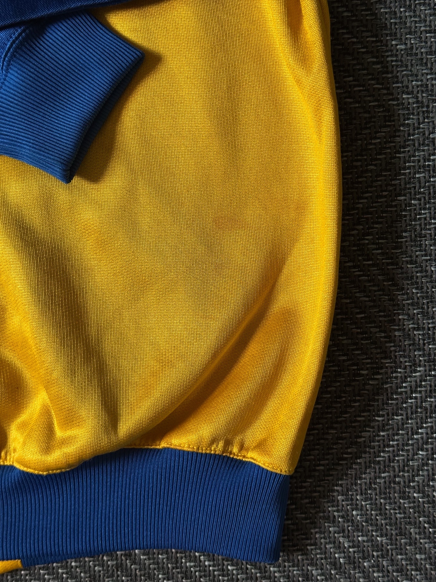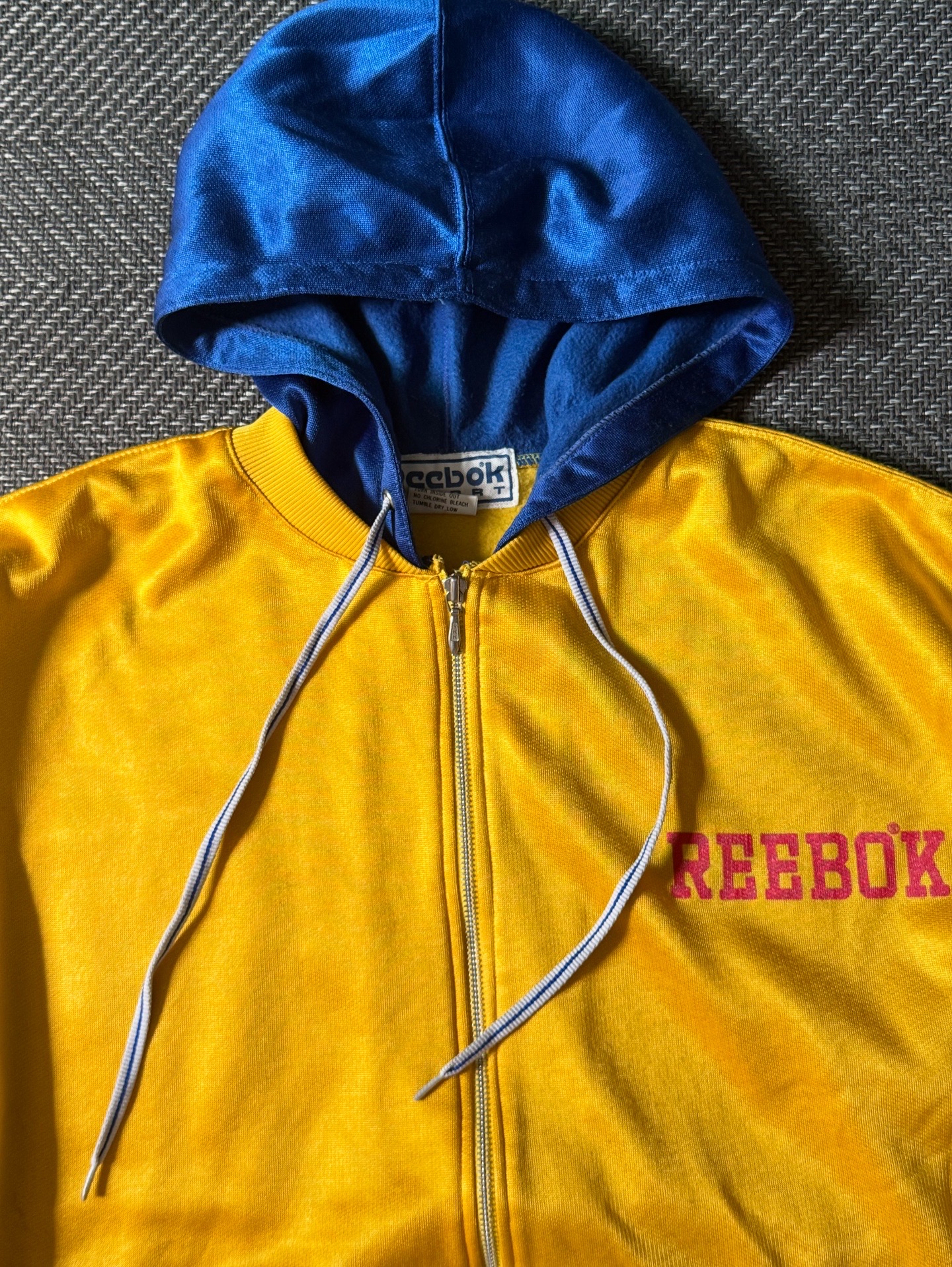 90년대 초반 대만에서 제작된 Reebok Sport 빈티지 후드 집업 자켓입니다. 옐로우와 블루의 강렬한 배색이 돋보이며, 전면에는 REEBOK 레터링, 후면에는 큼직한 COACH 프린팅, 소매에는 TEAM 레터링이 더해져 올드스쿨하면서도 스포티한 무드를 잘 담아낸 아이템입니다. 폴리에스터와 코튼 혼방 소재로 특유의 빈티지한 질감과 편안한 착용감을 느낄 수 있습니다. 사진상 보이는 미세한 오염은 존재하지만 전체적으로는 양호한 컨디션을 유지하고 있으며, 빈티지 특유의 멋스러움을 살려주는 매력적인 제품입니다. 실측 105-110 정도 되는 사이즈입니다.