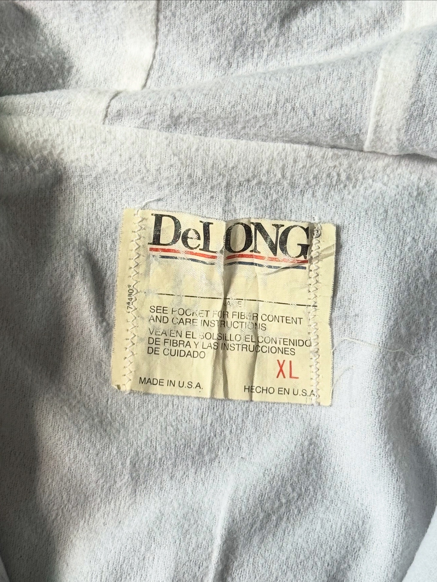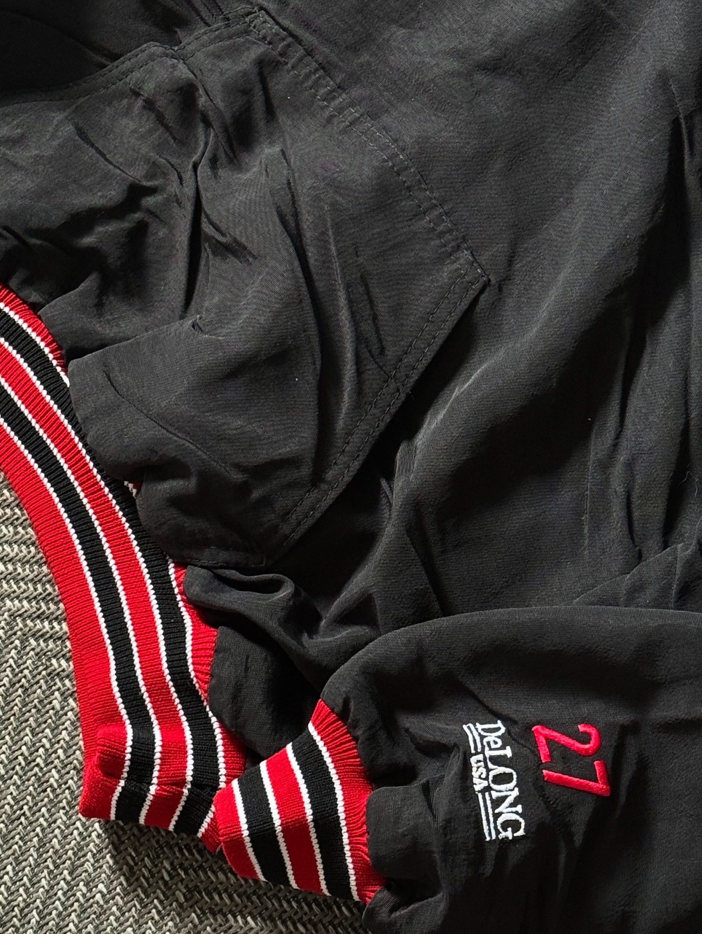 미국 DeLONG 사에서 제작된 90년대 빈티지 후드 아노락 자켓입니다. 블랙 컬러를 기반으로, 소매와 밑단에 레드·화이트·블랙 배색의 스트라이프 리브가 들어가 스포티한 무드를 강조하며, 프런트에는 "A" 로고와 함께 Rockets 팀의 아이코닉한 자수 디테일이 더해져 있습니다. 후드와 전면 지퍼 디테일이 더해져 활용도가 높고, 뒷면에는 큼지막한 "ROCKETS" 레터링 자수가 들어가 존재감을 살려줍니다. 미국 생산(Made in U.S.A.)으로 당시 특유의 올드스쿨 감성과 팀자켓 분위기를 잘 보여주는 아이템이며, 전체적으로 하자 없는 양호한 컨디션을 유지하고 있습니다. 실측 105-110 정도 되는 사이즈감입니다.