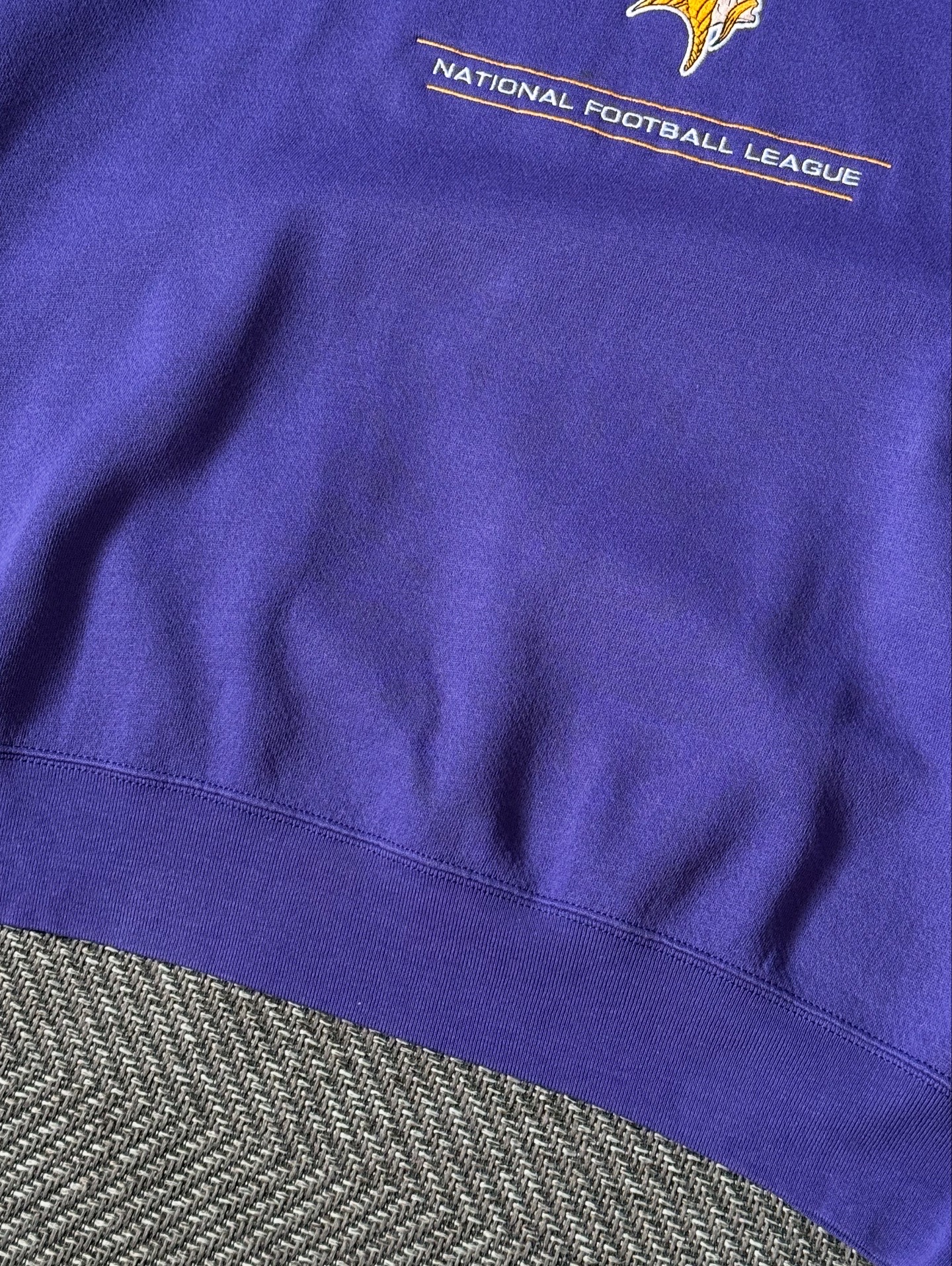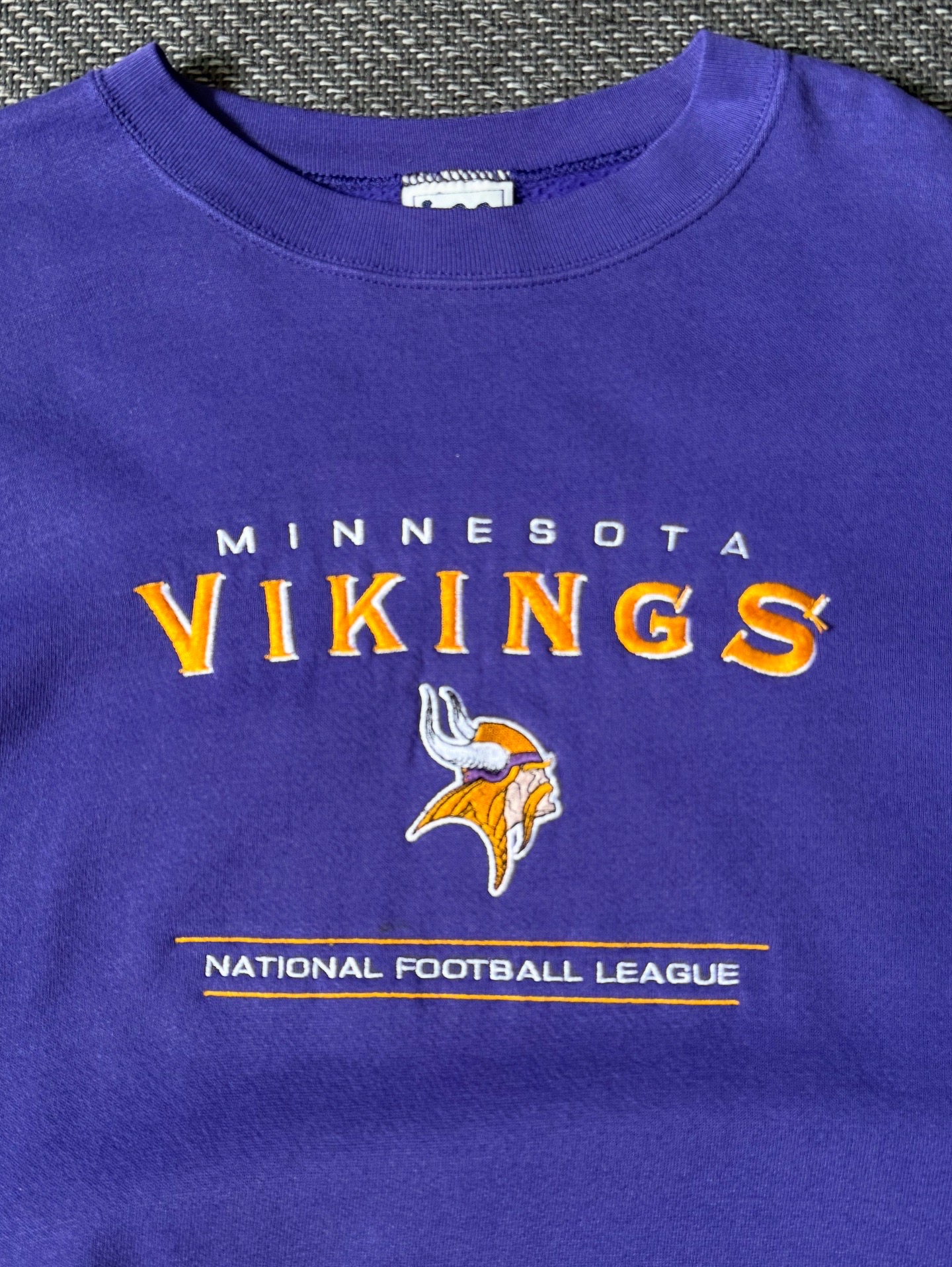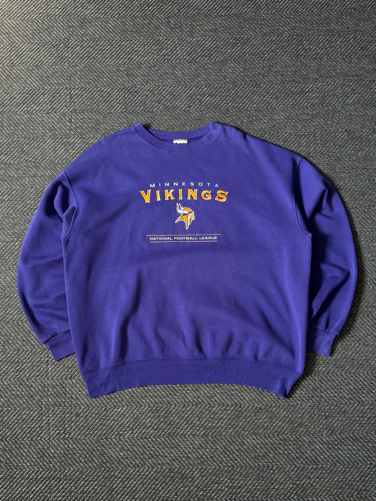 90년대에 제작된 Lee Sport 빈티지 미네소타 바이킹스 스웻셔츠입니다. 퍼플 바디에 옐로우 & 화이트 컬러로 자수 처리된 VIKINGS 로고와 팀 엠블럼이 인상적으로 자리 잡아, 올드스쿨한 스포츠 무드를 한층 더 살려줍니다.