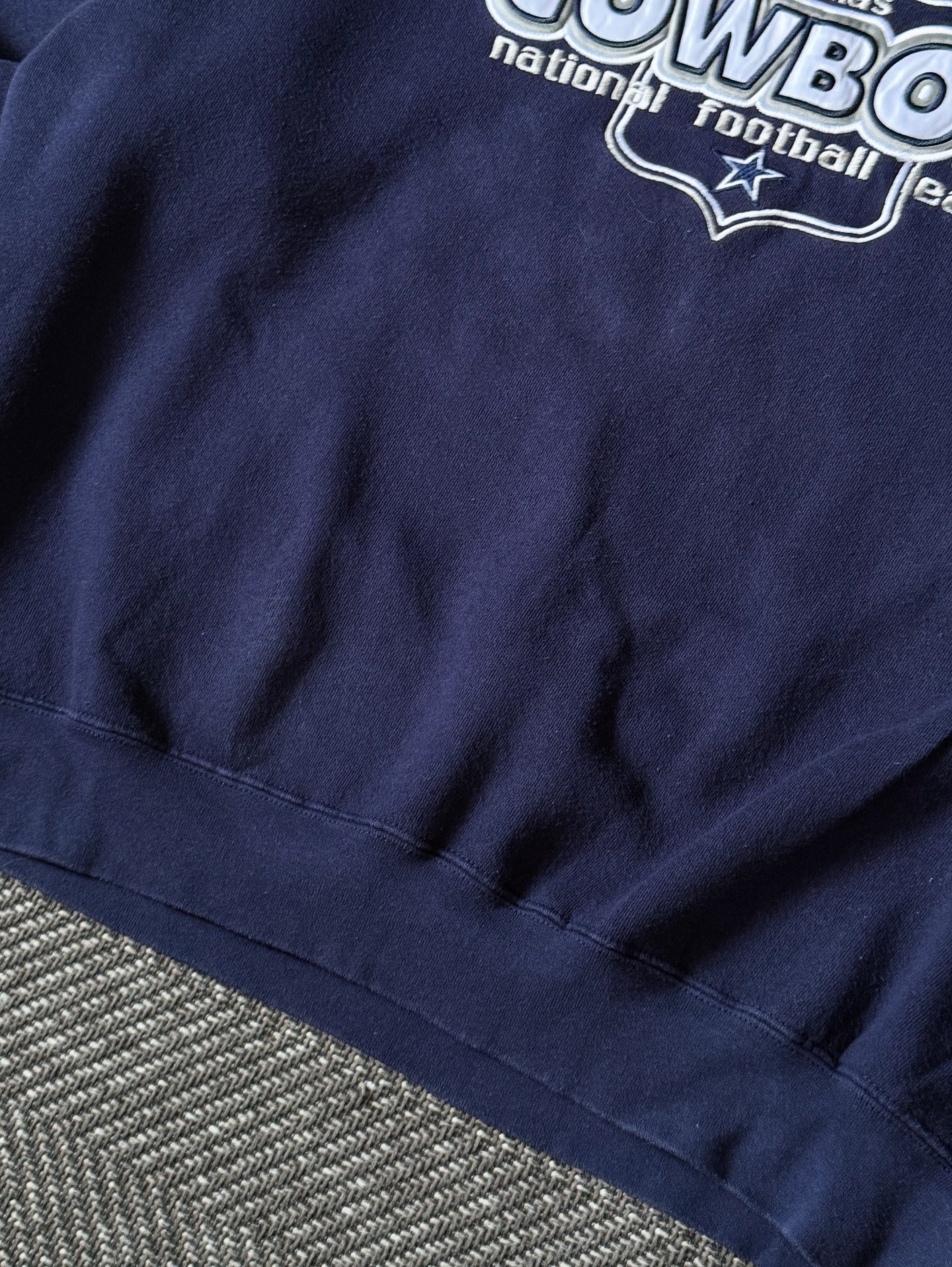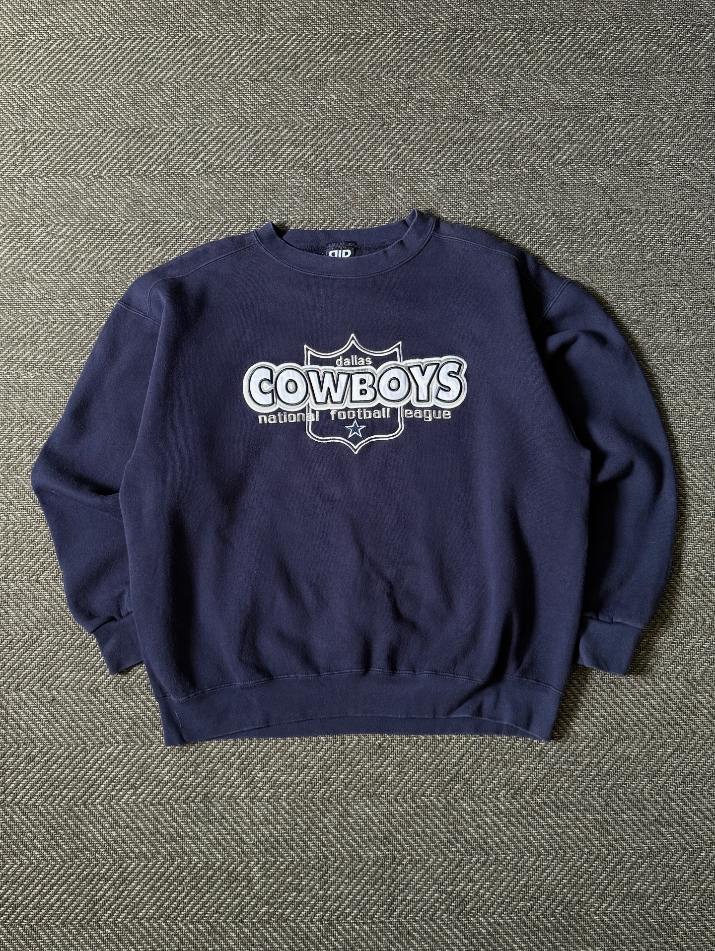 90년대 AID WORLD 사에서 제작된 Dallas Cowboys NFL 빈티지 스웻셔츠입니다. 네이비 컬러 바탕에 팀 로고와 레터링이 입체 자수로 들어가 있어 스포티하면서도 클래식한 매력을 보여줍니다. 빈티지 특유의 자연스러운 워싱감과 편안한 착용감이 특징이며, 올드스쿨한 감성을 좋아하시는 분들께 잘 어울리는 아이템입니다. 미국 스포츠 빈티지 웨어 특유의 캐주얼한 무드를 선호하시는 분들께 추천드립니다. 실측 105-108 정도 되는 사이즈감입니다.