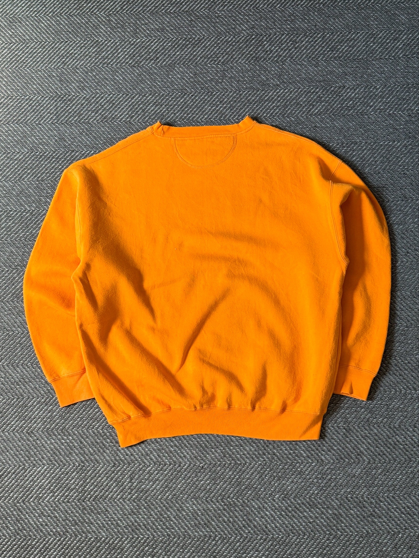 90대 Team Edition Apparel 제작의 Tennessee Volunteers 스웻셔츠입니다. 비비드하면서도 빈티지하게 물빠진 듯한 오렌지 컬러감이 돋보이며, 전면의 TENNESSEE 아치형 레터링 나염이 아이코닉한 분위기를 만들어줍니다. 넉넉한 실루엣과 클래식한 V-가젯 디테일이 더해져 캐주얼하면서도 빈티지 스포츠웨어 특유의 매력을 살려줍니다. 대학 스포츠 컬처를 상징하는 디자인으로, 단품만으로도 강한 포인트가 되는 아이템입니다. 하자없는 양호한 컨디션이며, 실측 105-110 정도 되는 사이즈입니다.