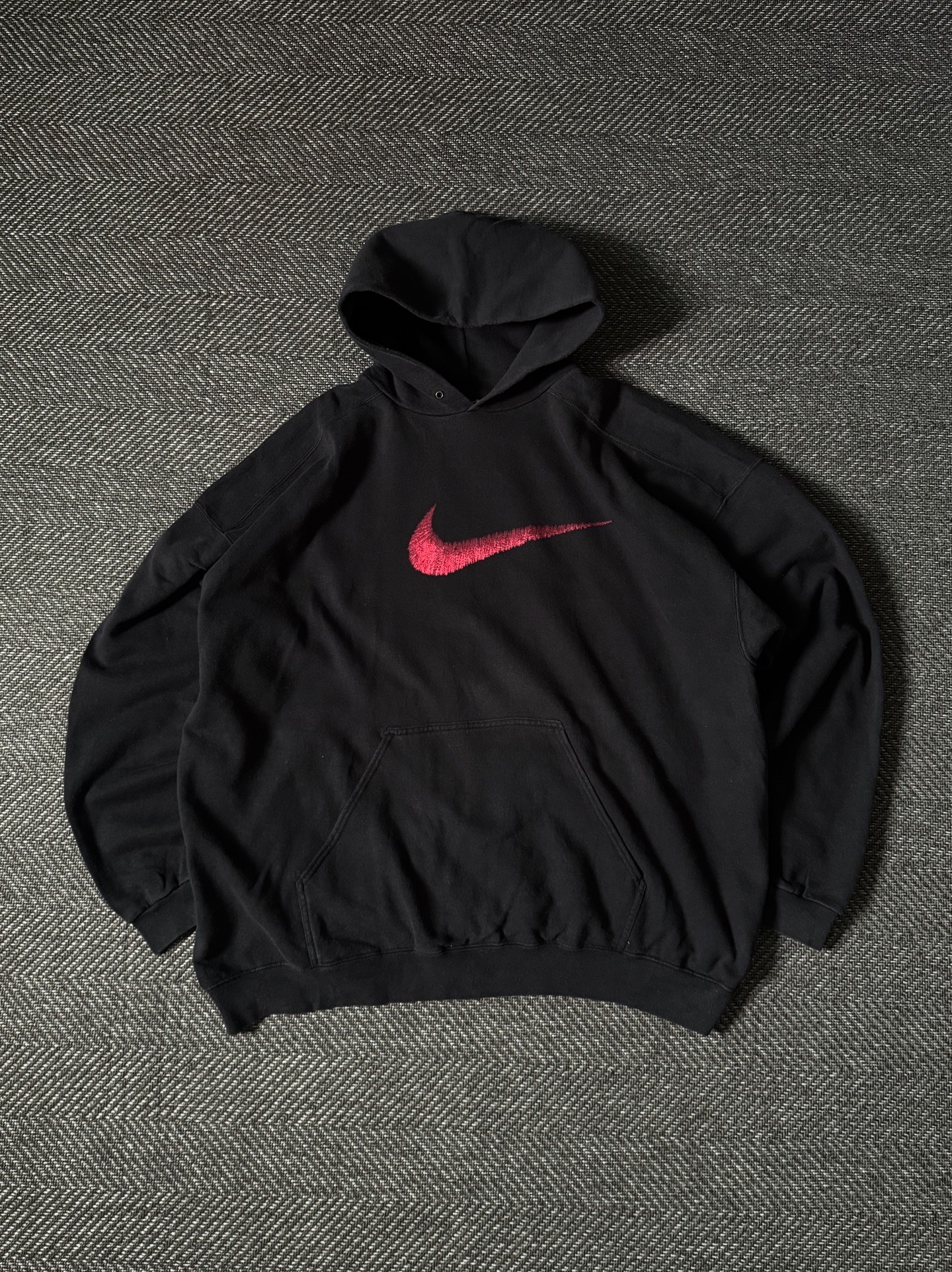 90년대 생산된 Nike 빈티지 블랙 후드로, 전면에 레드 스우시 로고가 돋보이는 디자인입니다. Made in USA 제품으로 95% Cotton, 5% Polyester 혼방 원단을 사용했으며, 안감은 기모 처리되어 따뜻하면서도 빈티지 특유의 감성이 살아있습니다.