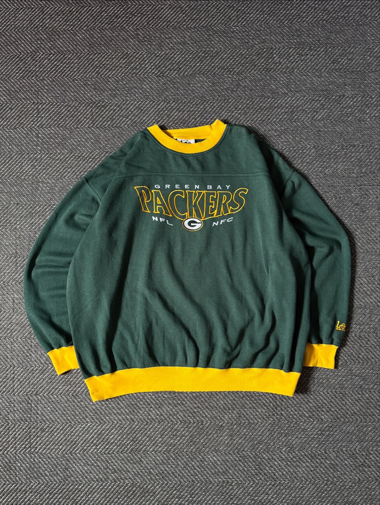 90년대 제작된 Lee Sport 그린베이 패커스 스웻셔츠입니다. 팀 컬러인 그린과 옐로우의 배색이 돋보이며, 전면의 대형 Packers 로고 자수가 강렬한 인상을 주는 제품입니다. 넥라인과 소매, 밑단의 옐로우 립 디테일이 전체적인 빈티지 감성을 더욱 강조해줍니다.