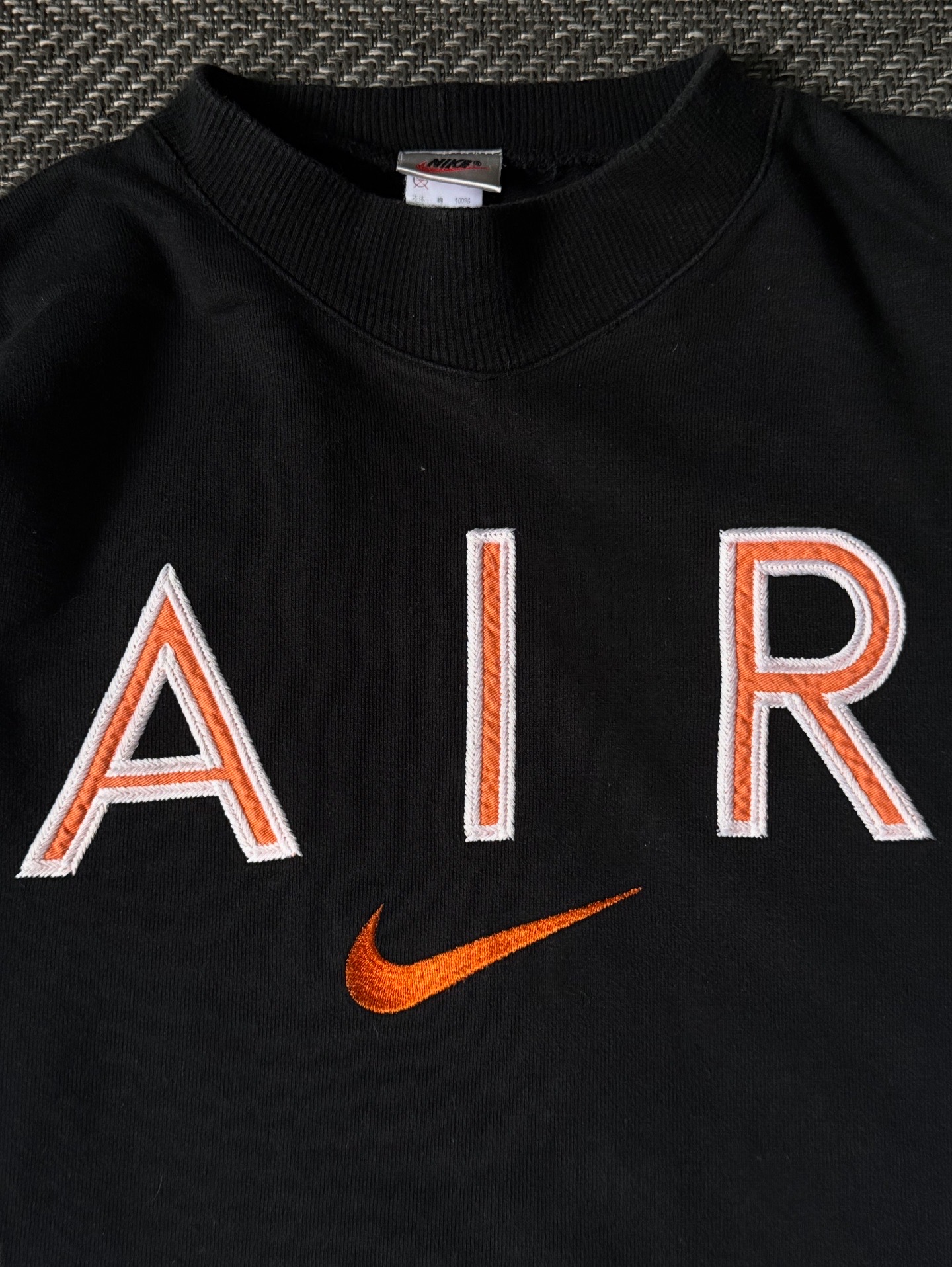 90년대 제작된 나이키 빈티지 스웻셔츠로, 전면에 대형 "AIR" 로고와 오렌지 스우시 자수가 더해져 존재감을 드러내는 아이템입니다.