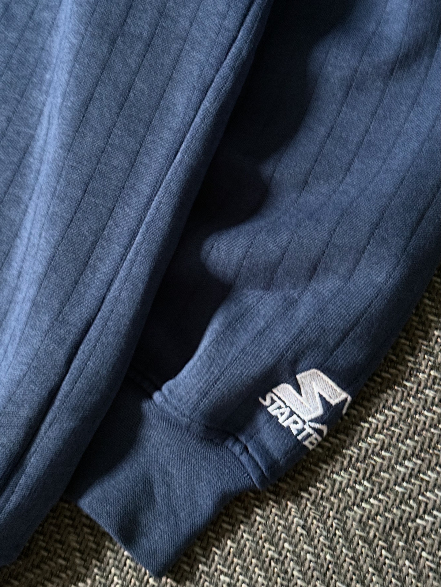 리브드 패턴의 네이비 원단은 클래식한 무드를 연출하며, 소매에는 Starter 로고 자수가 더해져 브랜드 아이덴티티를 강조하고 있습니다. 폴리에스터와 코튼 혼방 소재로 제작되어 내구성과 착용감이 우수하며, 오버핏 실루엣으로 빈티지한 감성을 한층 살려주는 제품입니다. 실측 110 이상 입으시는분에게 추천드리는 사이즈입니다.