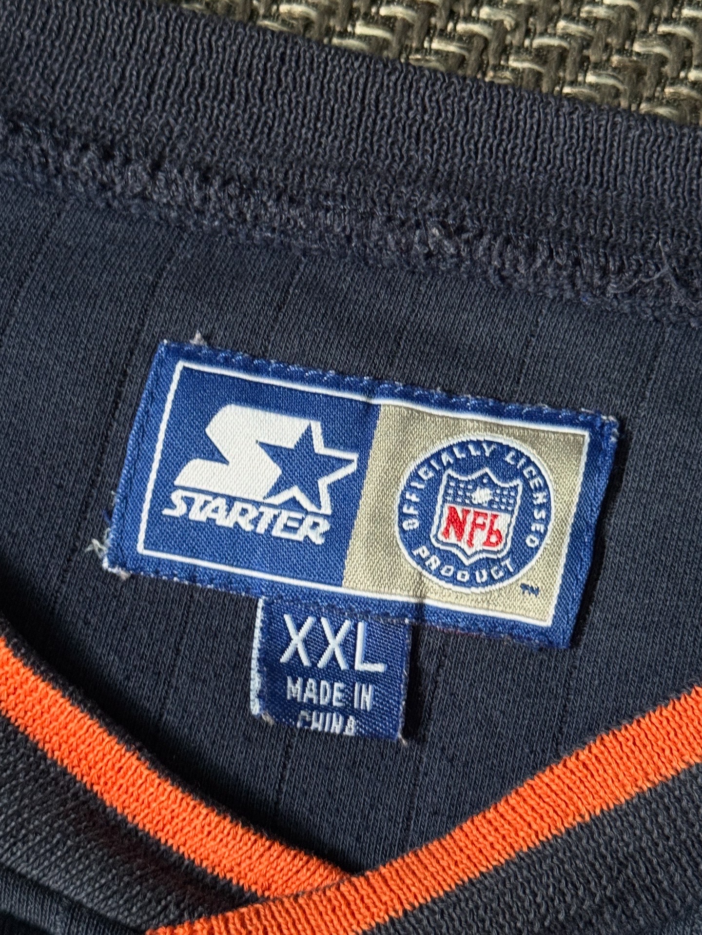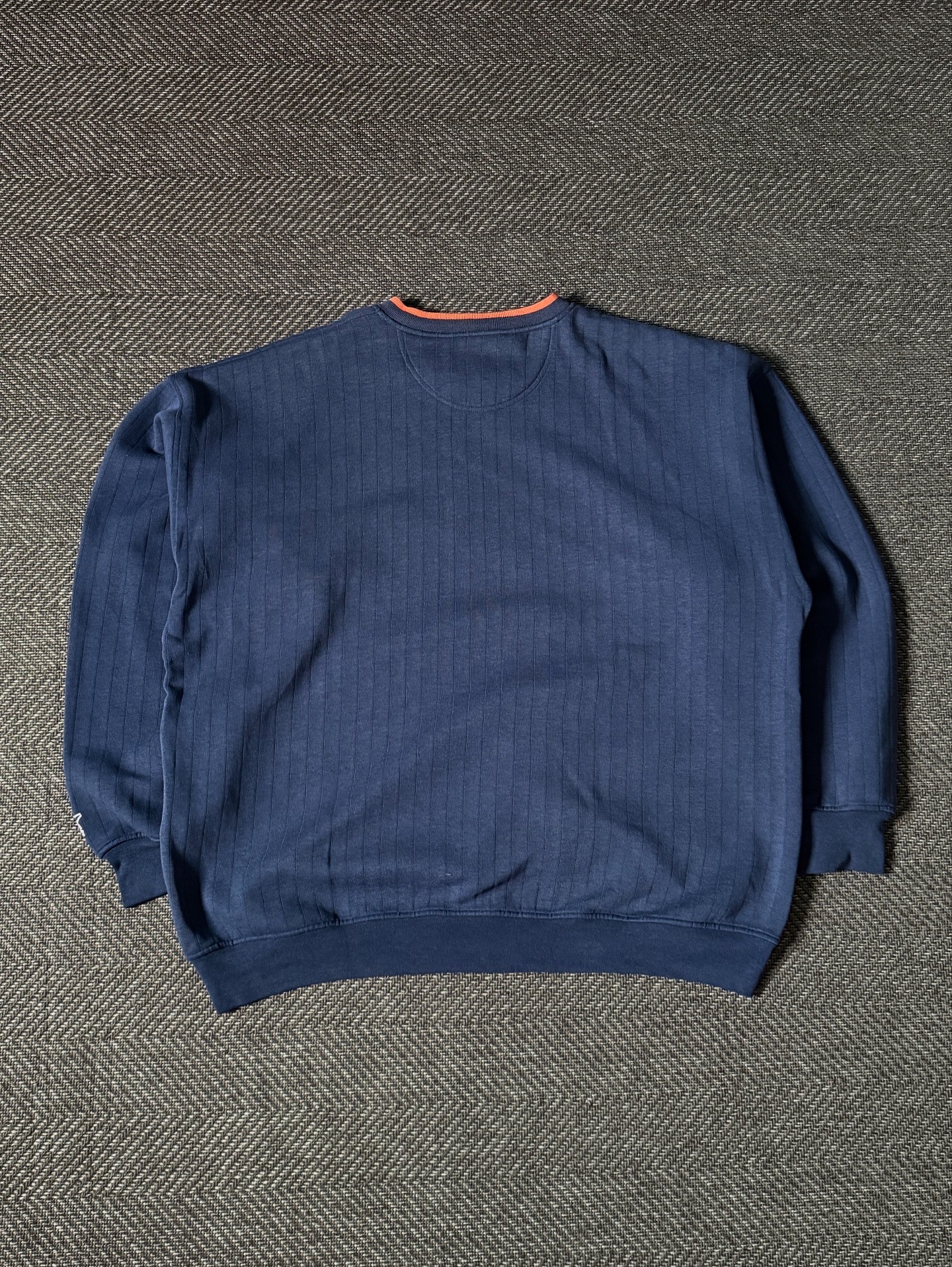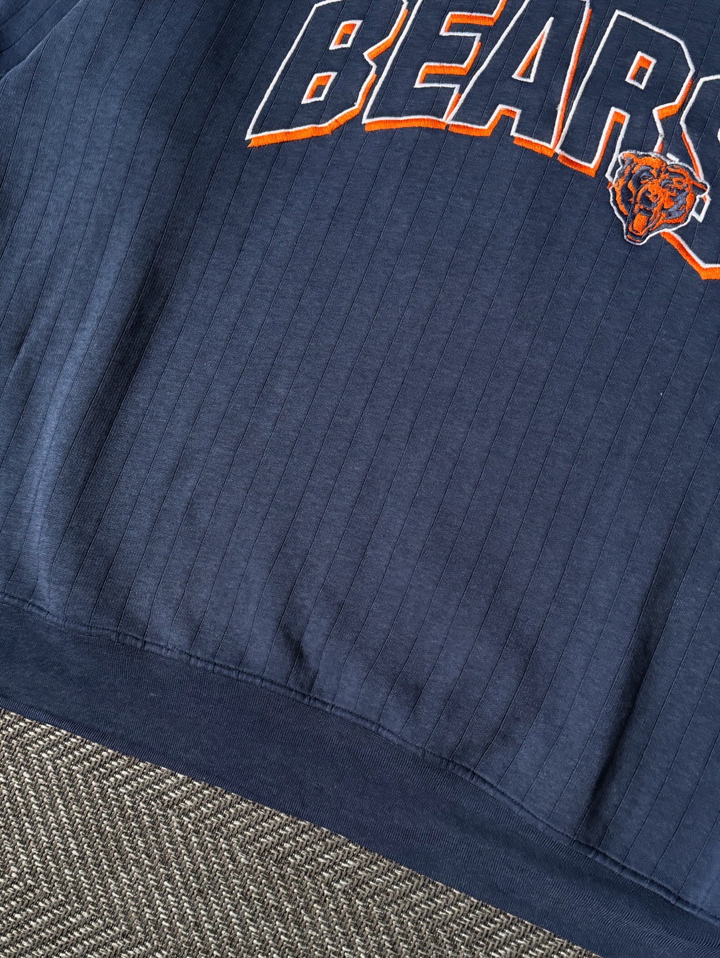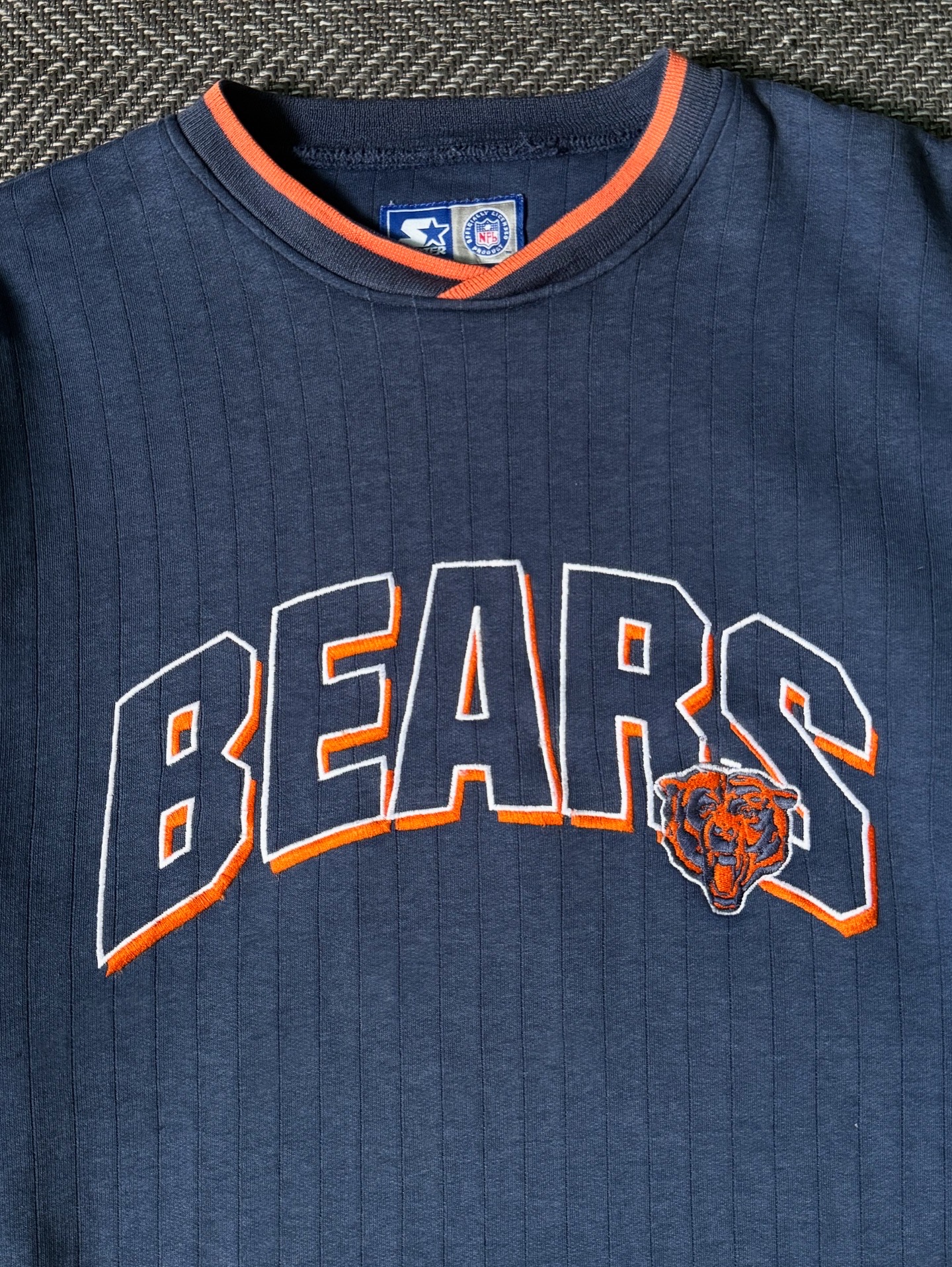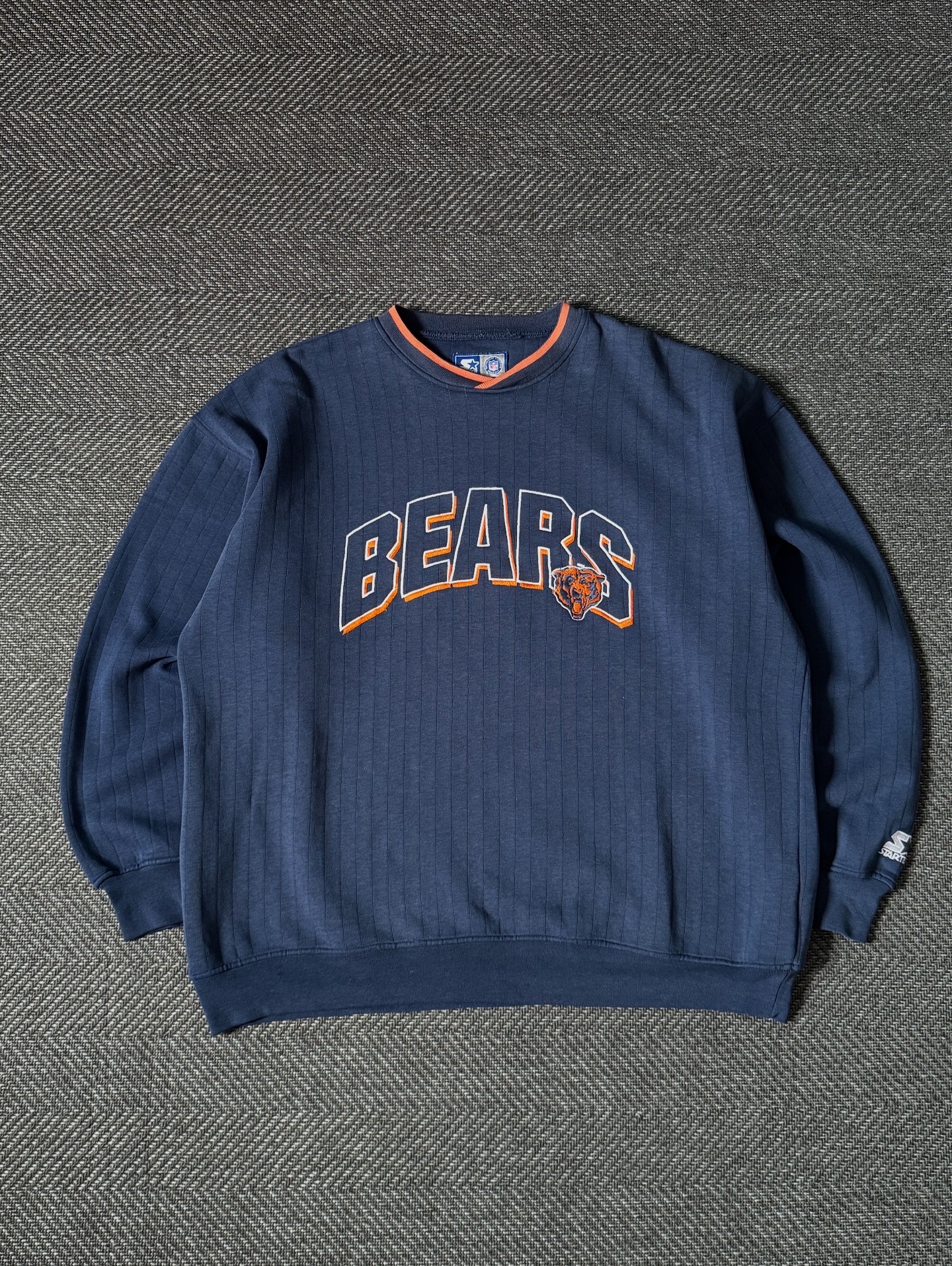 90년대 생산된 스타터(Starter)사의 시카고 베어스 빈티지 맨투맨입니다. 전면에는 오렌지 아웃라인으로 처리된 BEARS 레터링과 팀 로고가 자수로 더해져 있으며, 넥라인의 오렌지 디테일이 포인트가 되어 전체적인 완성도를 높여줍니다.