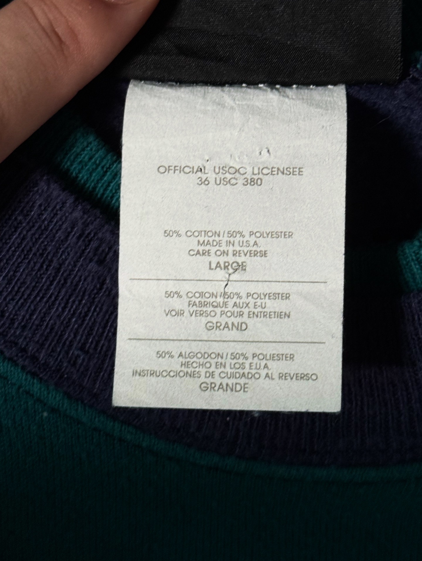 90년대에 제작된 Hanes Signature Collection의 빈티지 맨투맨입니다. 네이비와 그린 투톤 컬러 배색 위에 돌고래와 Myrtle Beach, South Carolina 그래픽이 더해져 리조트 감성과 레트로 무드를 동시에 담아낸 디자인이 특징입니다.