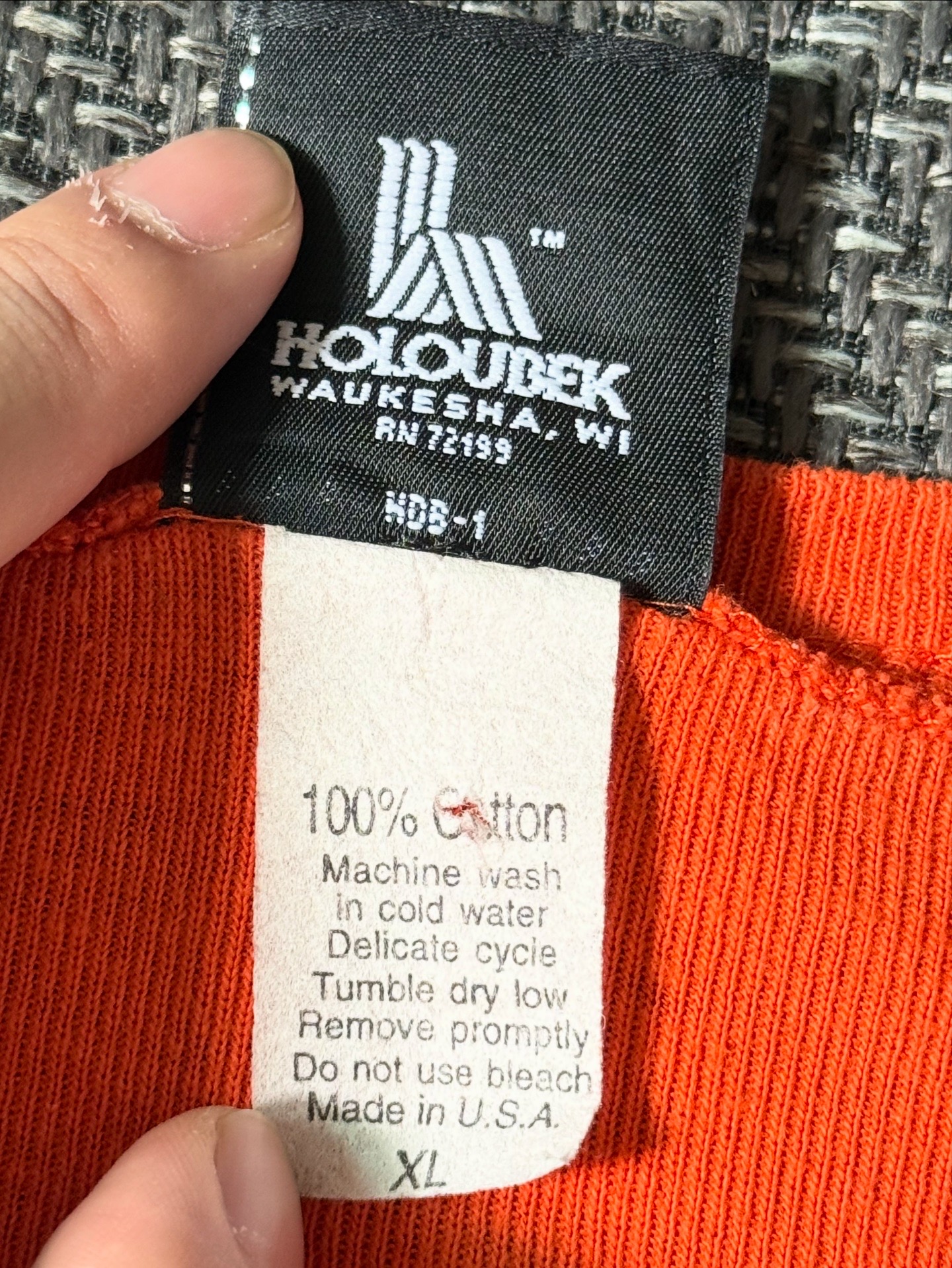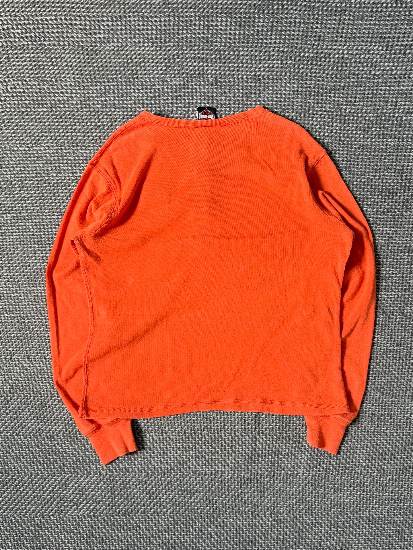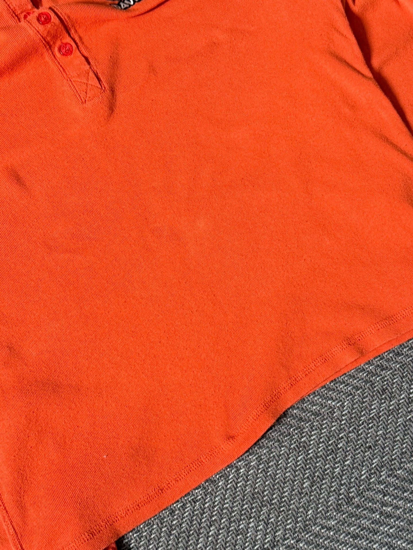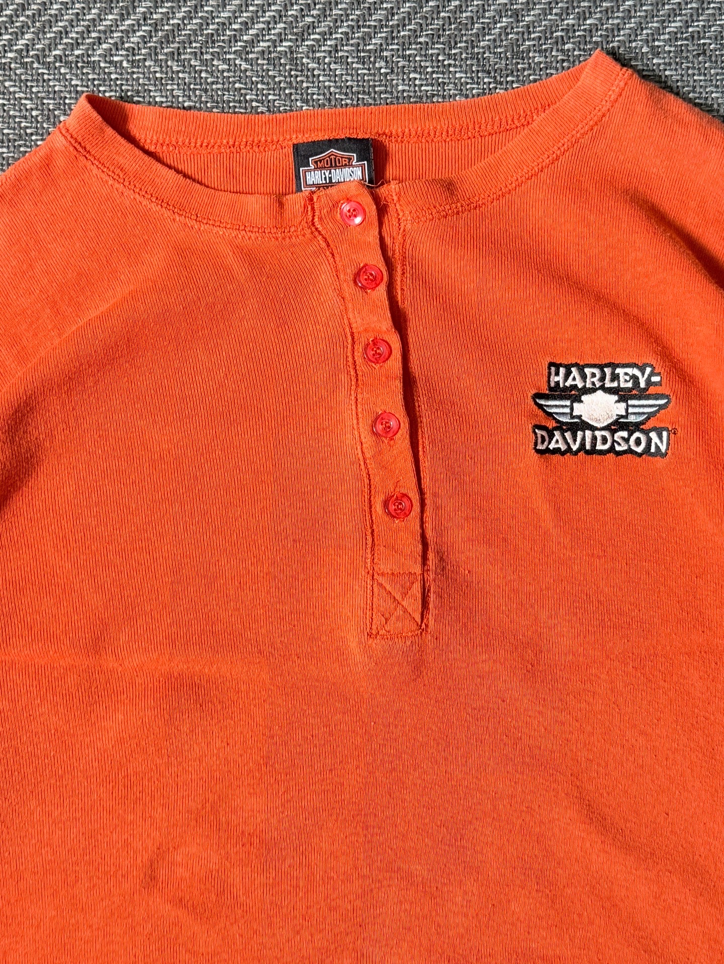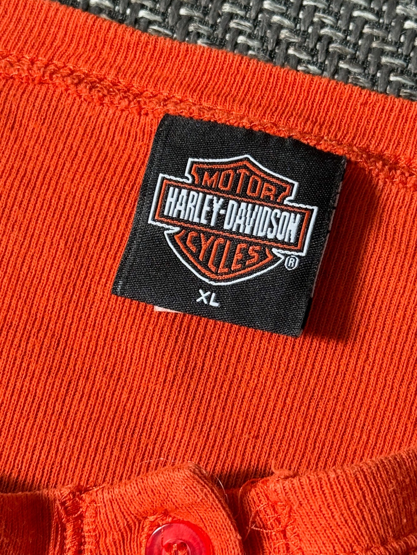 90년대 제작된 Harley-Davidson 빈티지 헨리넥 롱슬리브 티셔츠입니다. 강렬한 오렌지 컬러 바디에 버튼업 헨리넥 디자인이 특징이며, 전면에는 클래식한 Harley-Davidson 윙 로고 자수가 더해져 브랜드 아이덴티티를 잘 보여줍니다.