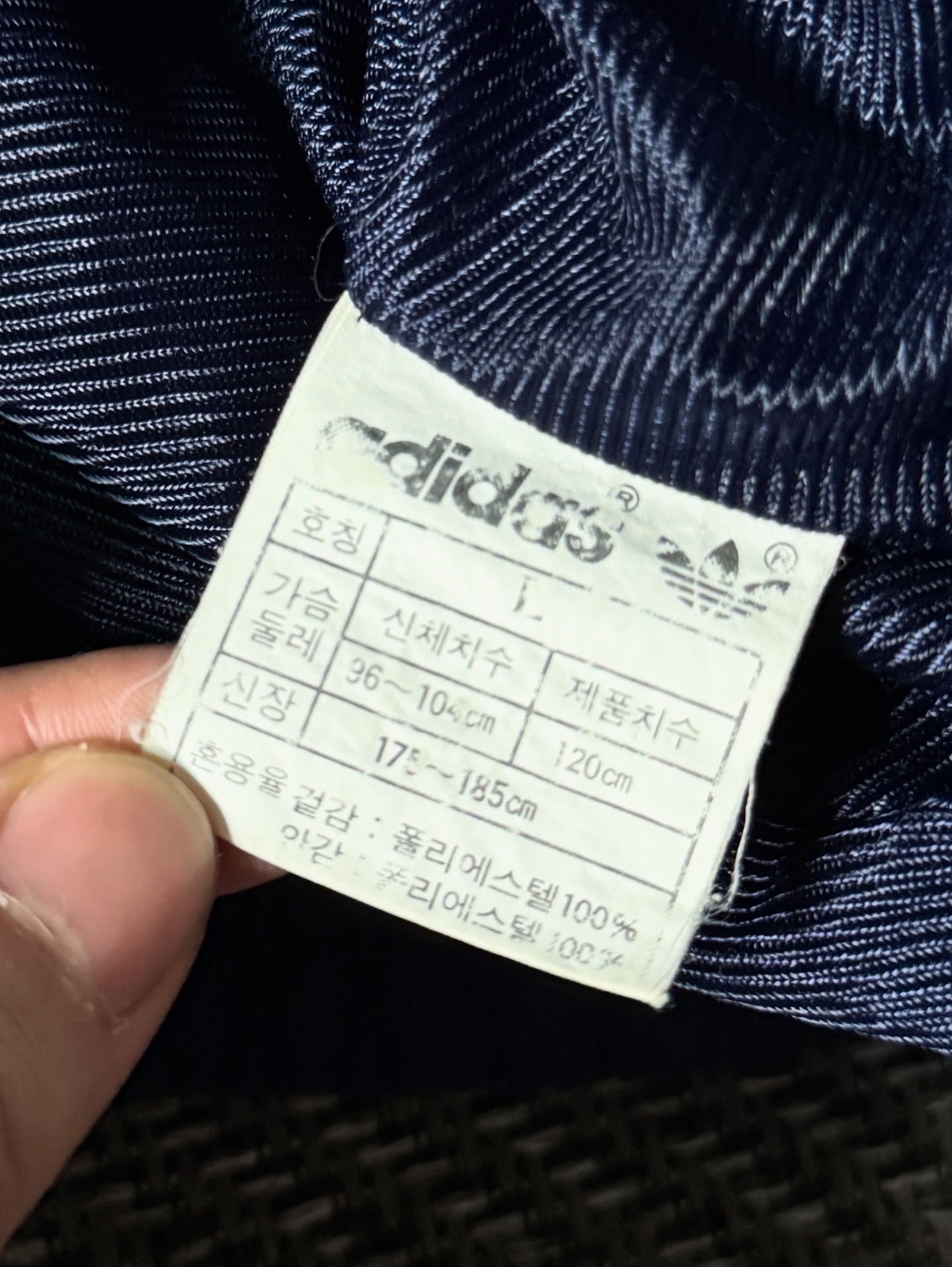 전면에는 adidas 트레포일(삼엽 로고) 자수와 함께 하프 집업 구조, 로고 각인된 지퍼 슬라이더 및 스냅 단추가 적용되어 있으며, 넉넉한 캥거루 포켓과 밑단·소매의 밴딩 마감으로 실용성과 활동성을 모두 갖추었습니다. 가벼운 폴리에스터 원단으로 제작되어 봄·가을 시즌 아우터 또는 이너 레이어링으로 활용하기 좋습니다. 라벨에 “제유교역(주)” 표기가 있어, 1990년대~2000년대 초 한국 내 라이선스 생산된 정품 아디다스 제품으로 확인됩니다. 실측 100 정도 되는 사이즈입니다.