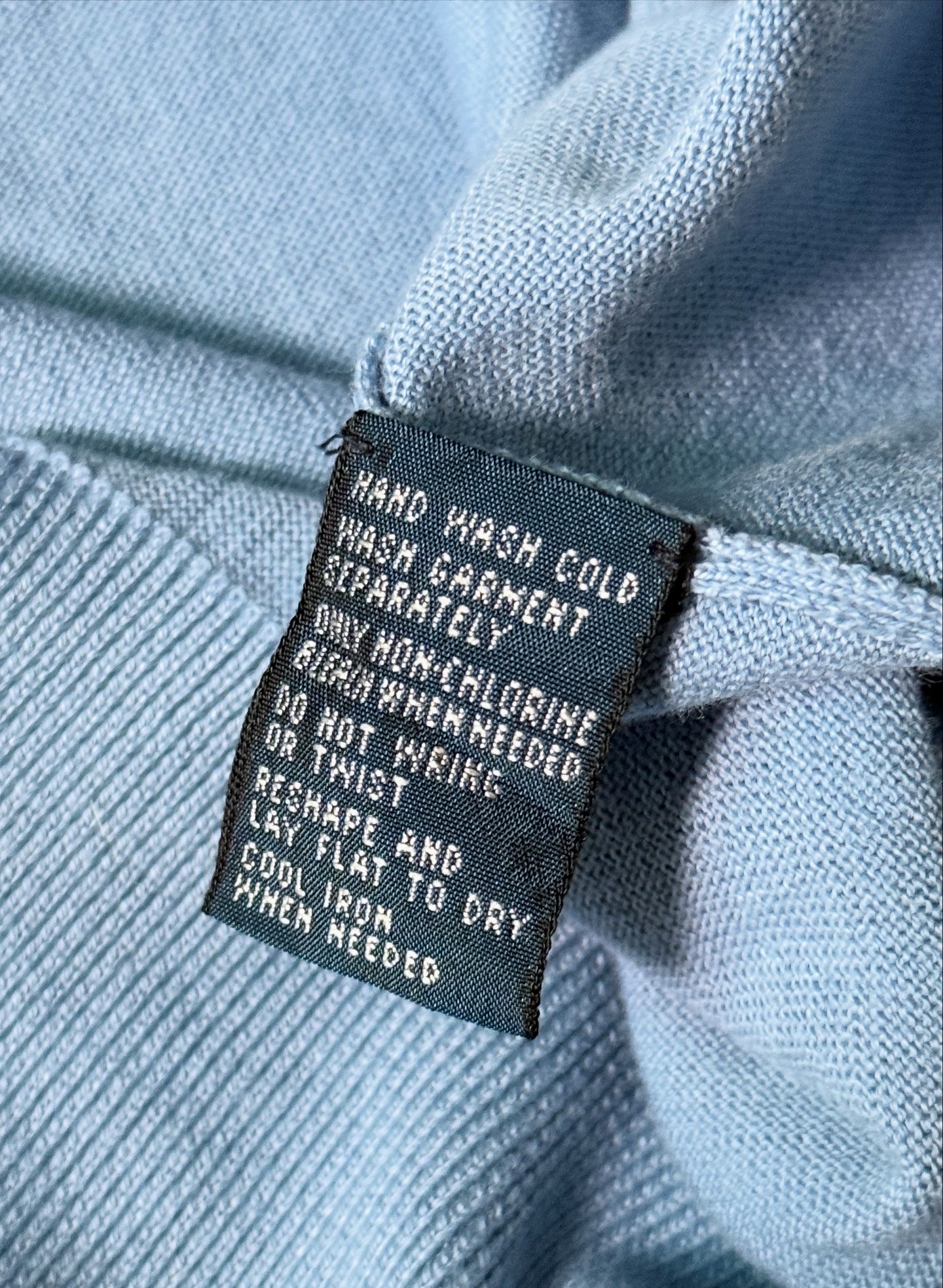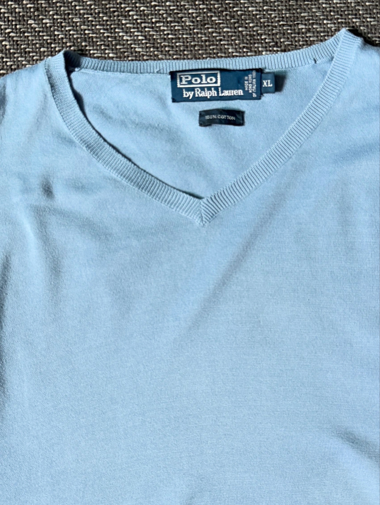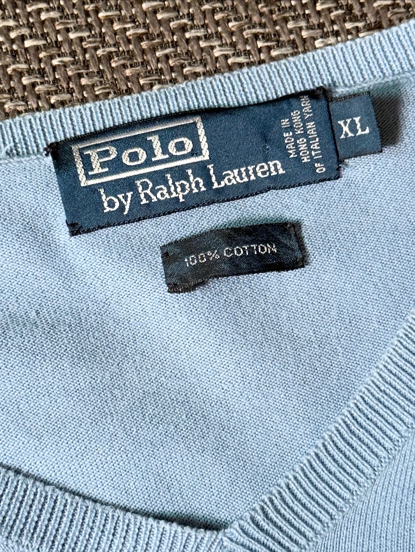 Polo by Ralph Lauren의 클래식 라인에서 출시된 스카이블루 컬러 V넥 니트 스웨터입니다. 넥 라벨의 구성과 폰트 스타일로 보아 1990년대 후반~2000년대 초반에 제작된 제품입니다.
