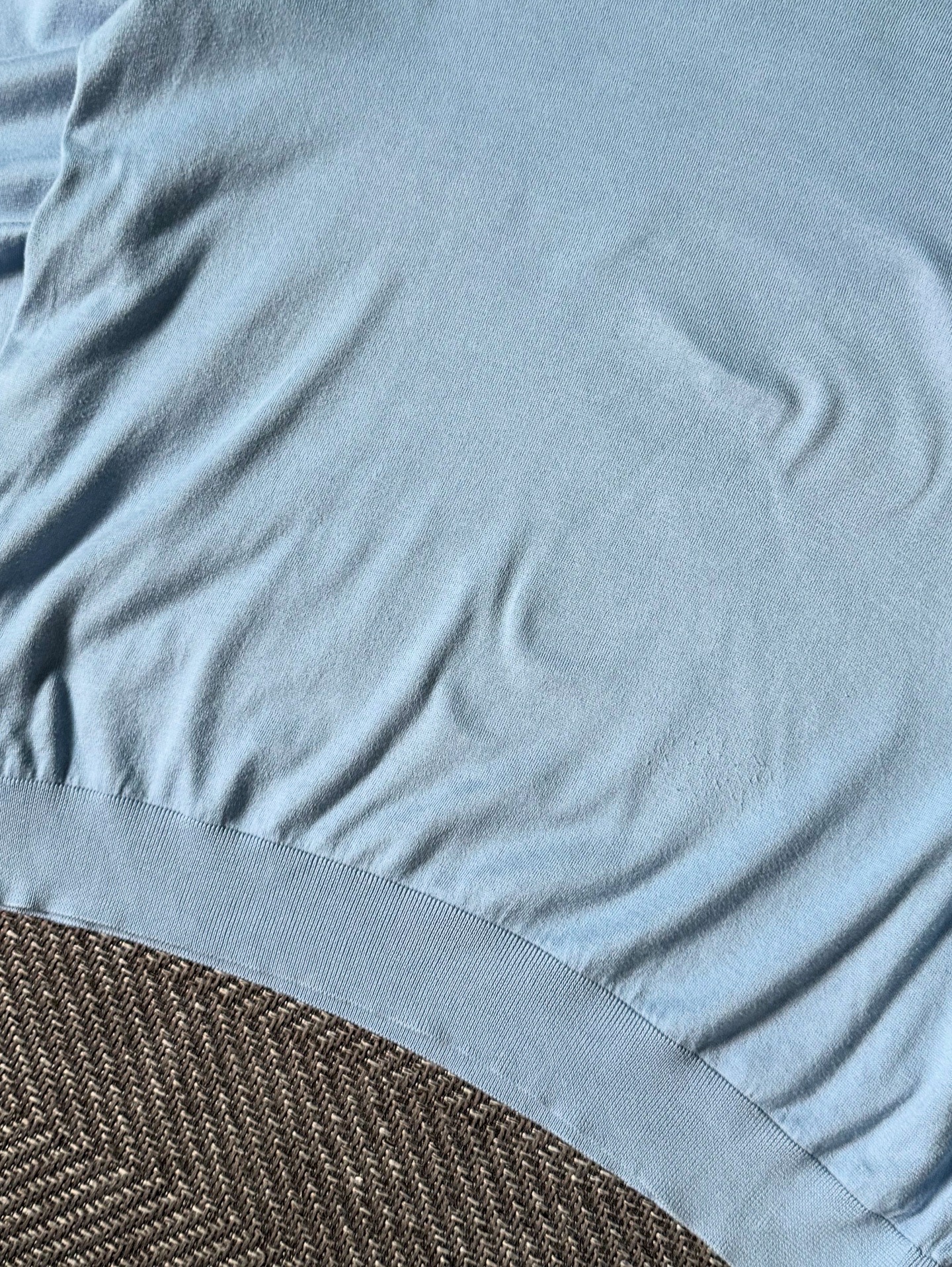 밝고 부드러운 스카이블루 컬러와 심플한 실루엣이 돋보이며, 100% 순면 소재로 제작되어 가볍고 통기성이 뛰어나 봄·가을 시즌 단독 또는 이너로 활용하기 좋습니다. V넥 라인과 밑단·소매 시보리가 자연스럽게 마감되어 있으며, 폴로 랄프로린 특유의 미니멀한 클래식 무드를 보여줍니다. 실측 105-110 정도 되는 사이즈입니다.