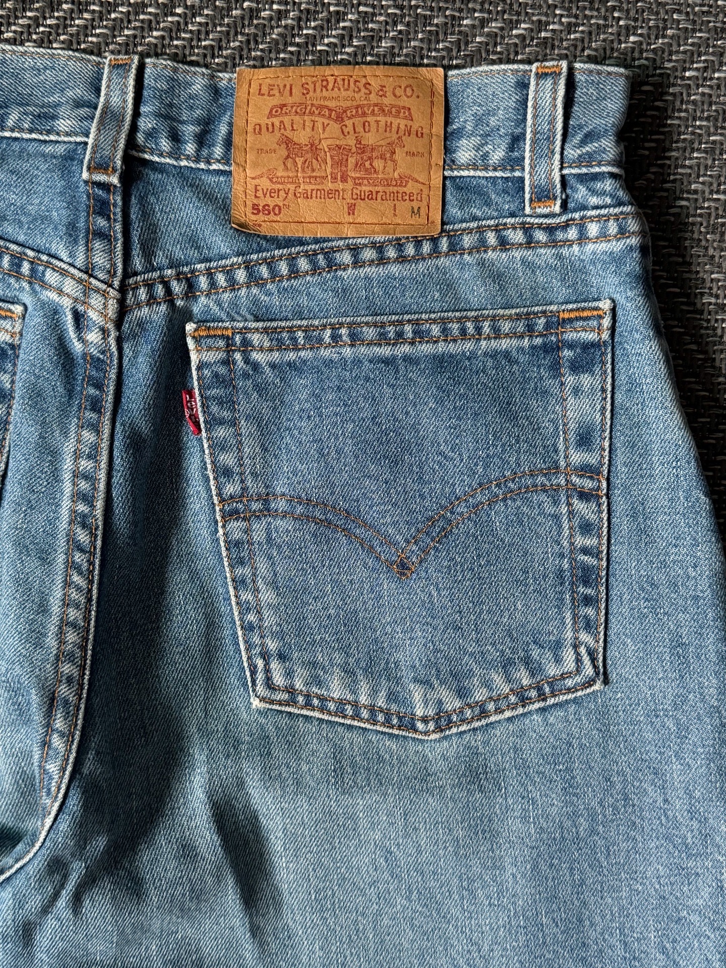 리바이스의 1990년대를 대표하는 여유로운 핏의 모델,560 루즈 핏 테이퍼드 레그(Loose Fit Tapered Leg) 데님 팬츠입니다. 리벳 넘버 512를 통해 미국 텍사스주 엘패소(El Paso, Texas) 공장 생산으로 추정되며, 이 시기의 엘패소 라인은 리바이스 본사 직영 생산지 중 하나로 알려져 있습니다.