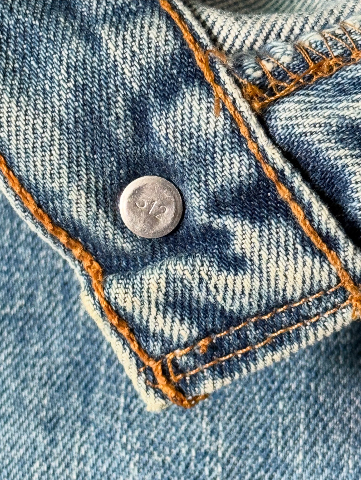 내부 케어라벨은 잘 안보이지만, 리벳 넘버·워싱 질감·패치 디테일을 통해 1990년대 초반 미국 생산 제품으로 확인됩니다. 자연스럽게 바랜 라이트 인디고 워싱감이 인상적이며, 허리와 힙 라인에 여유를 두고 밑단으로 갈수록 좁아지는 실루엣이 특징입니다.