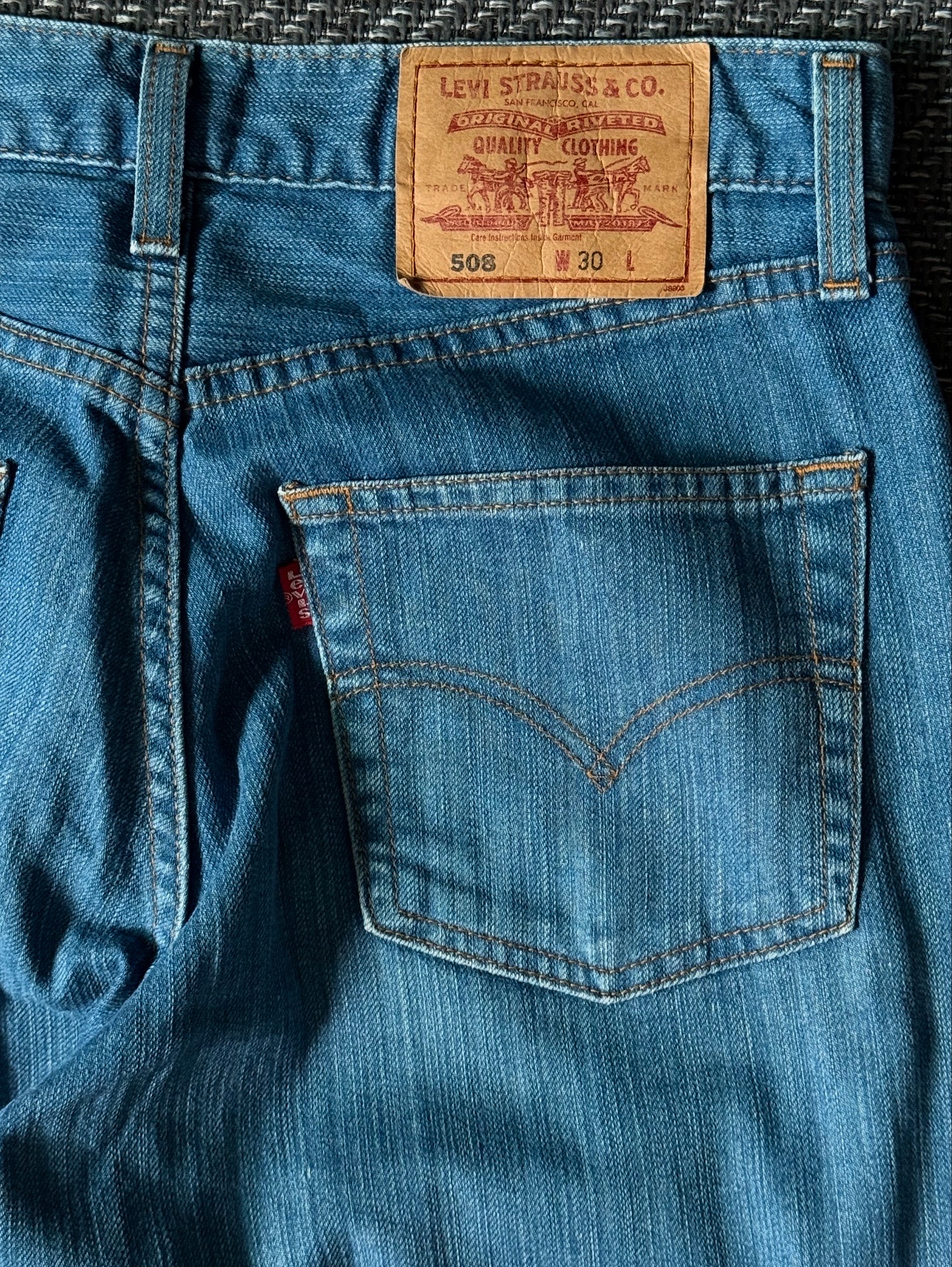 리바이스의 508 레드탭(Red Tab) 라인 빈티지 데님 팬츠입니다. 508은 505의 슬림한 실루엣을 계승하면서도, 허리부터 밑단까지 부드럽게 떨어지는 테이퍼드 스트레이트 핏이 특징인 모델로 리바이스의 현대적인 핏 전환기를 보여주는 대표적인 라인입니다. 허벅지에 여유가 있고 밑단으로 갈수록 자연스럽게 좁아지는 형태로, 전체적인 실루엣은 캐주얼하면서도 깔끔한 라인감을 유지합니다.