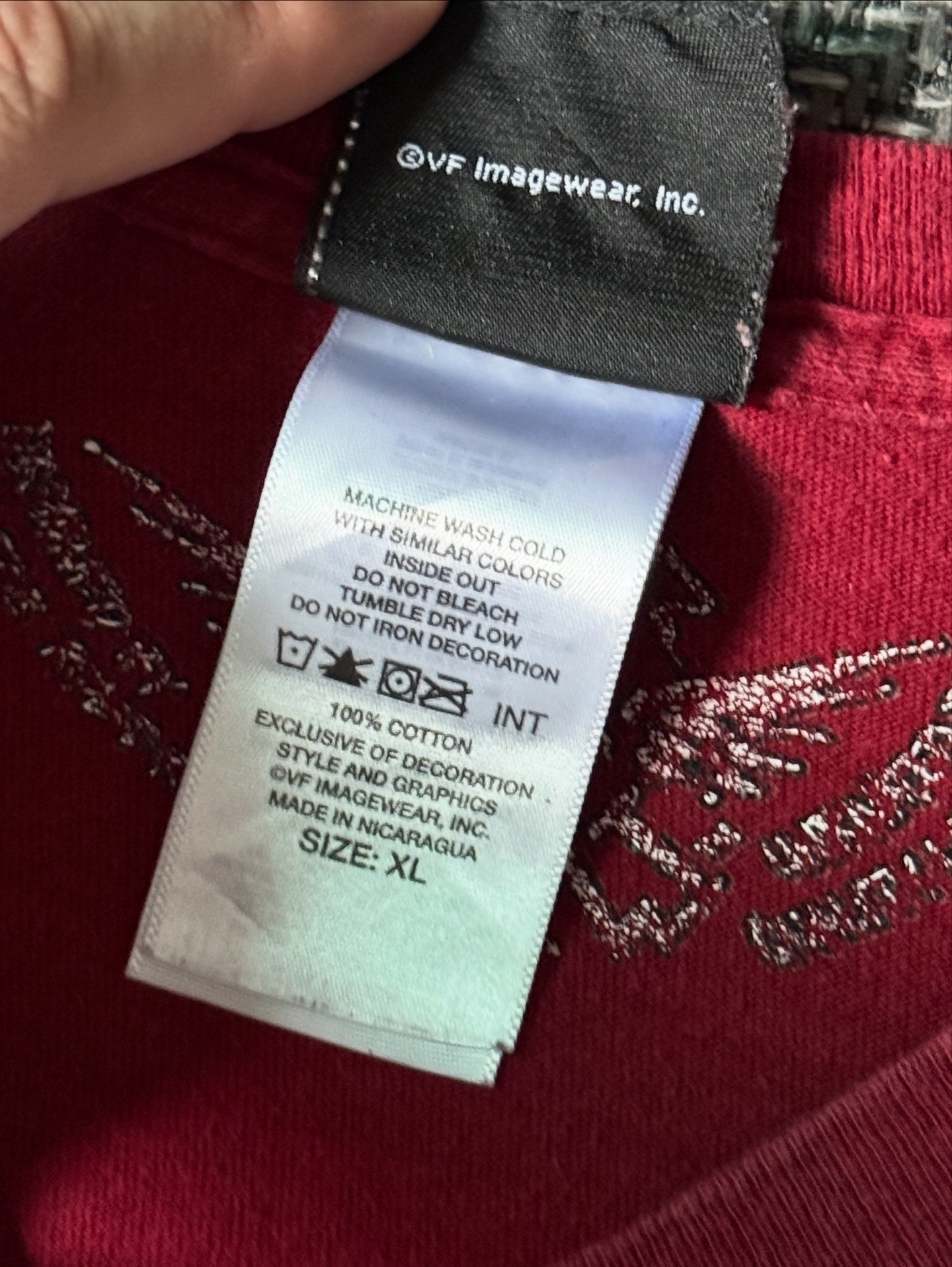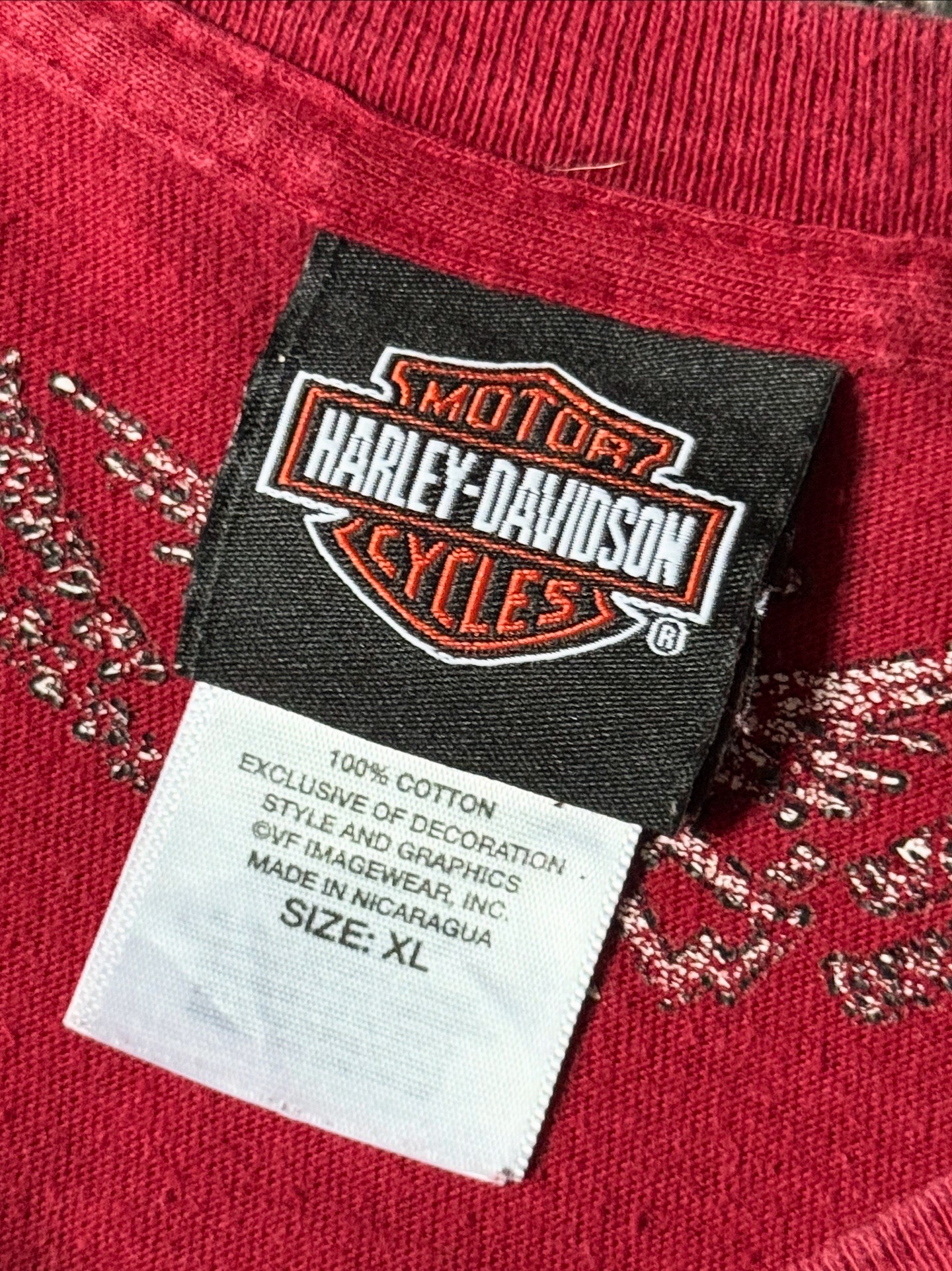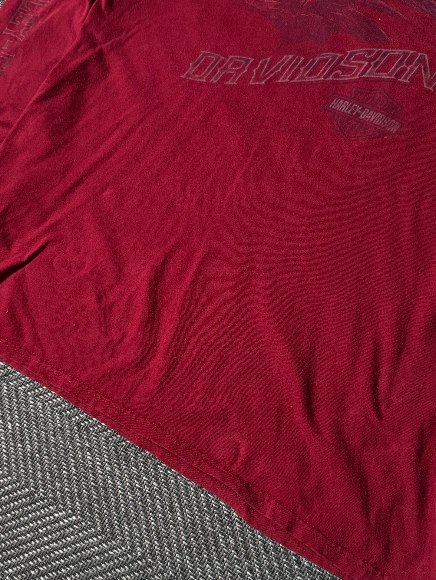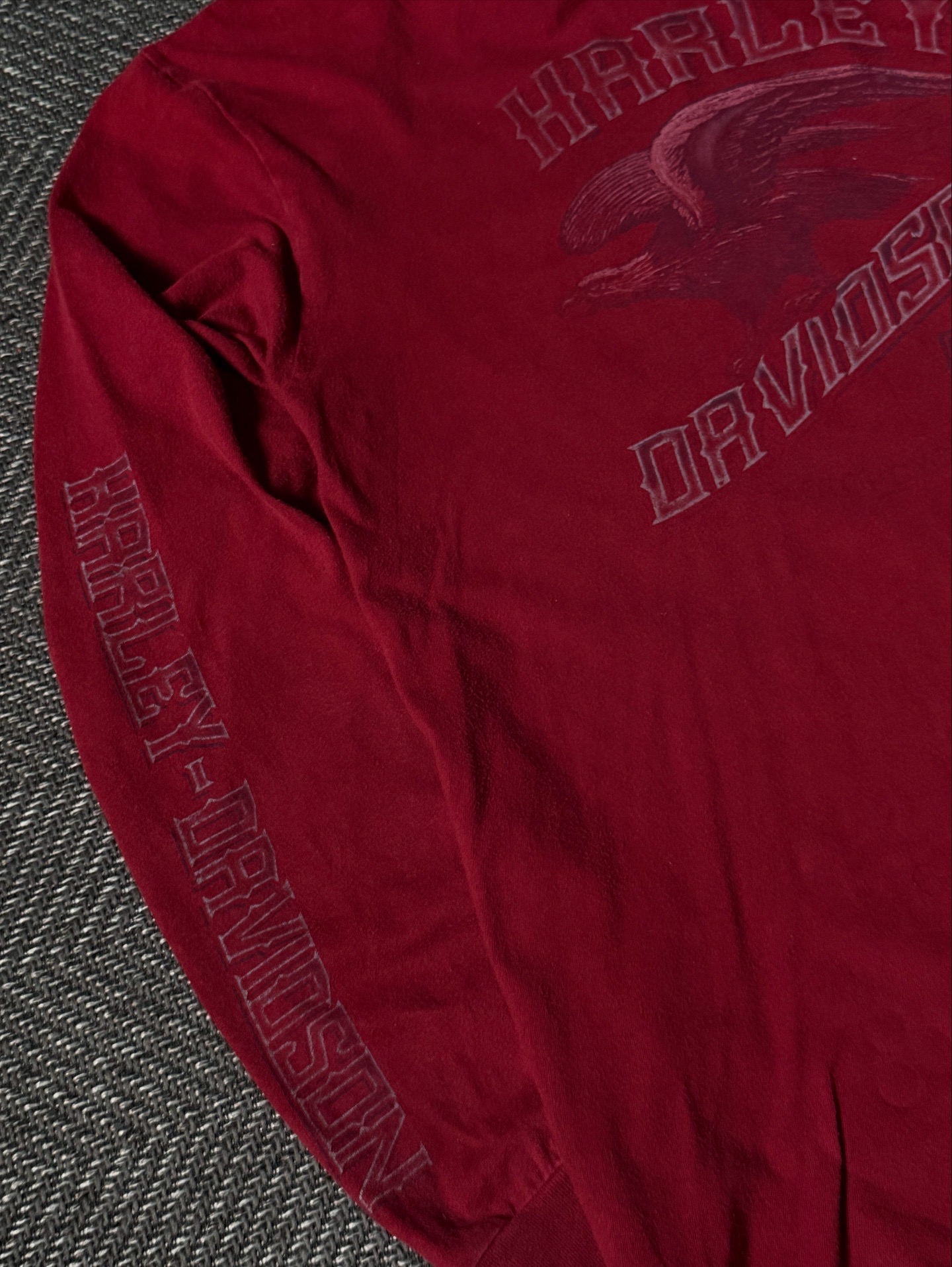 딥 버건디 컬러가 매력적인 Harley-Davidson 빈티지 롱슬리브 티셔츠입니다. 전면에는 이글 그래픽과 함께 음각 스타일의 HARLEY-DAVIDSON 로고가 프린팅되어 있으며, 왼팔에는 동일한 로고 레터링이 더해져 브랜드 아이덴티티를 강조합니다.