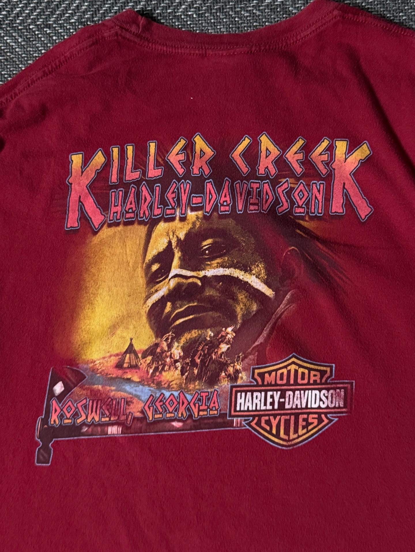 후면에는 Killer Creek Harley-Davidson – Roswell, Georgia의 그래픽이 들어가 있어 빈티지한 감성과 미국 현지 매장 한정 디자인의 개성이 돋보입니다. 100% 코튼 소재로 제작되어 착용감이 부드럽고, 세월에 따른 자연스러운 바랜 컬러와 프린트가 멋스럽게 에이징되었습니다. 실측 105정도 되는 사이즈입니다.