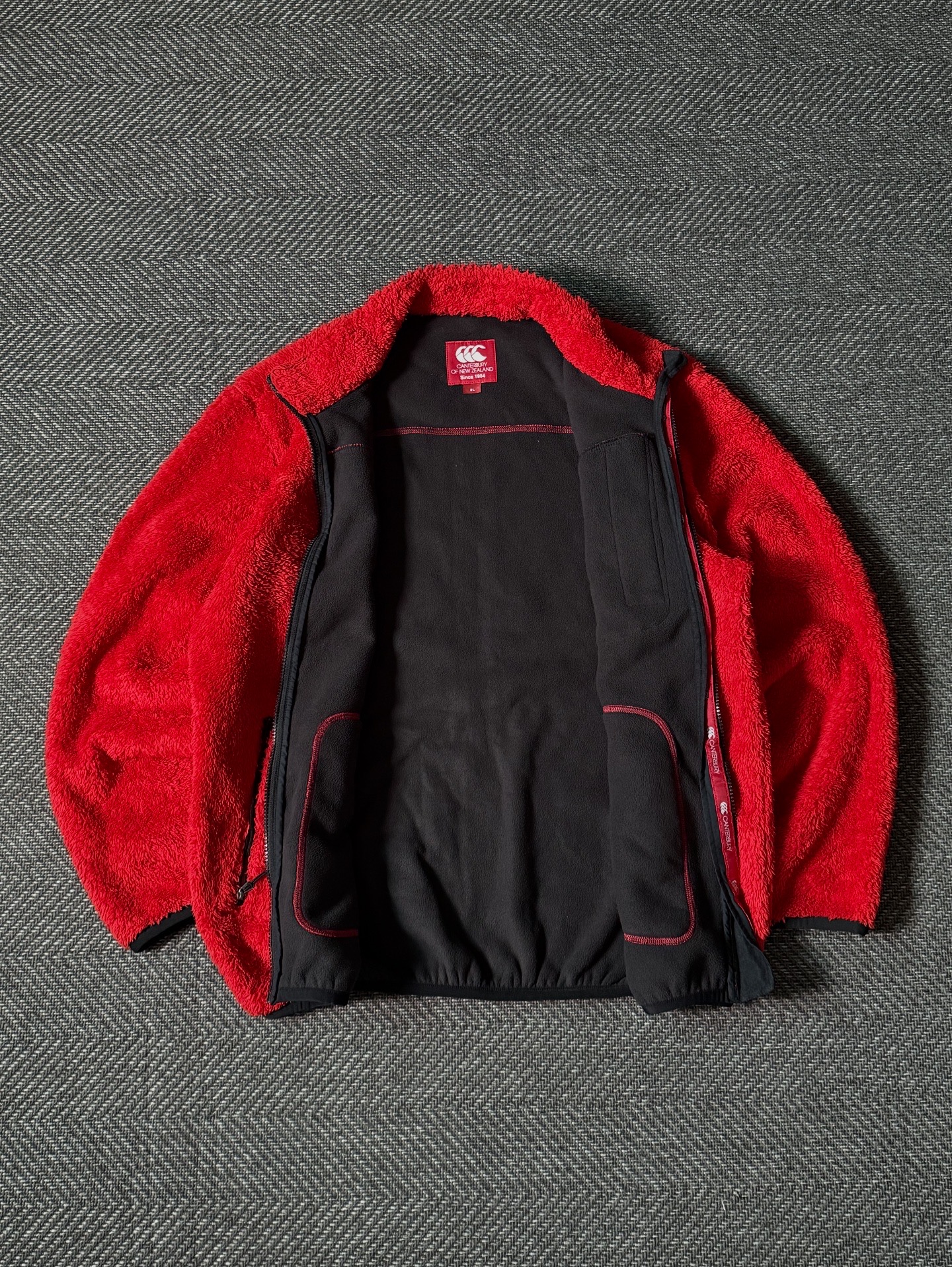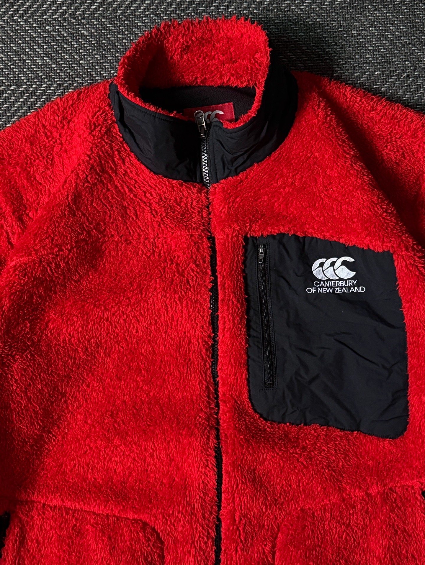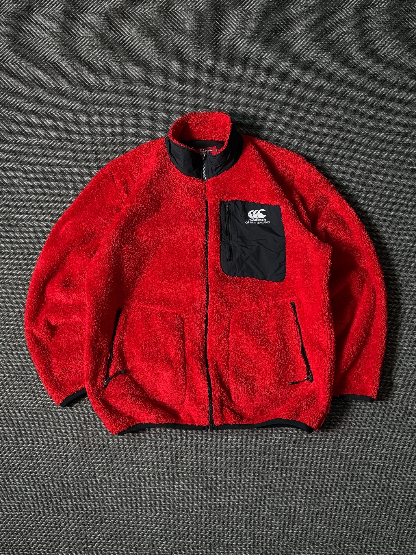 선명한 레드 컬러가 돋보이는 Canterbury of New Zealand 플리스 집업 자켓입니다. 1904년 설립된 뉴질랜드의 럭비 웨어 브랜드로, 기능성과 캐주얼한 감각이 조화된 디자인이 특징입니다. 보온성이 뛰어난 플리스 원단을 사용해 포근하고 가벼운 착용감을 제공하며, 가슴 부분의 블랙 나일론 포켓 디테일과 자수 로고가 강한 대비감을 주어 스포티한 무드를 완성합니다.
