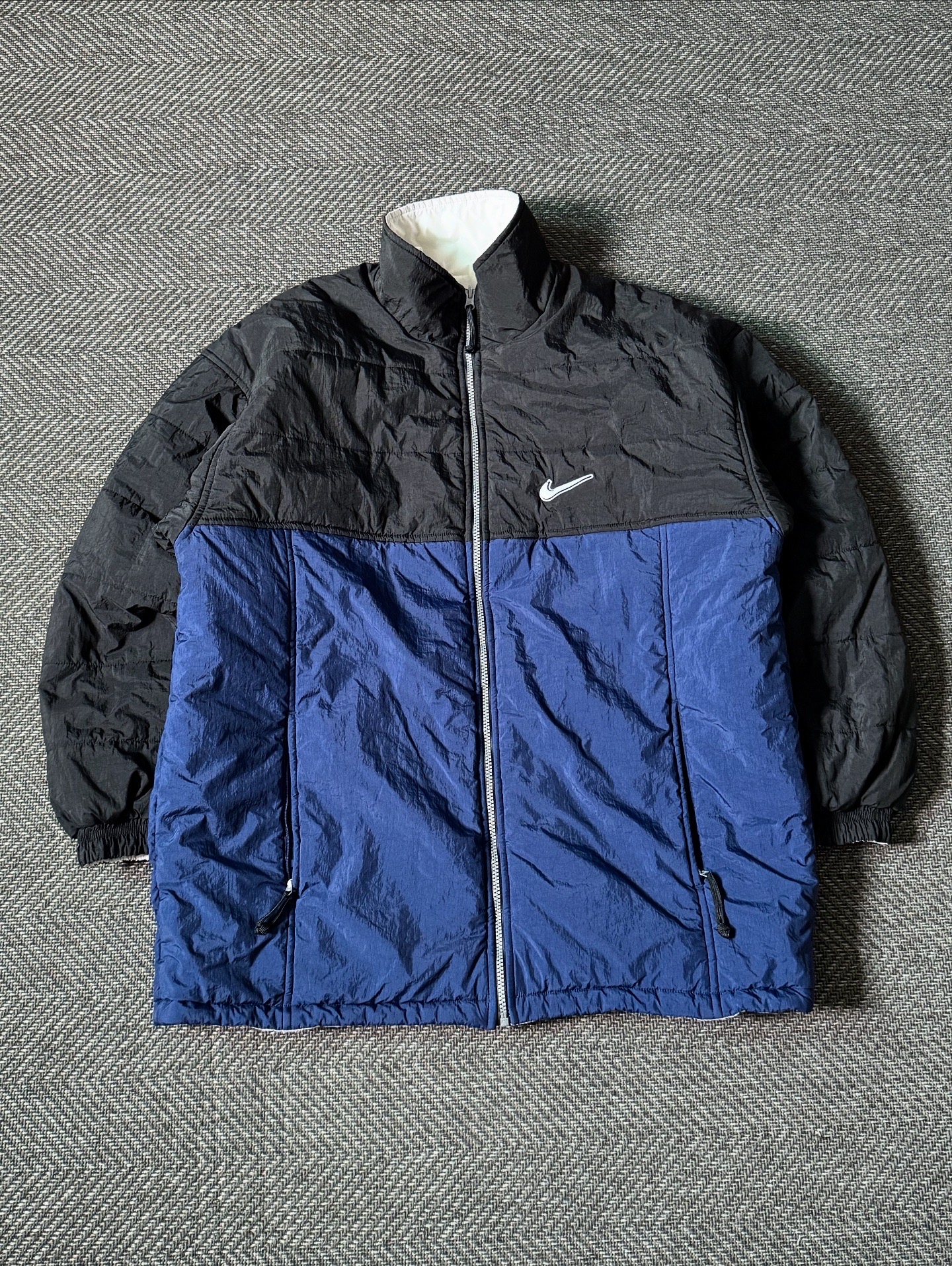 90년대 제작된 나이키 리버시블 나일론 자켓입니다. 블랙×네이비 투톤의 면과 화이트 톤의 반전면으로 구성되어 있으며, 두 가지 분위기를 자유롭게 연출할 수 있는 실용적인 리버시블 디자인이 특징입니다.