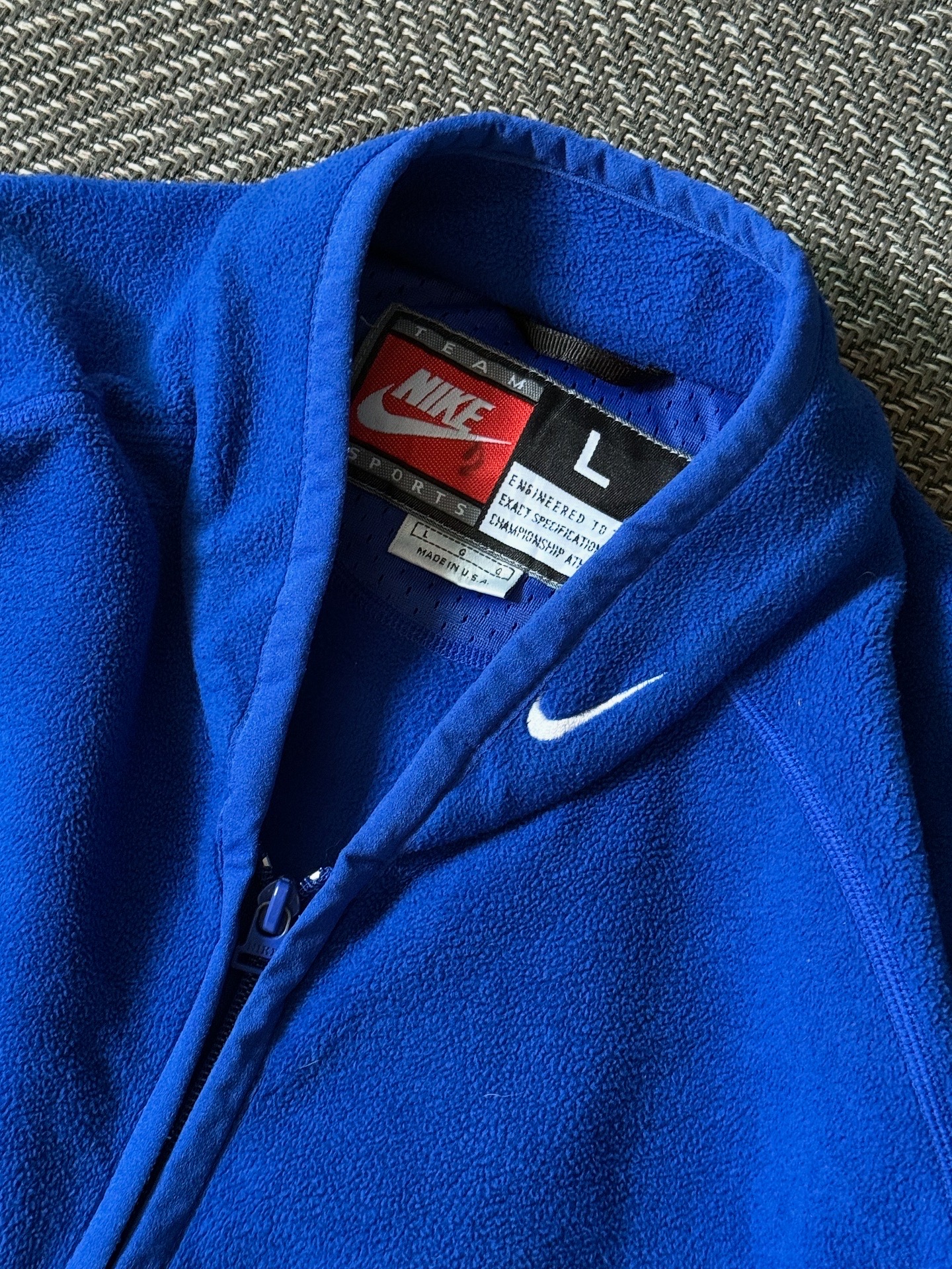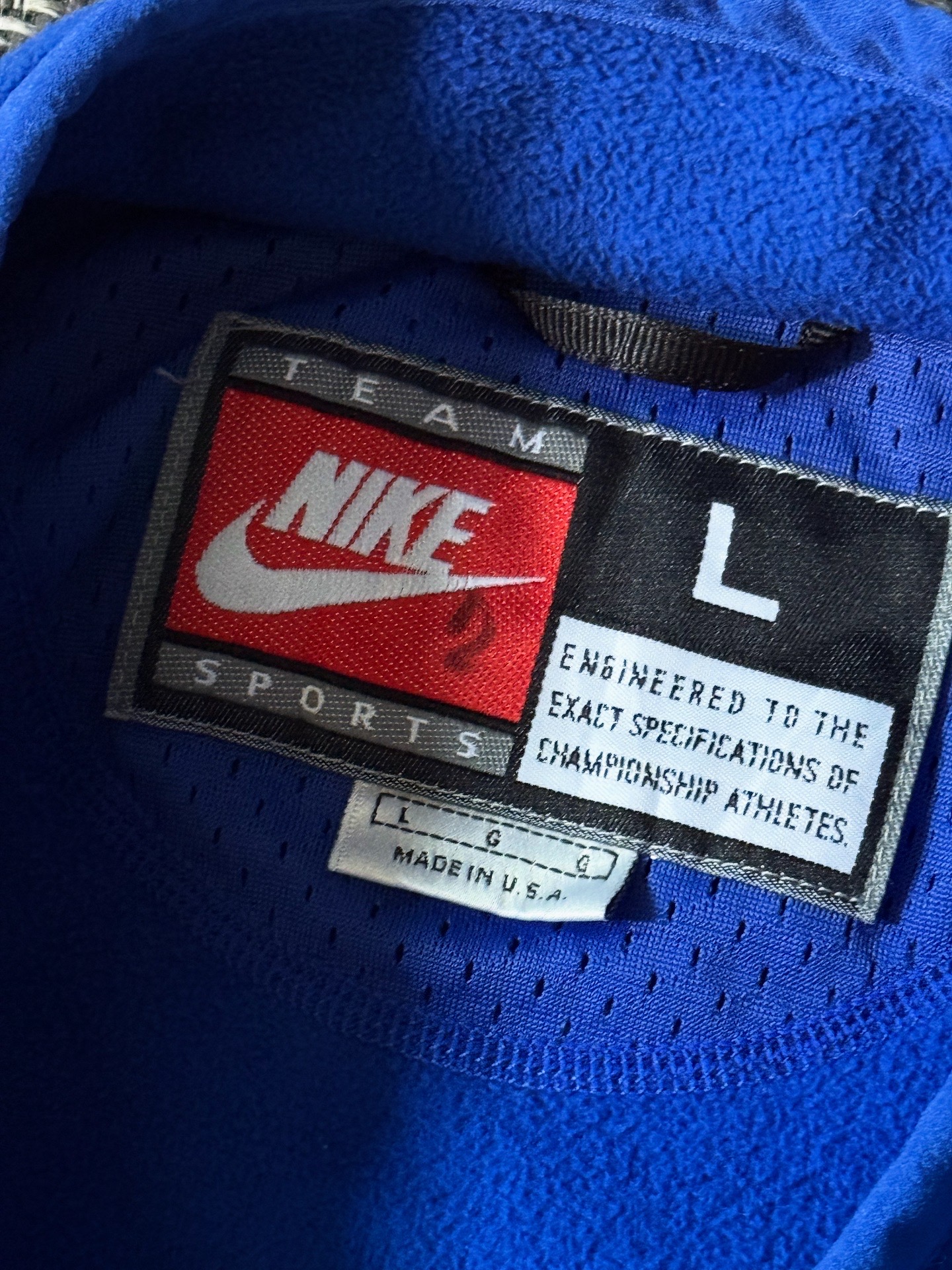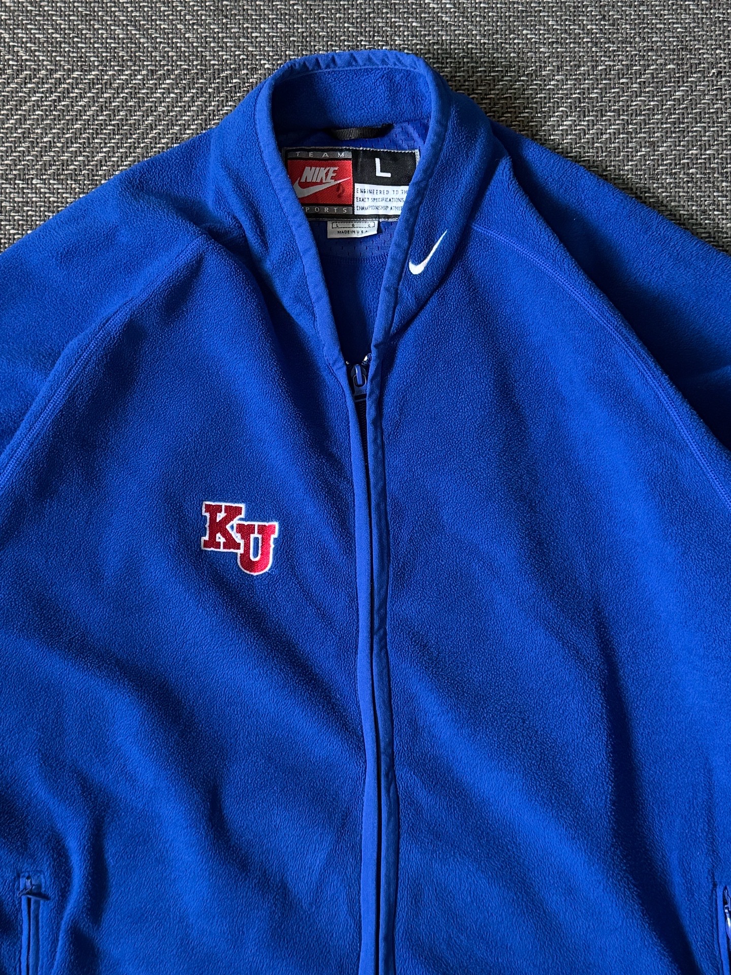 90년대 후반에 생산된 Nike Team Sports의 오리지널 플리스 자켓입니다. 미국 내에서 제작된 Made in USA 제품으로, 당시 대학 스포츠팀용으로 공급되던 정통 라인입니다. 선명한 로열 블루 컬러의 플리스 원단이 사용되었으며, 왼쪽 가슴에는 Kansas University(KU) 로고 자수가, 오른쪽에는 화이트 스우시 로고가 포인트로 들어가 있습니다.