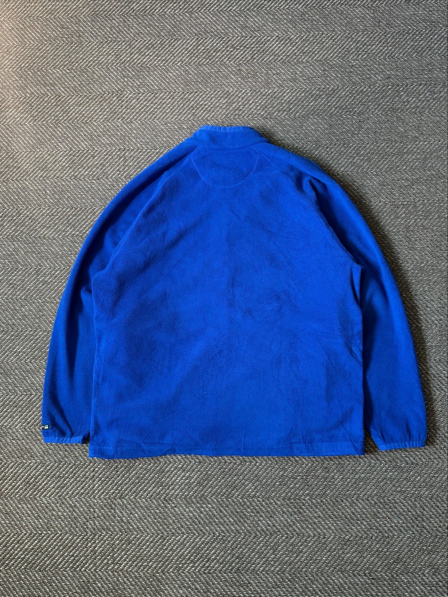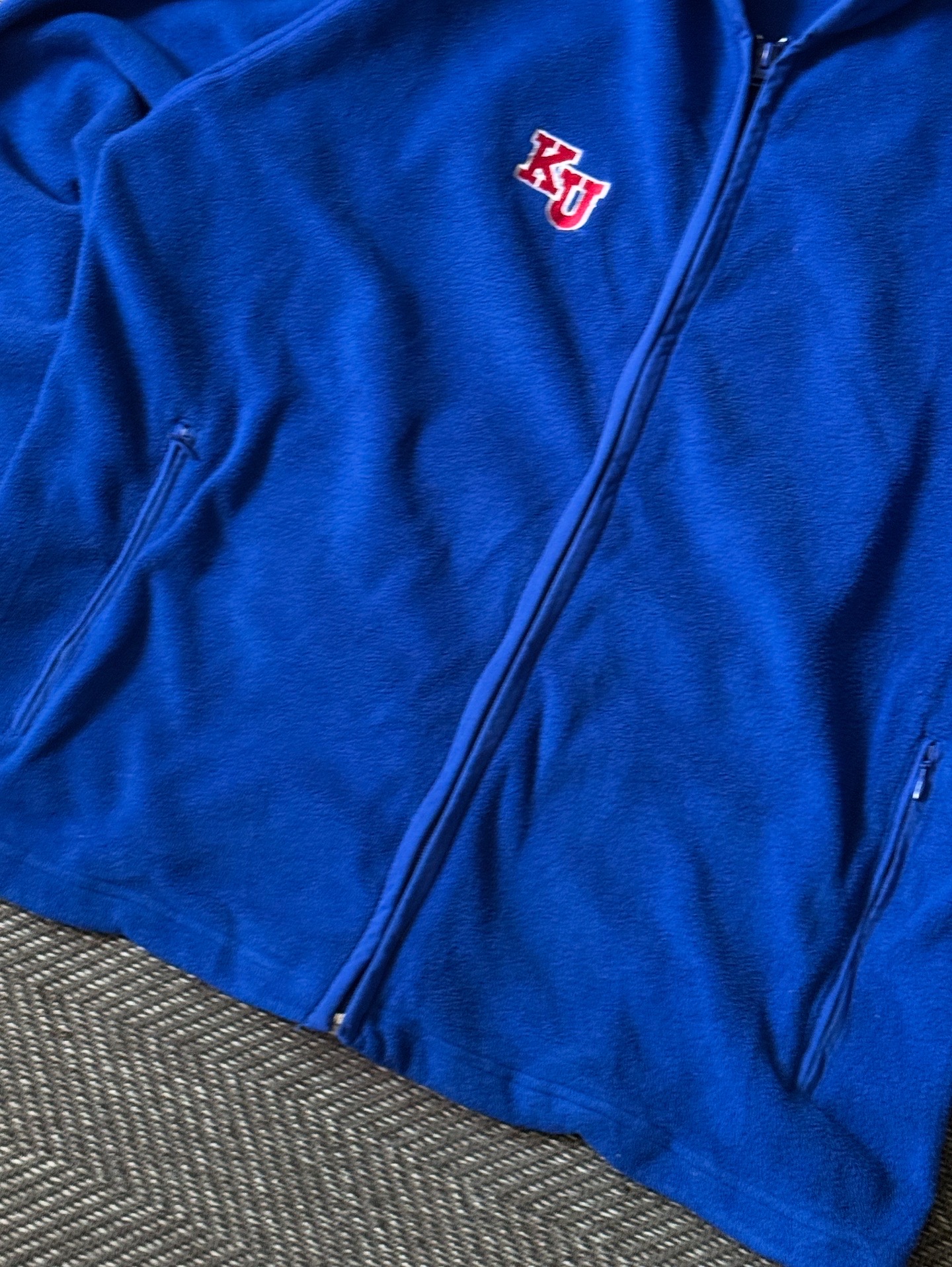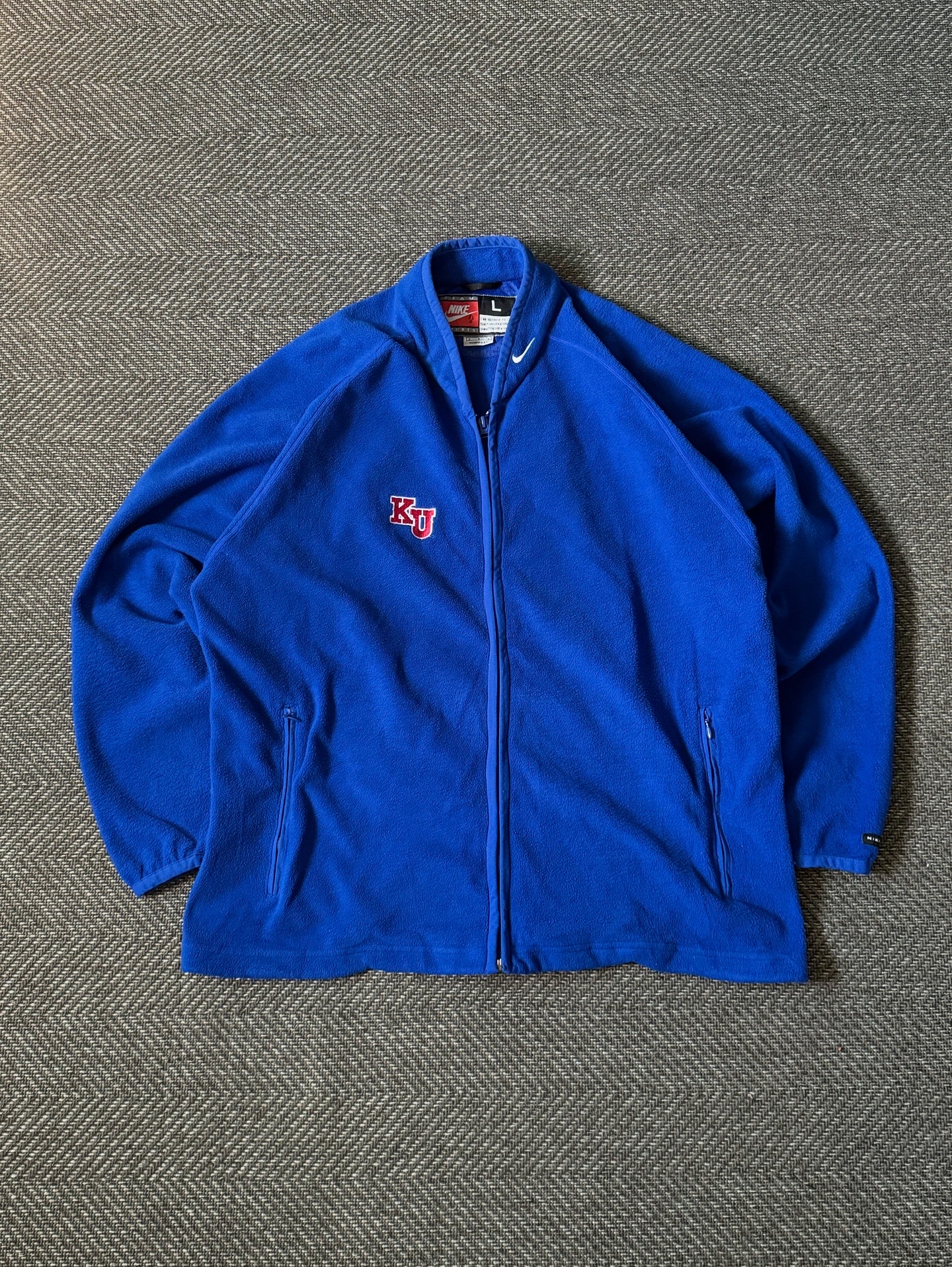 90년대 후반에 생산된 Nike Team Sports의 오리지널 플리스 자켓입니다. 미국 내에서 제작된 Made in USA 제품으로, 당시 대학 스포츠팀용으로 공급되던 정통 라인입니다. 선명한 로열 블루 컬러의 플리스 원단이 사용되었으며, 왼쪽 가슴에는 Kansas University(KU) 로고 자수가, 오른쪽에는 화이트 스우시 로고가 포인트로 들어가 있습니다.