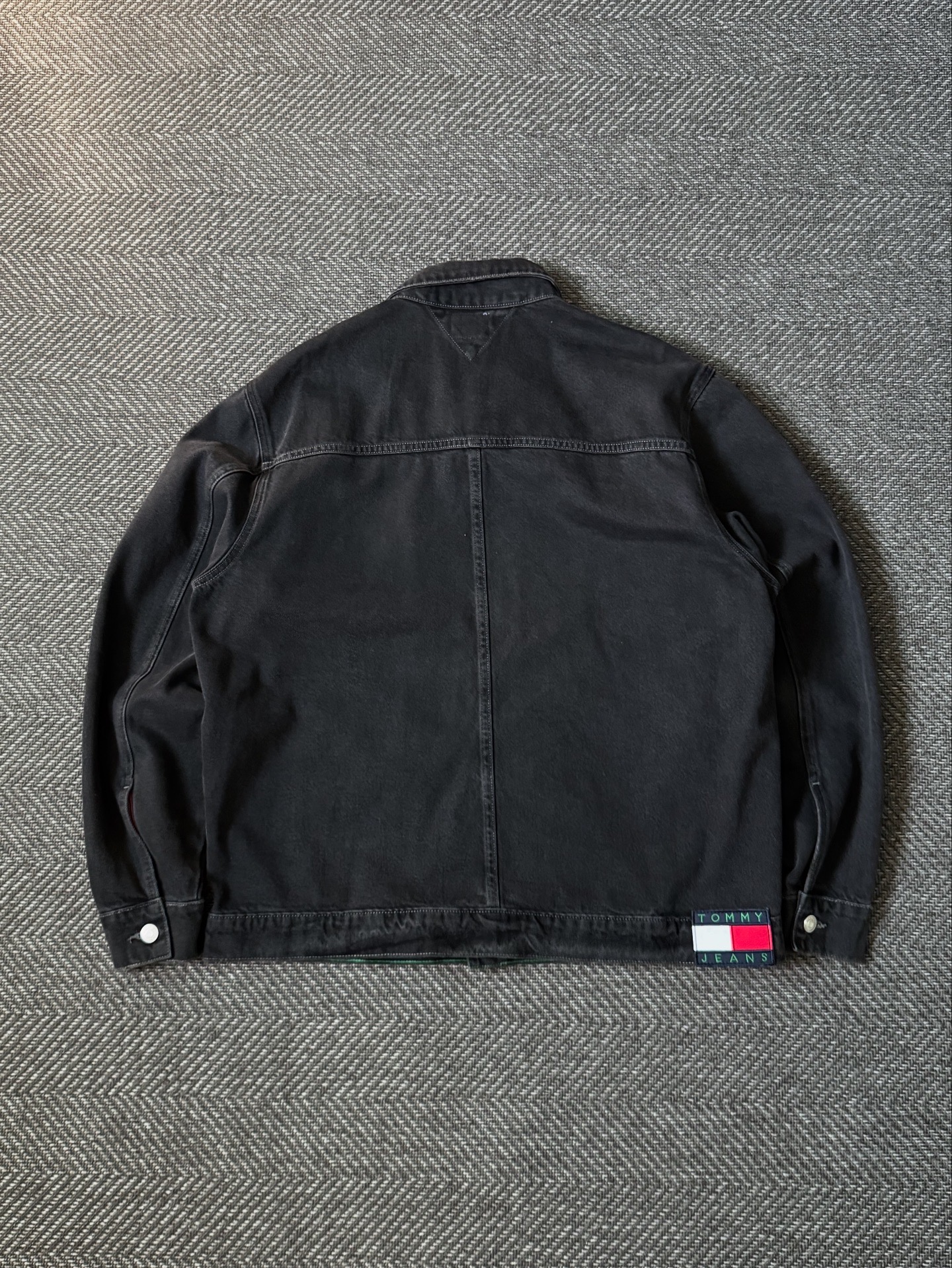 Tommy Jeans의 블랙 데님 트러커 자켓입니다. 브랜드 특유의 클래식한 데님 실루엣과 현대적인 감각이 조화된 모델로, 톤다운된 블랙 컬러와 자연스러운 워싱감이 빈티지한 무드를 더합니다. 프론트에는 Tommy Jeans 플래그 로고 탭과 실버톤의 스냅 버튼이 배치되어 있으며, 백 하단에는 레드·화이트·네이비 컬러의 빅 로고 패치가 포인트로 들어가 있습니다. 100% 코튼 데님 원단으로 제작되어 착용 시 탄탄하면서도 유연한 핏을 제공합니다. 전체적으로 양호한 컨디션을 유지하고 있습니다. 실측 105-110 정도 되는 사이즈입니다.