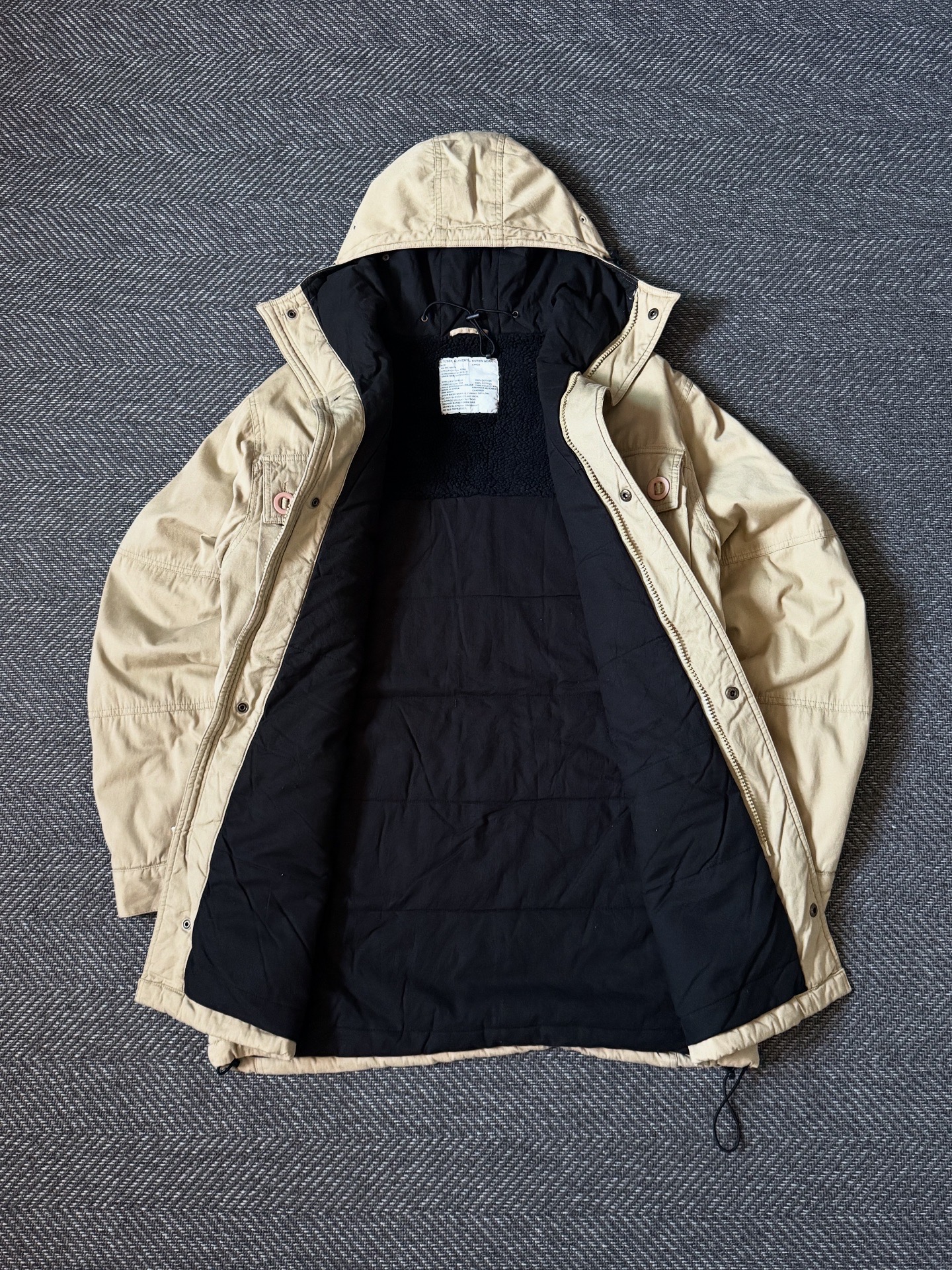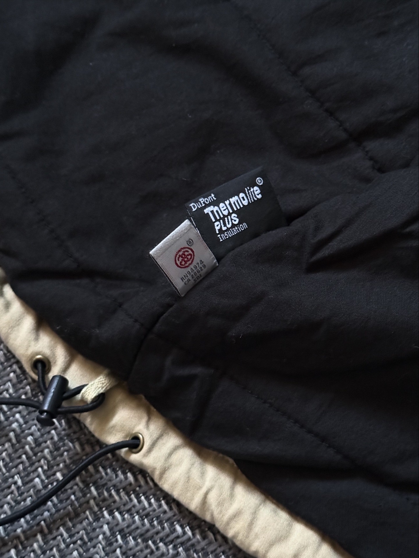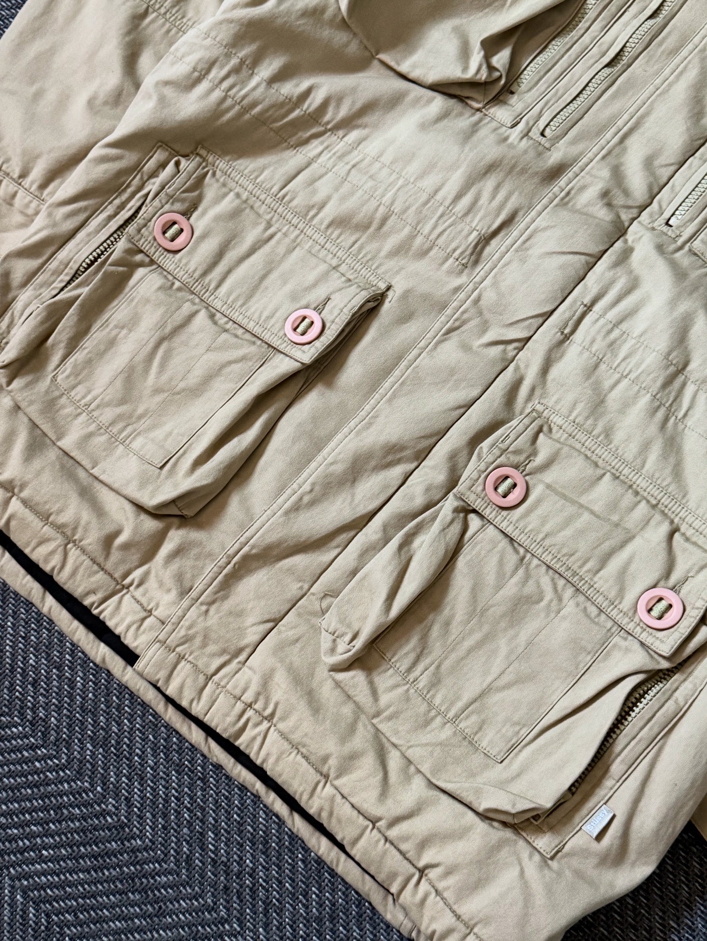 겉감은 100% 코튼 소재로 제작되어 내추럴한 질감을 가지고 있으며, 내부에는 DuPont Thermolite Plus 충전재가 사용되어 가볍지만 뛰어난 보온성을 제공합니다. 후드 일체형 디자인과 4포켓 디테일, 그리고 스냅 버튼 여밈 구조는 밀리터리 필드 자켓에서 영감을 받은 실용적인 구성을 보여줍니다. 베이지 컬러의 바디에 핑크 버튼 포인트가 더해져스투시 특유의 감각적인 컬러 밸런스를 완성하고 있습니다. 전체적으로 형태의 틀어짐 없이 좋은 상태를 유지하고 있으며, 사진상 보이듯 미세한 오염이 존재하지만, 전반적으로 양호한 제품입니다.